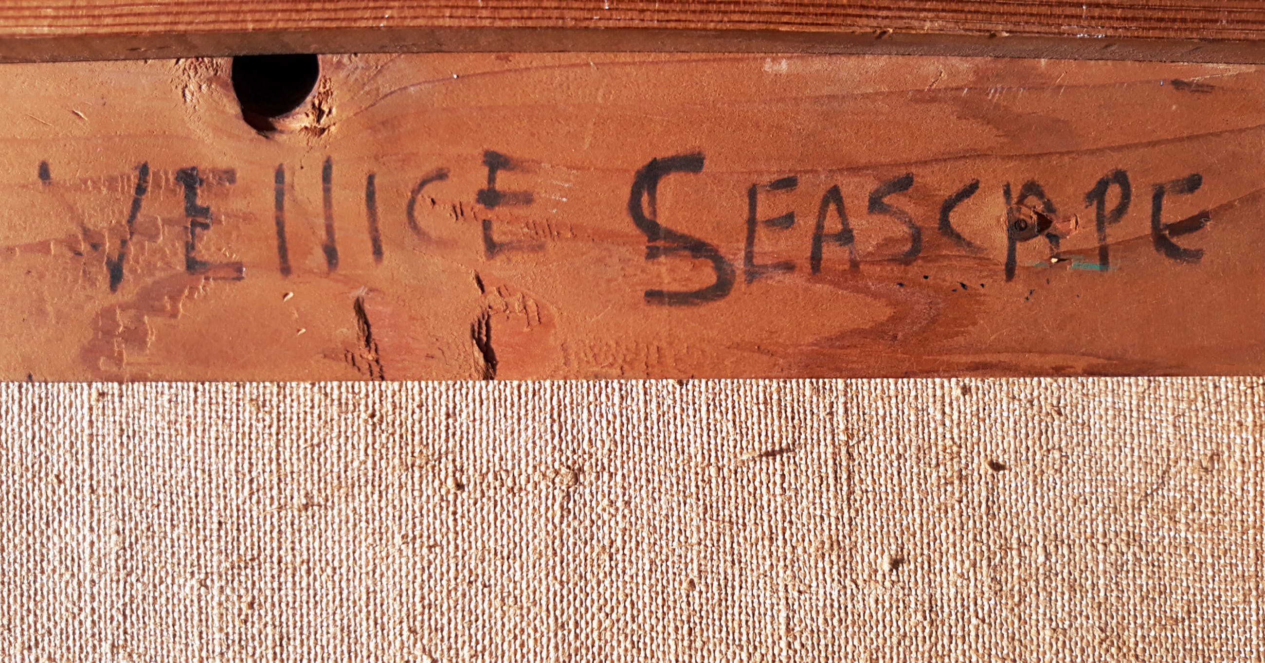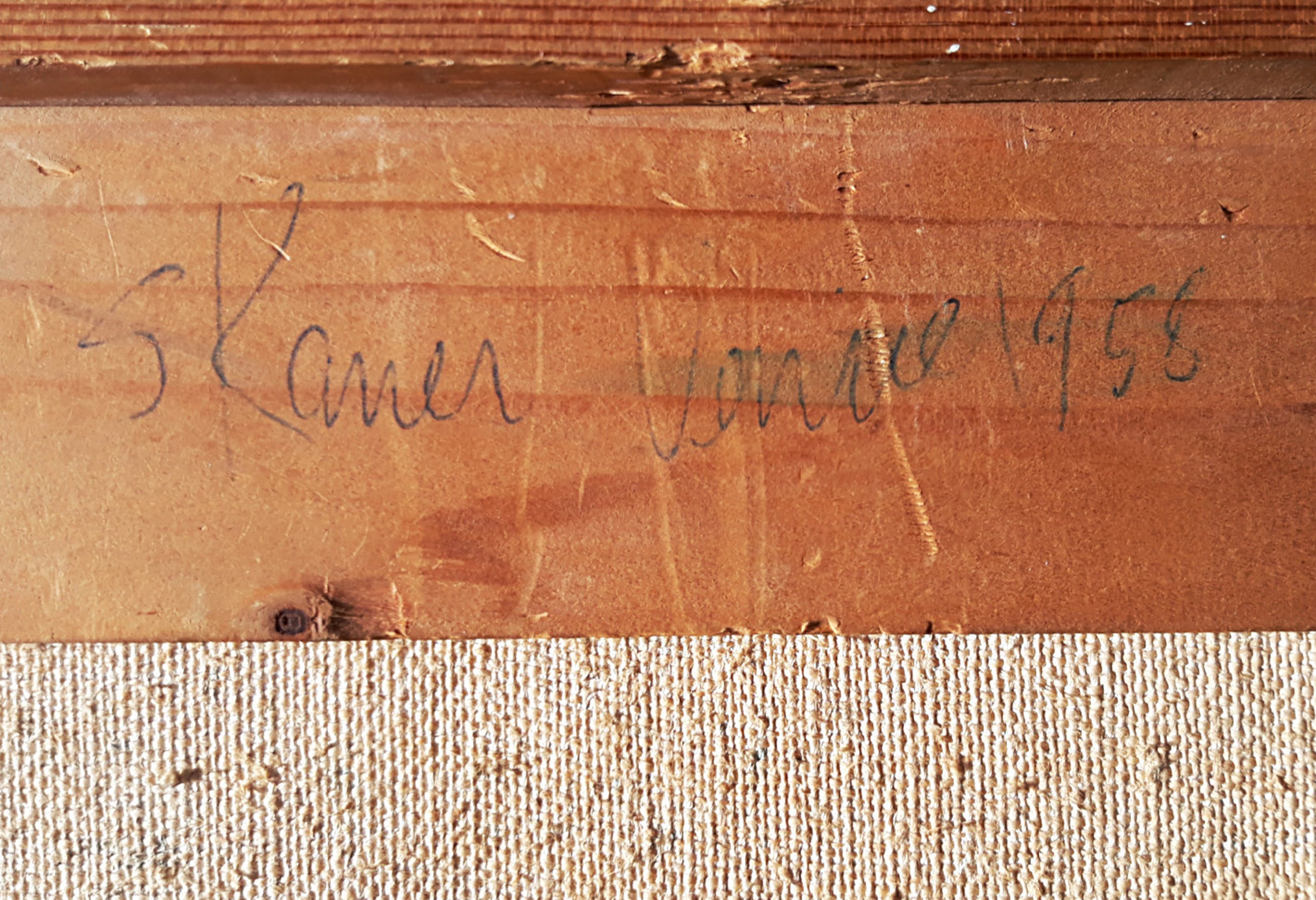 Intrigerend zeegezicht van de Deens-Amerikaanse kunstenaar Sam Kaner, die bevriend was met veel CoBrA kunstenaars. Olieverf op doek, gesigneerd en gesitueerd rechtsonder (“Venice 58”), in verso getiteld en nogmaals gesigneerd, gesitueerd en gedateerd. In eenvoudig houten lijstje, alles in zeer goede conditie.