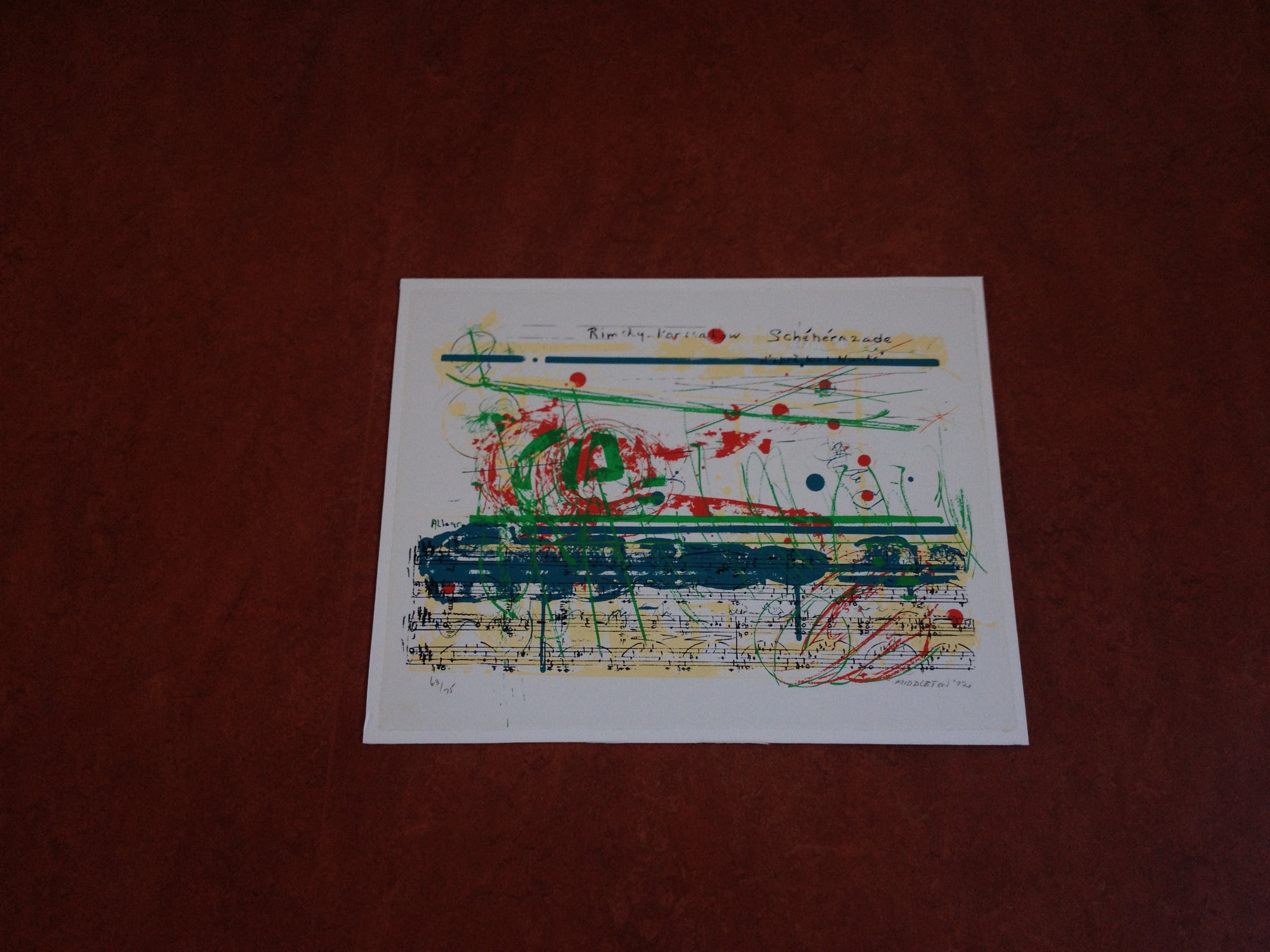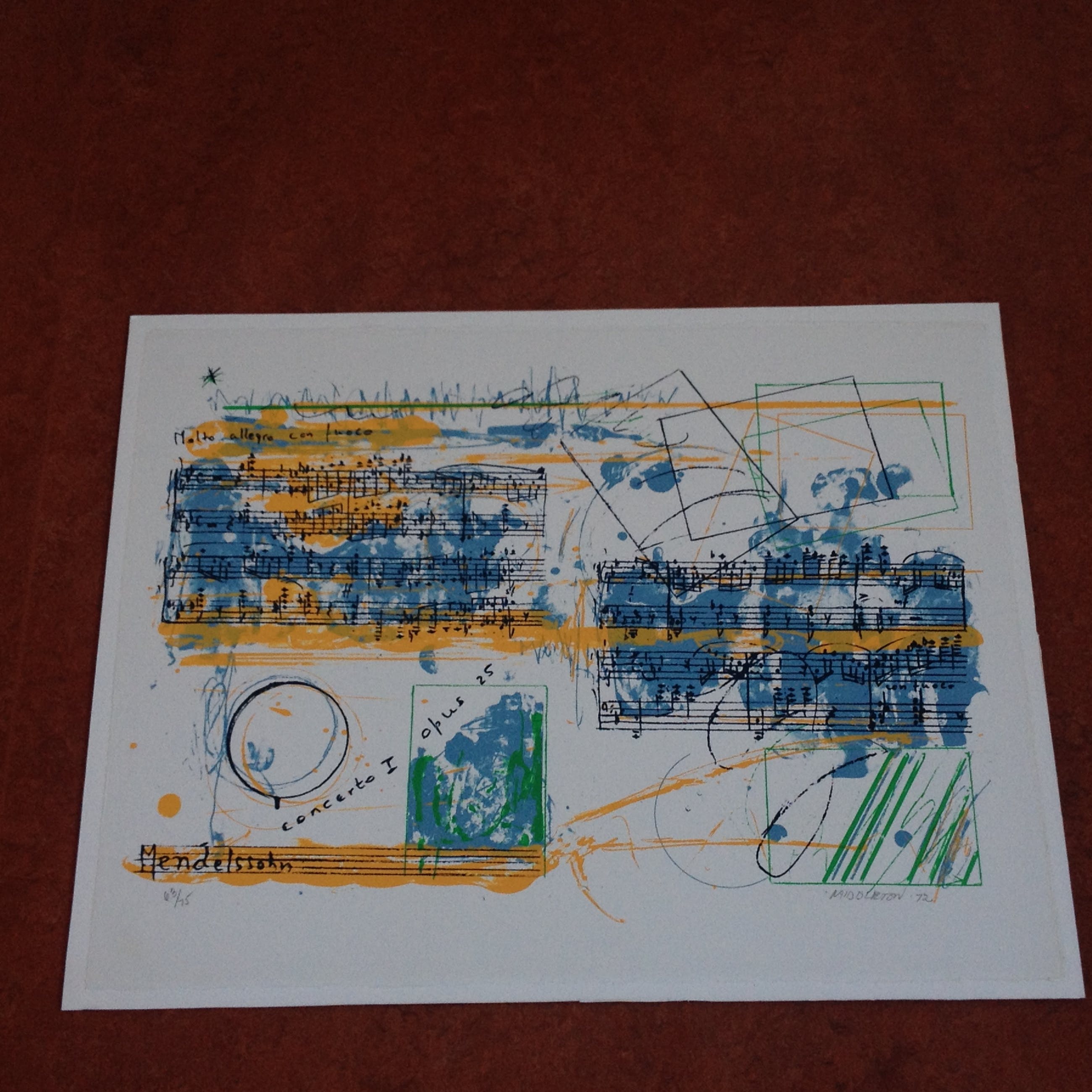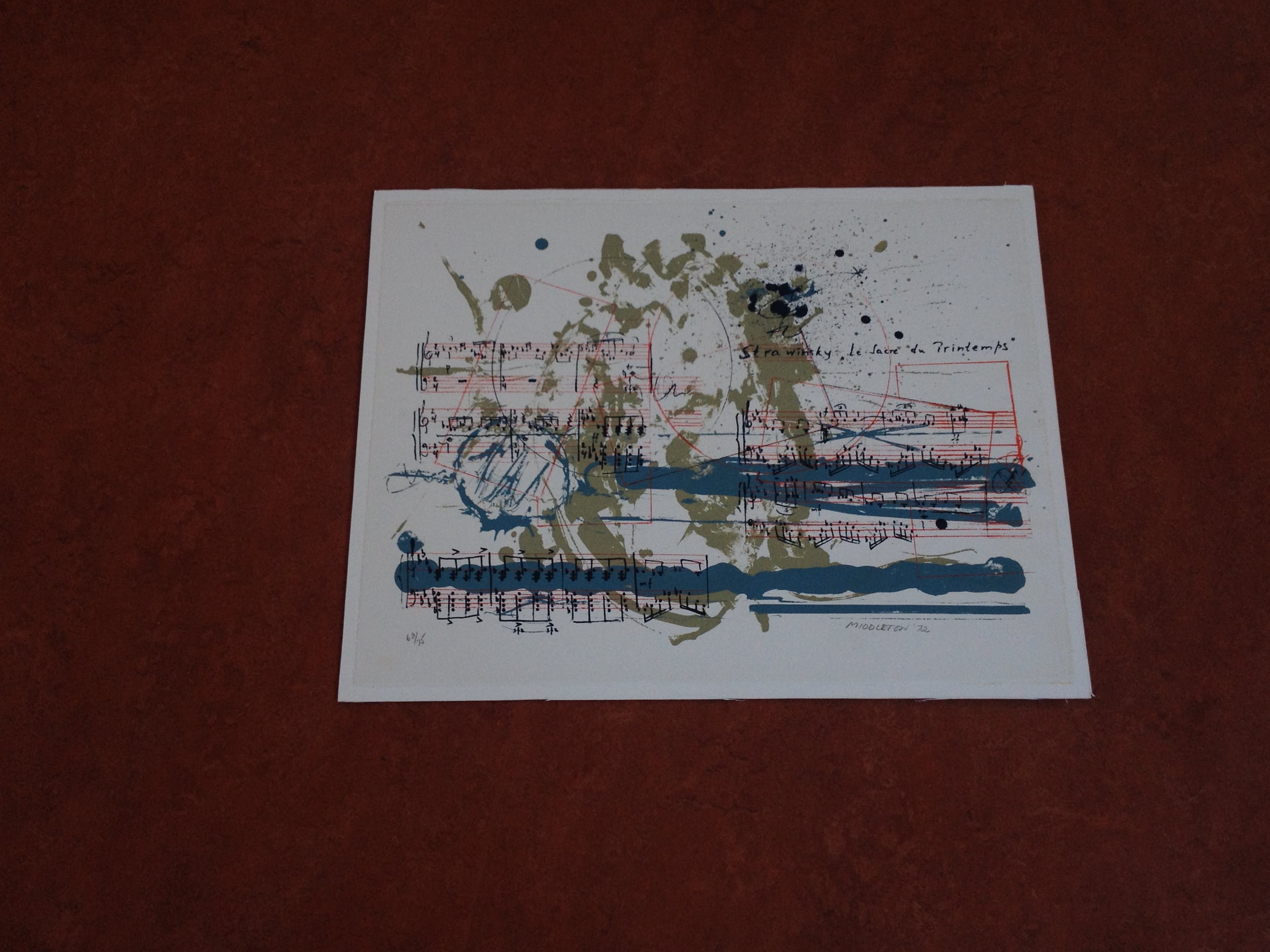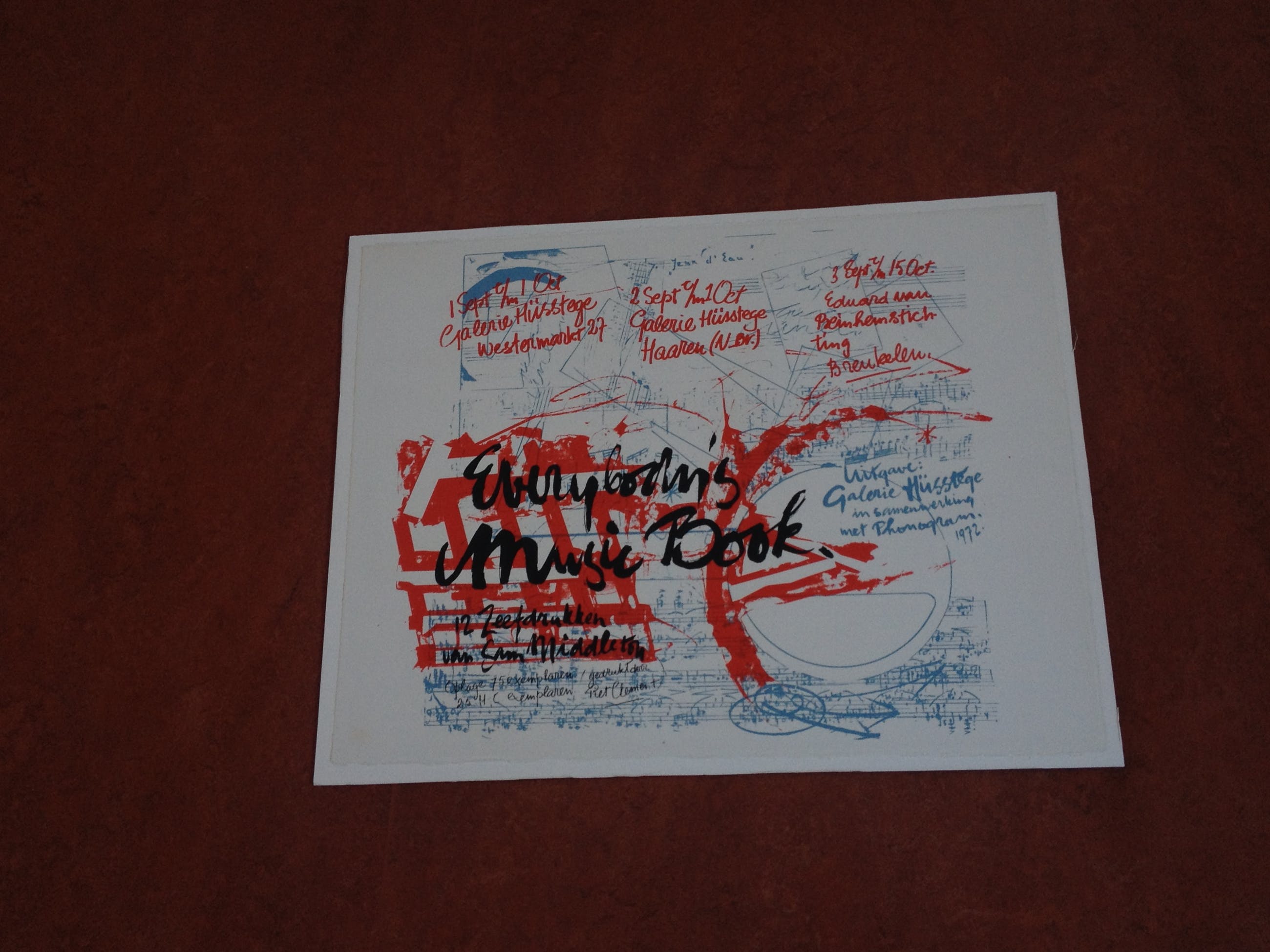 Compleet en zeer mooi portfolio van Sam Middleton. Nummer 63/75. Portfolio bestaat uit 12 zeefdrukken van componisten, aangevuld met voorblad en voorwoord van Edo de Waart (totaal 14). Uitgave door Galerie Hüsstege in samenwerking met Phonogram. Gedrukt door Piet Clement.Randen zeefdruk aangebracht op wit board (totaal 53,5 cm x 68 cm). Zeefdrukken uit deze portfolio worden vaak apart aangeboden.Zwaar pakket met zeefdrukken + board (circa 10 kg).
