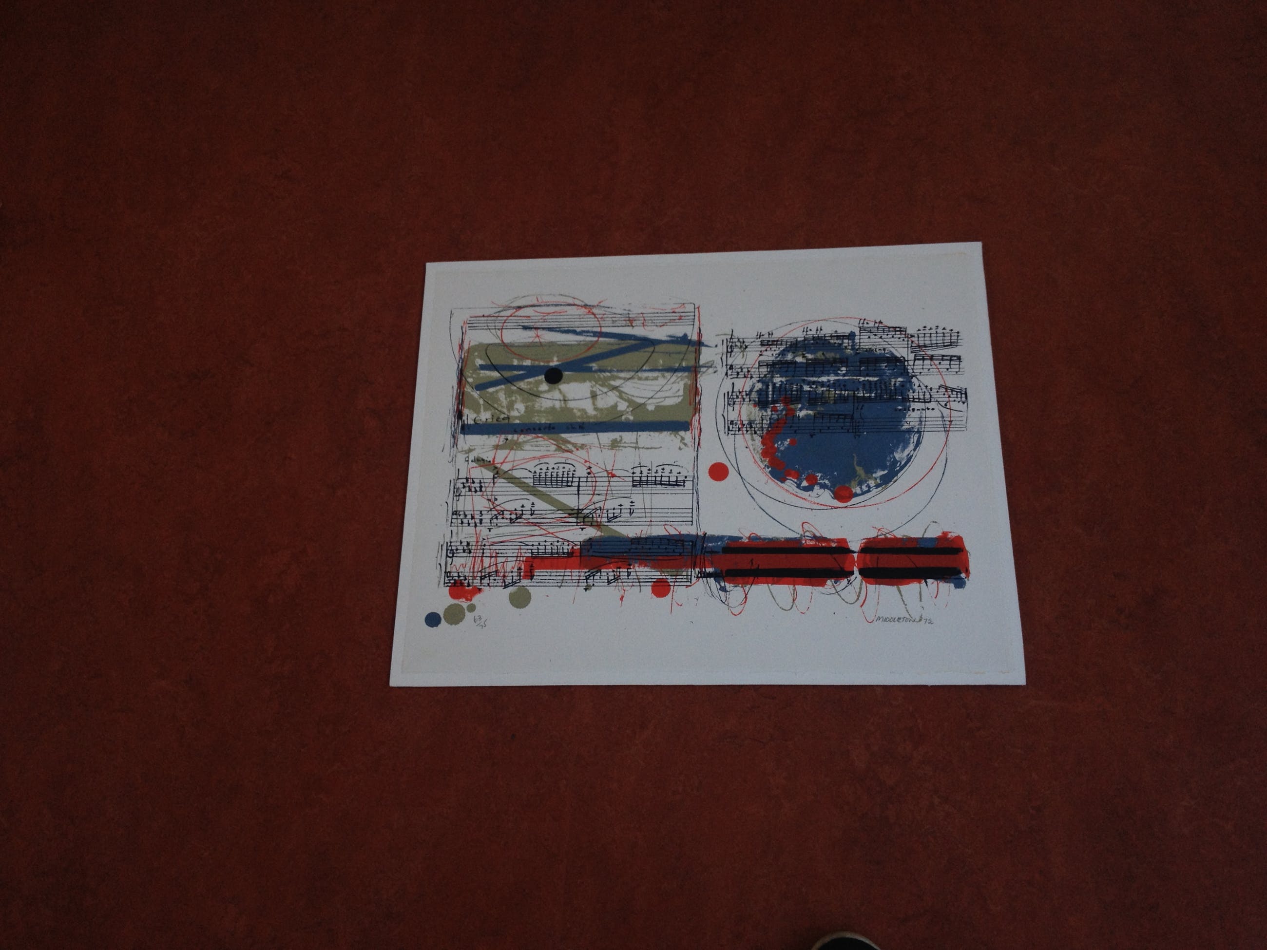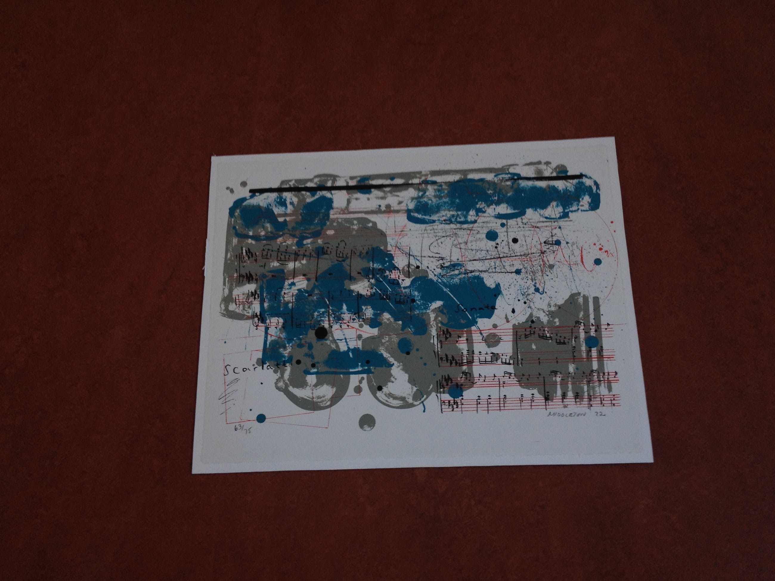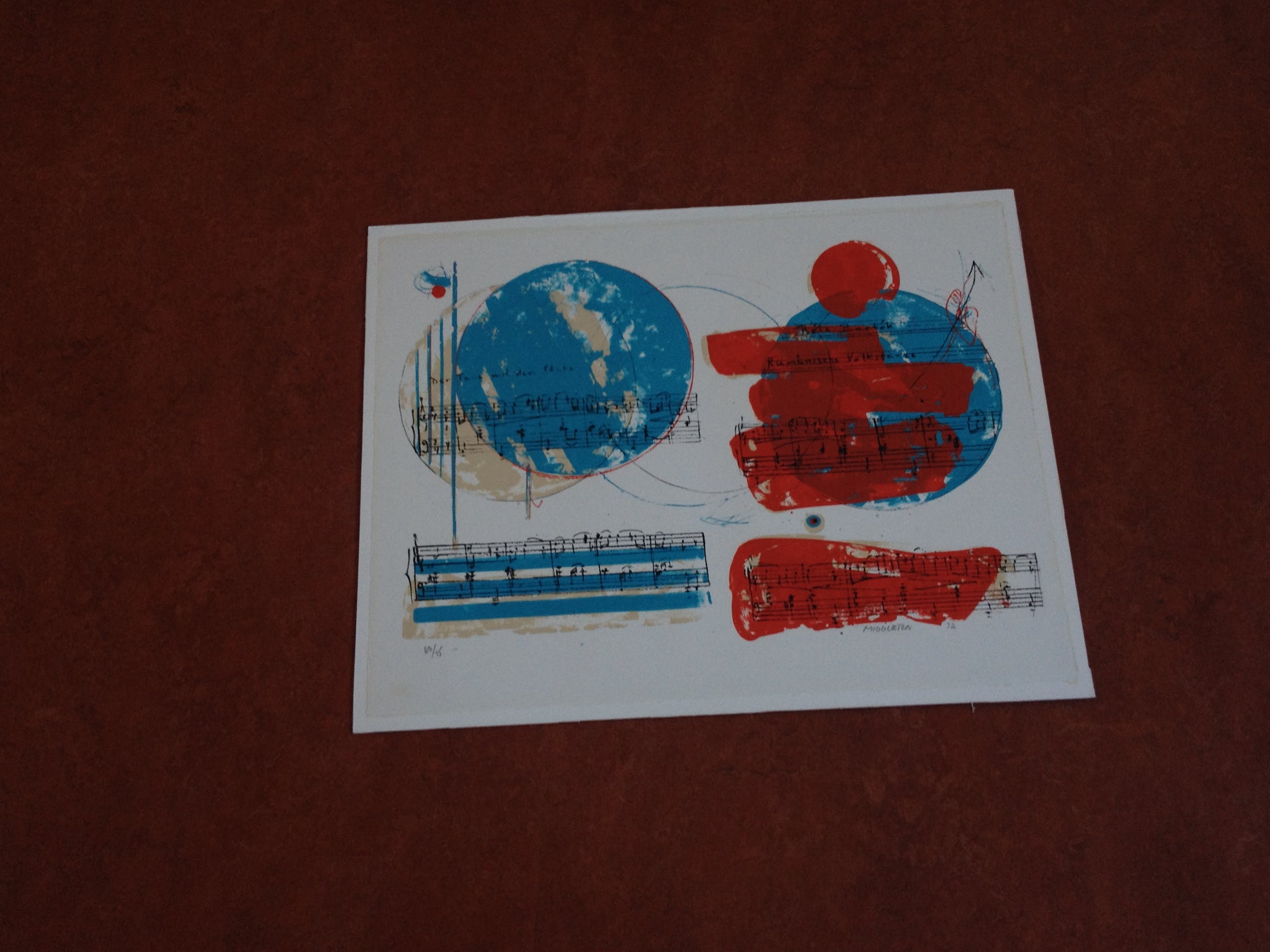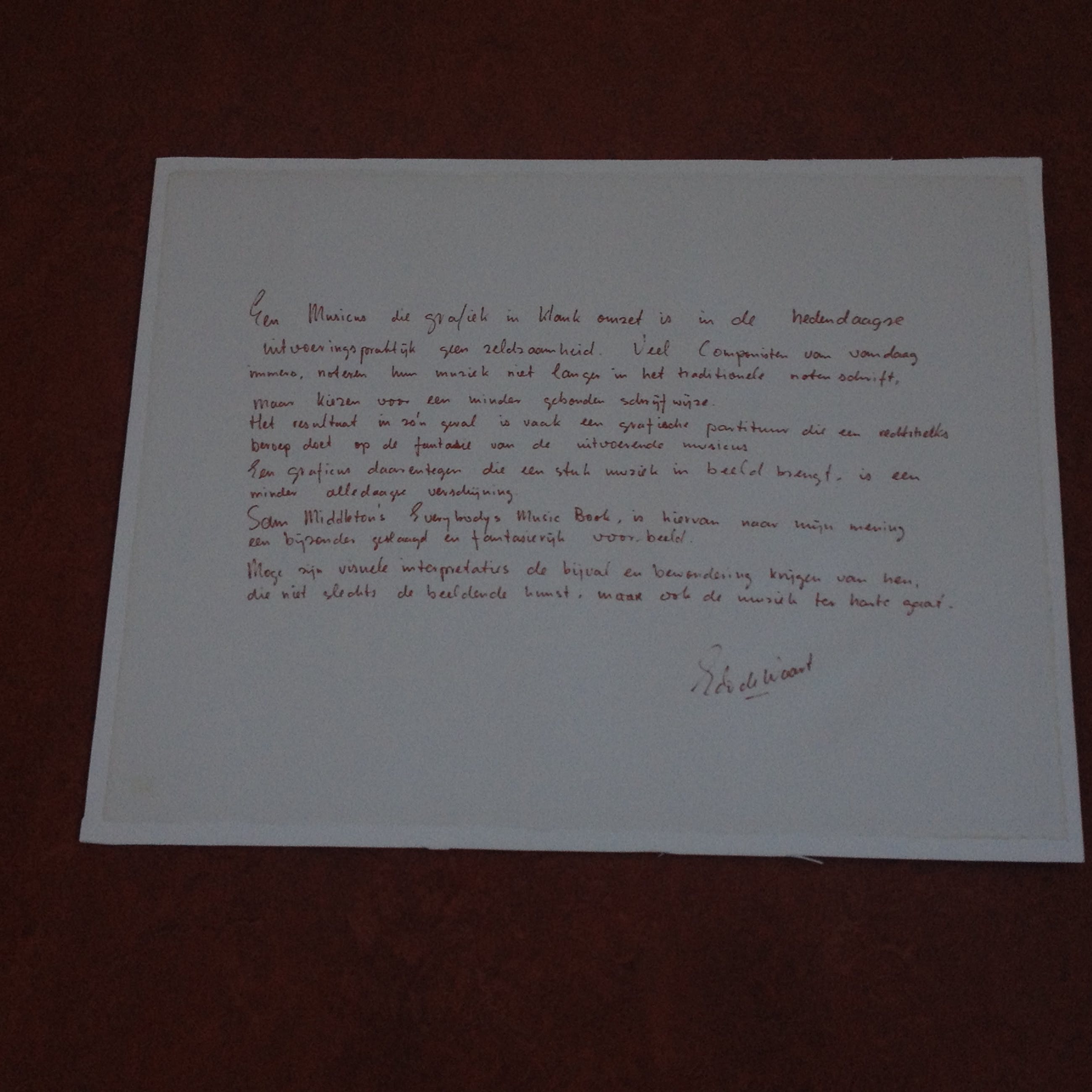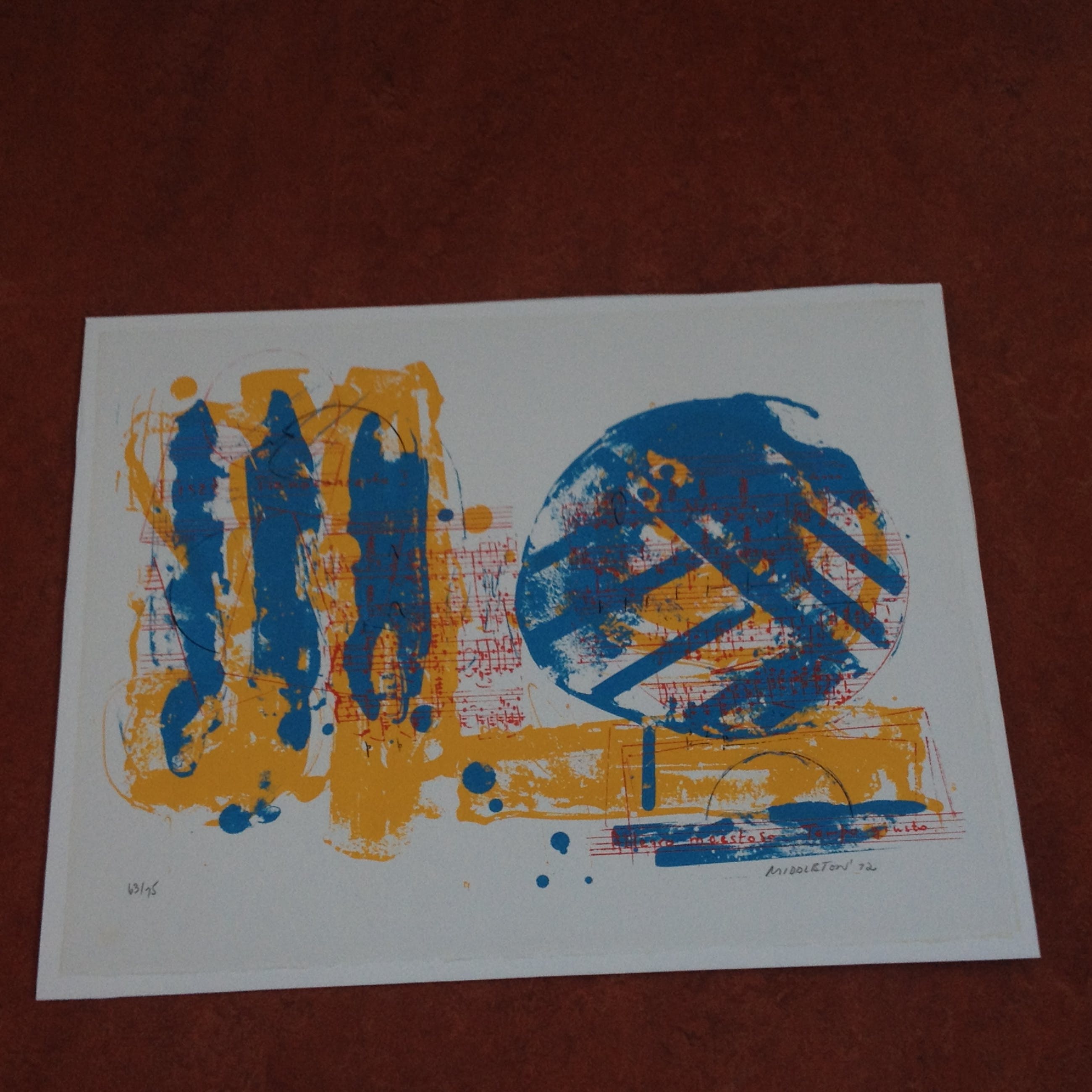 Compleet en zeer mooi portfolio van Sam Middleton. Nummer 63/75. Portfolio bestaat uit 12 zeefdrukken van componisten, aangevuld met voorblad en voorwoord van Edo de Waart (totaal 14). Uitgave door Galerie Hüsstege in samenwerking met Phonogram. Gedrukt door Piet Clement.Randen zeefdruk aangebracht op wit board (totaal 53,5 cm x 68 cm). Zeefdrukken uit deze portfolio worden vaak apart aangeboden.Zwaar pakket met zeefdrukken + board (circa 10 kg).