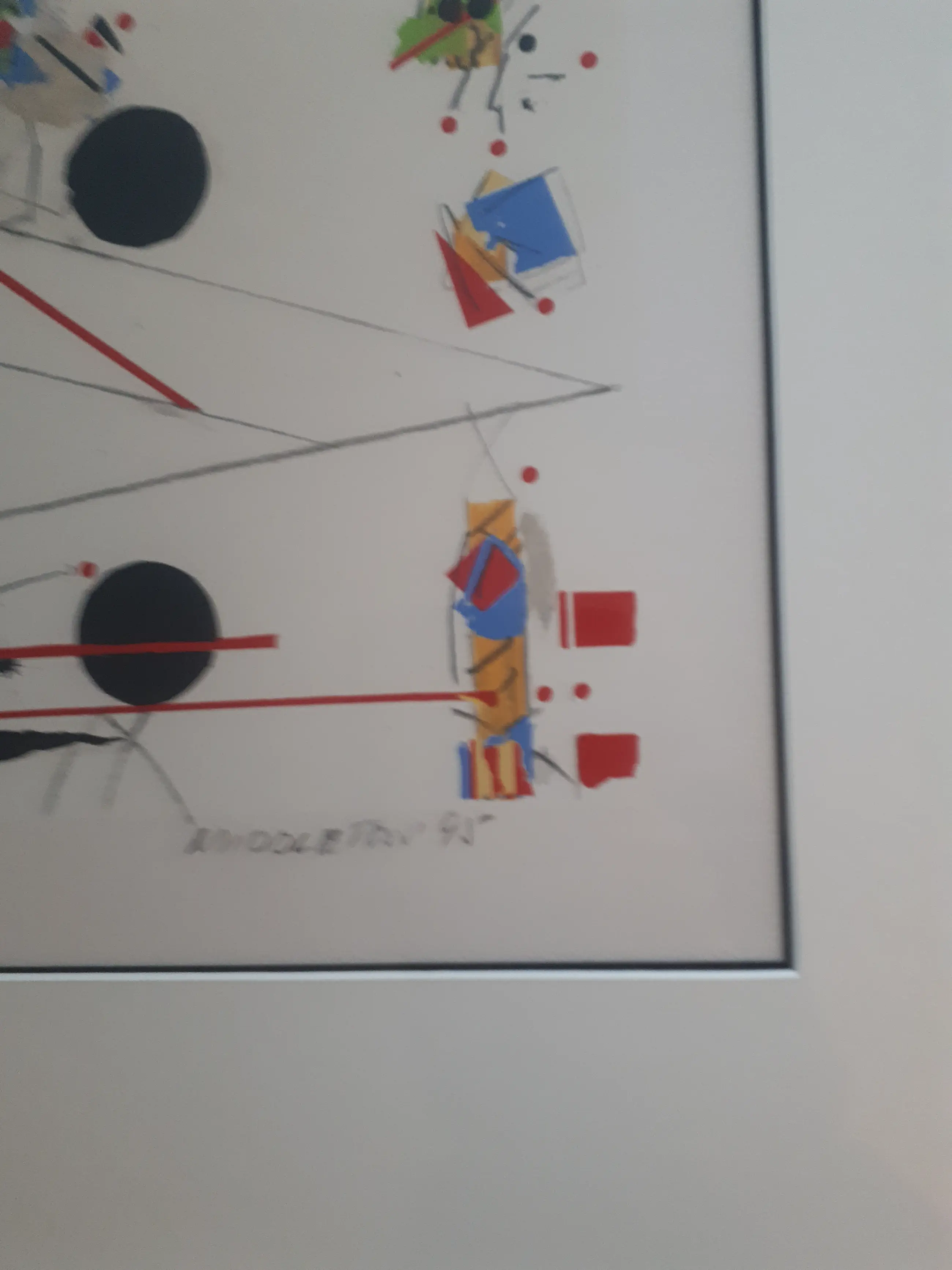 Deze (groot formaat, fraai professioneel ingelijste) zeefdruk is exemplarisch voor het latere werk van Sam Middleton: Jazz muziek vertaald in abstracte beelden. Afkomstig uit New York, vestigde Sam Middleton (1927-2015) zich in de jaren zestig in Nederland. Hij legde zich aanvankelijk toe op collage (mixed media) technieken. Dat is ook nog zichtbaar in de zeefdrukken van later datum, zoals deze 'Drum Sticks' uit 1995 . Het betreft hier een epreuve d'artiste. Door de kunstenaar rechtsonder handgesigneerd.