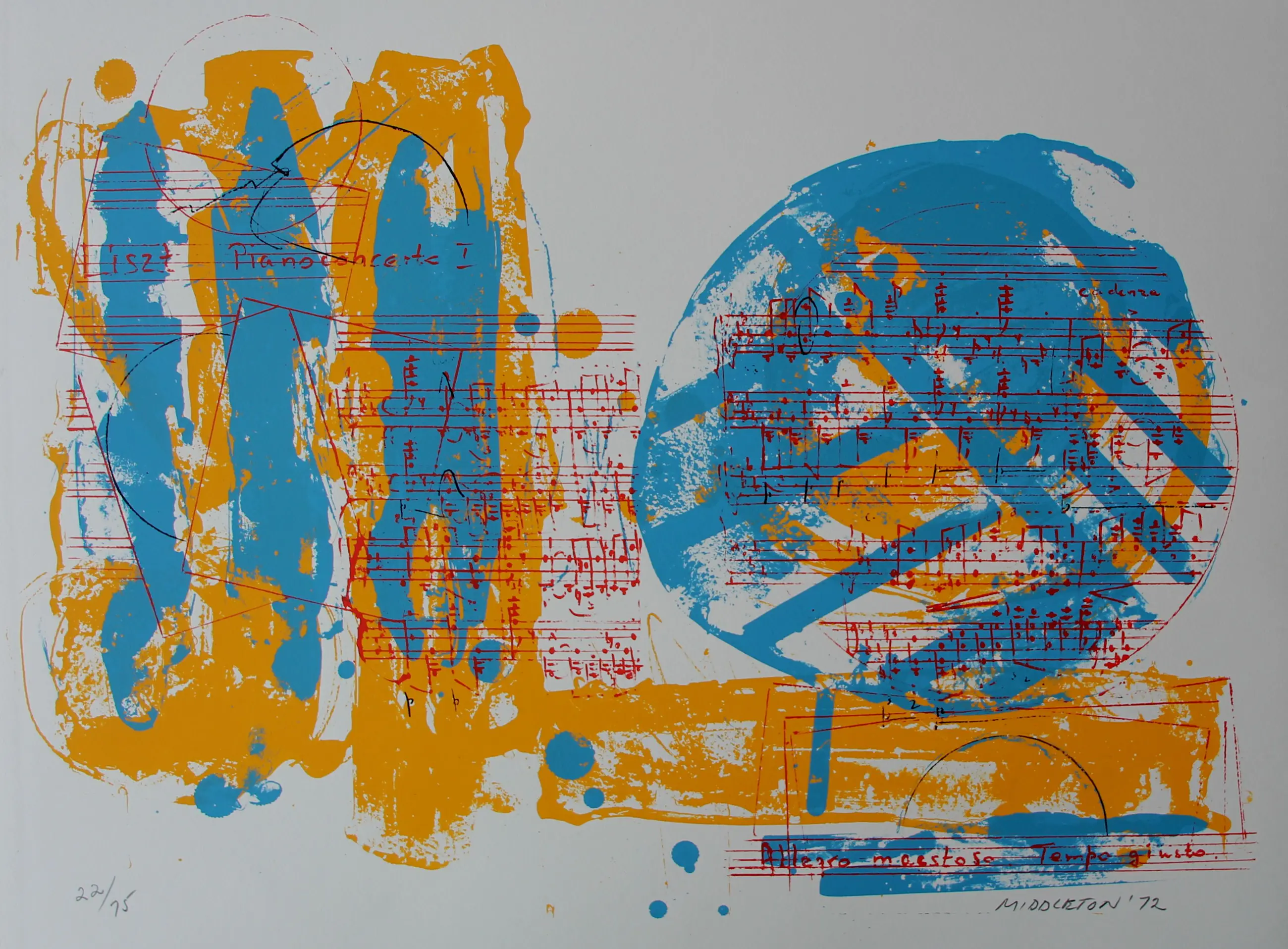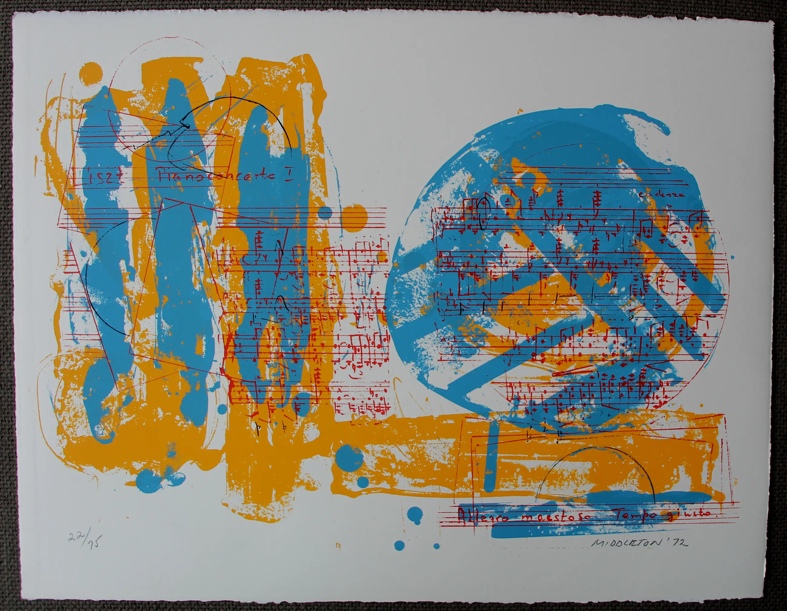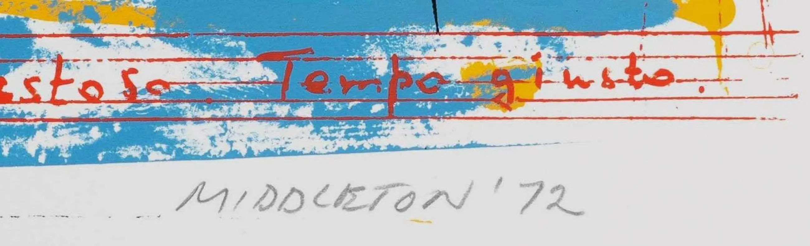 Kleuren litho van Sam Middleton. Het werk komt uit de 'Concerto serie'. Jaar: 1972. Oplage: 22/75. Afmetingen blad: H61 x b76cm. Afmetingen voorstelling: H47 x b65cm. Het werk is rechts onderaan, met potlood, gesigneerd door de kunstenaar. De authenticiteit van het aangeboden werk wordt volledig gegarandeerd. Een certificaat van echtheid kan, op aanvraag, worden gemaild.