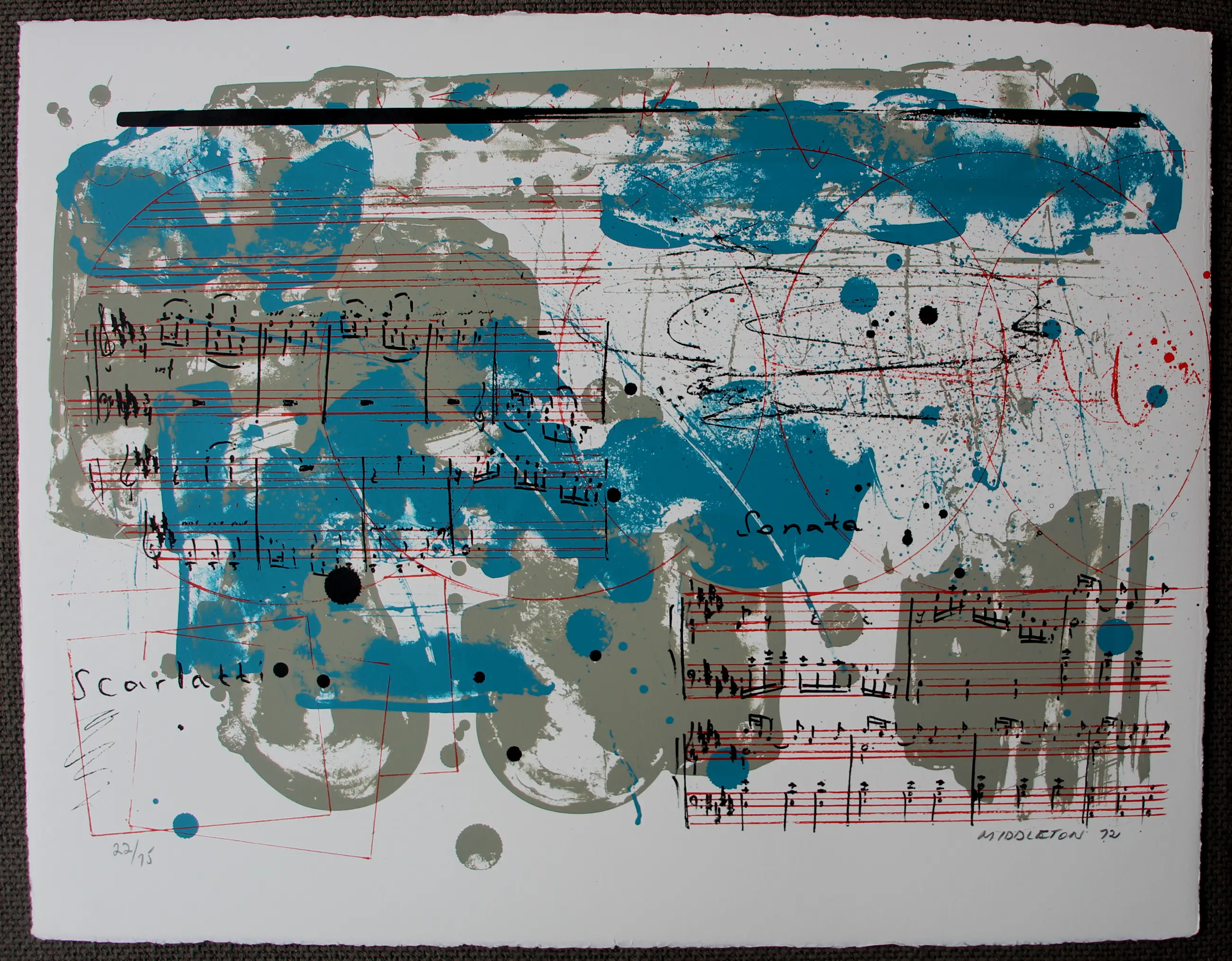 Kleuren litho van Sam Middleton. Het werk komt uit de 'Concerto serie'. Jaar: 1972. Oplage: 22/75. Afmetingen blad: H61 x b76cm. Afmetingen voorstelling: H47 x b65cm. Het werk is rechts onderaan, met potlood, gesigneerd door de kunstenaar. De authenticiteit van het aangeboden werk wordt volledig gegarandeerd. Een certificaat van echtheid kan, op aanvraag, worden gemaild.