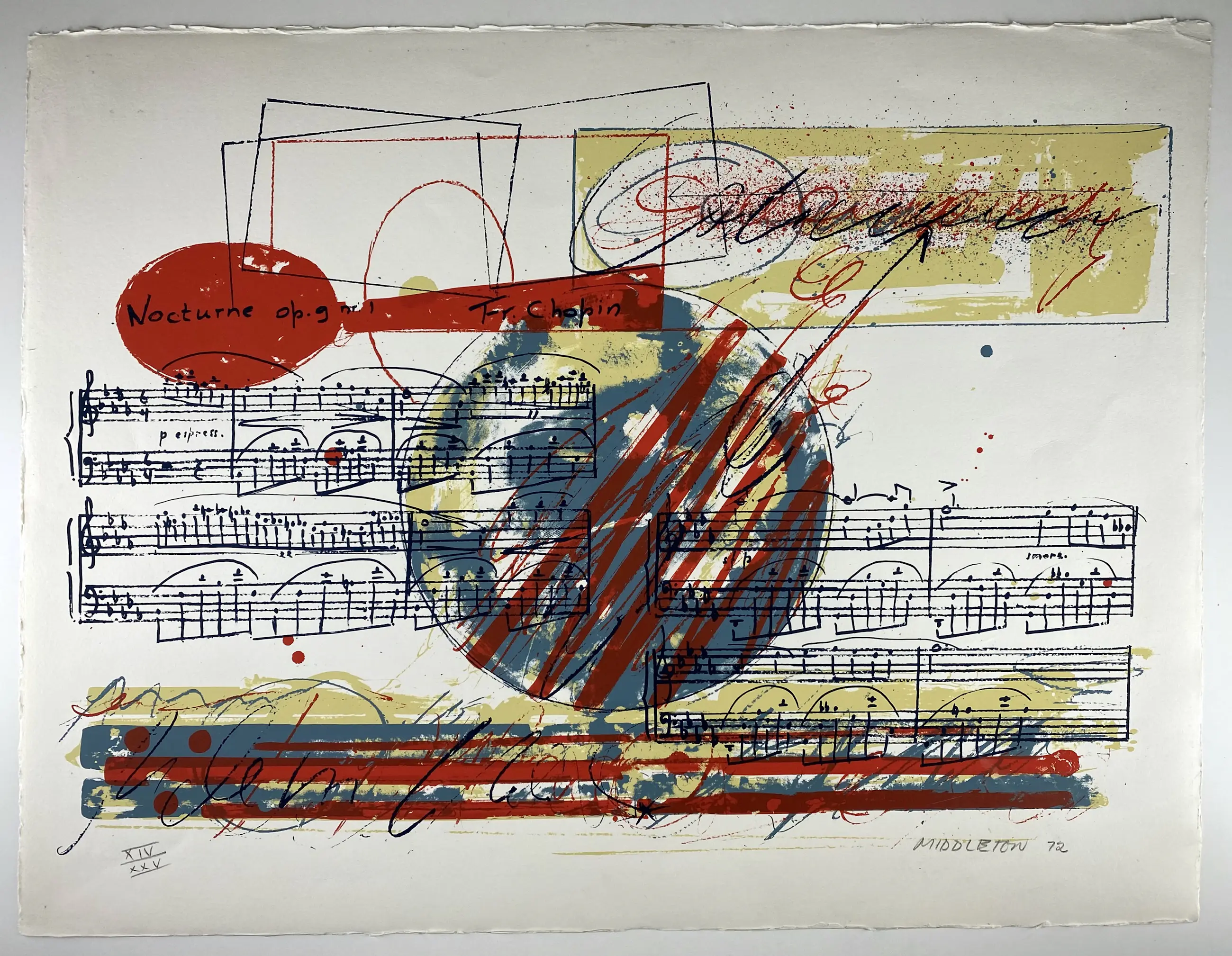 In zijn werk was muziek, o.a. jazz, het belangrijkste leidmotief van Sam Middleton. In zijn collages verwerkte hij partituren en foto’s die verwijzen naar dit favoriete thema. De collages hebben een uitgewogen esthetische en ritmische balans. Deze balans ontstaat door een subtiel toegepaste vlakverdeling met in veel gevallen een transparant geschilderde achtergrond en de toevoeging van een grote variëteit aan grafische elementen, potloodlijnen en stippen.