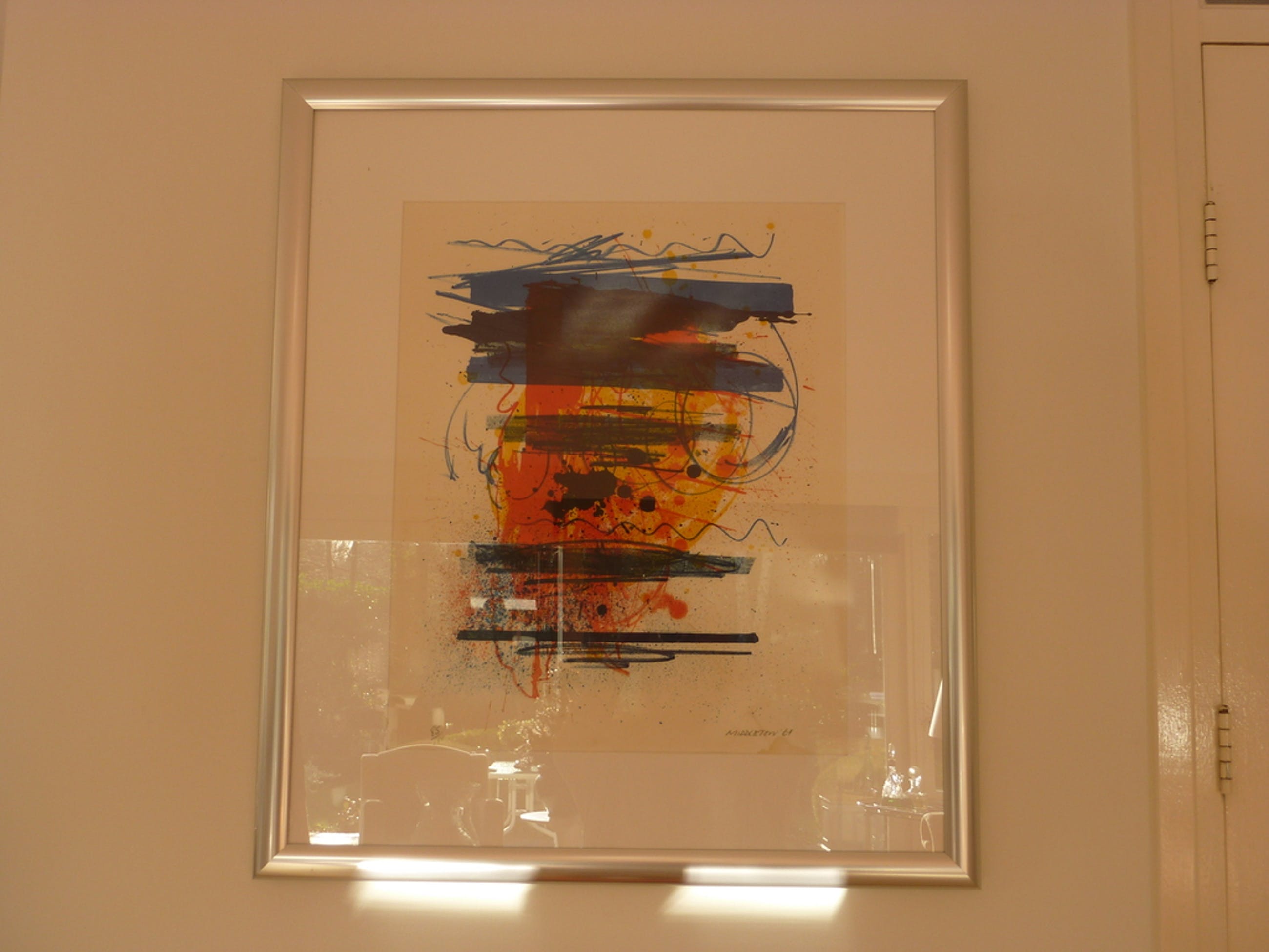 Boeiend abstract expressionistisch werk uit 1969 van de in Amsterdam/Schagen werkende kunstenaar/schilder Sam Middleton. Gesigneerde litho.Beeldformaat 44 x 54 cm. In metallic lijst 69 x 78 cm.