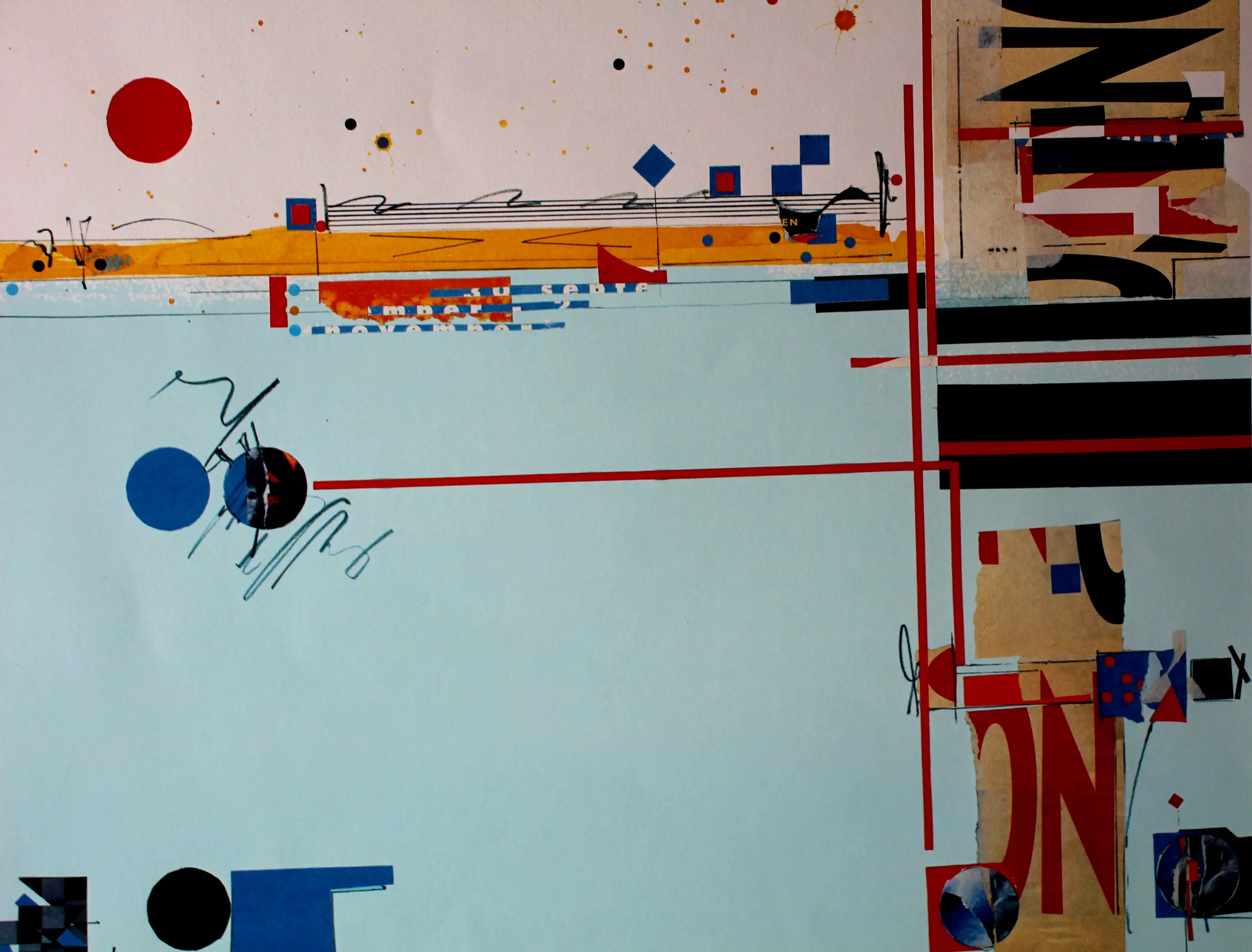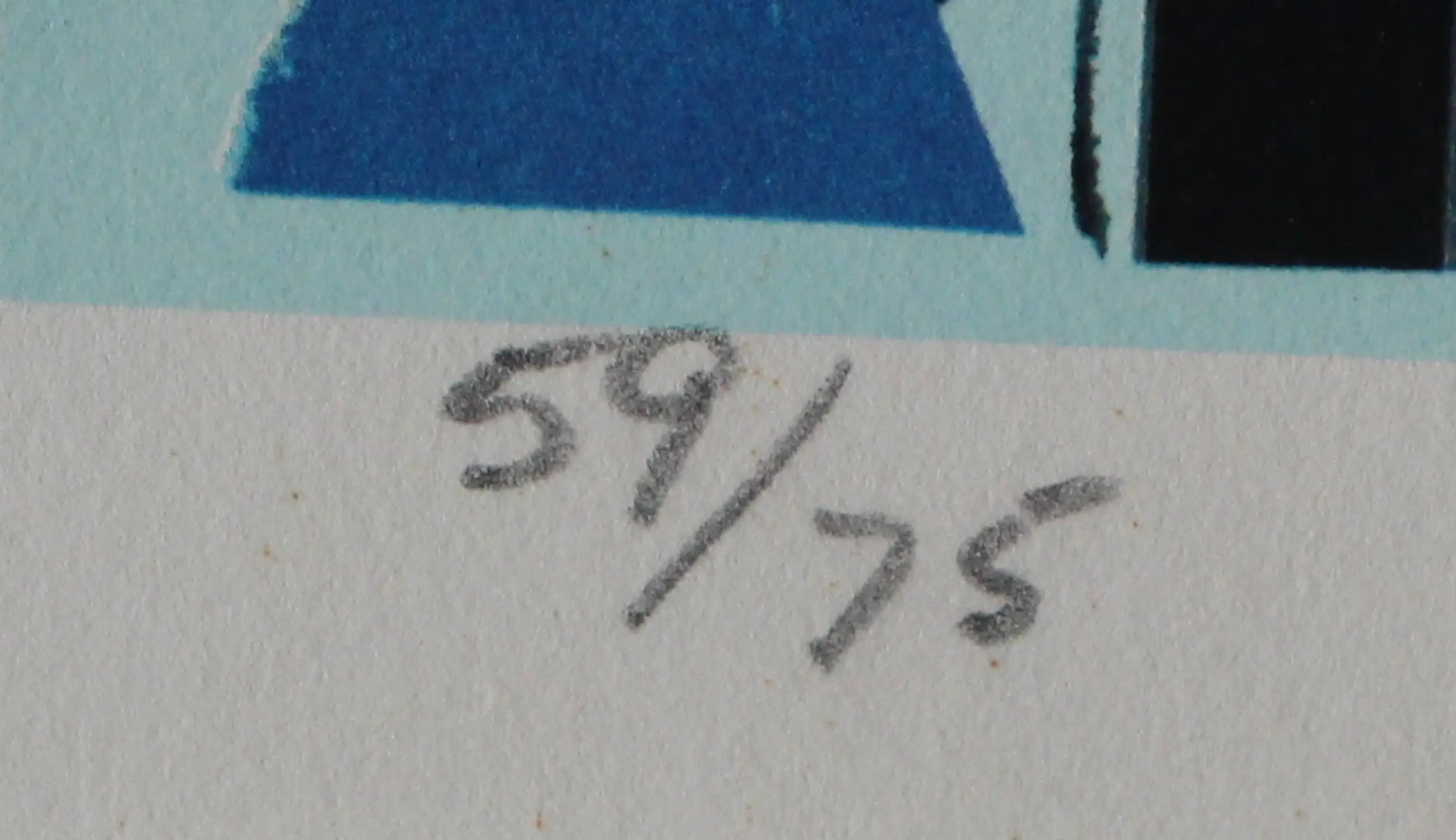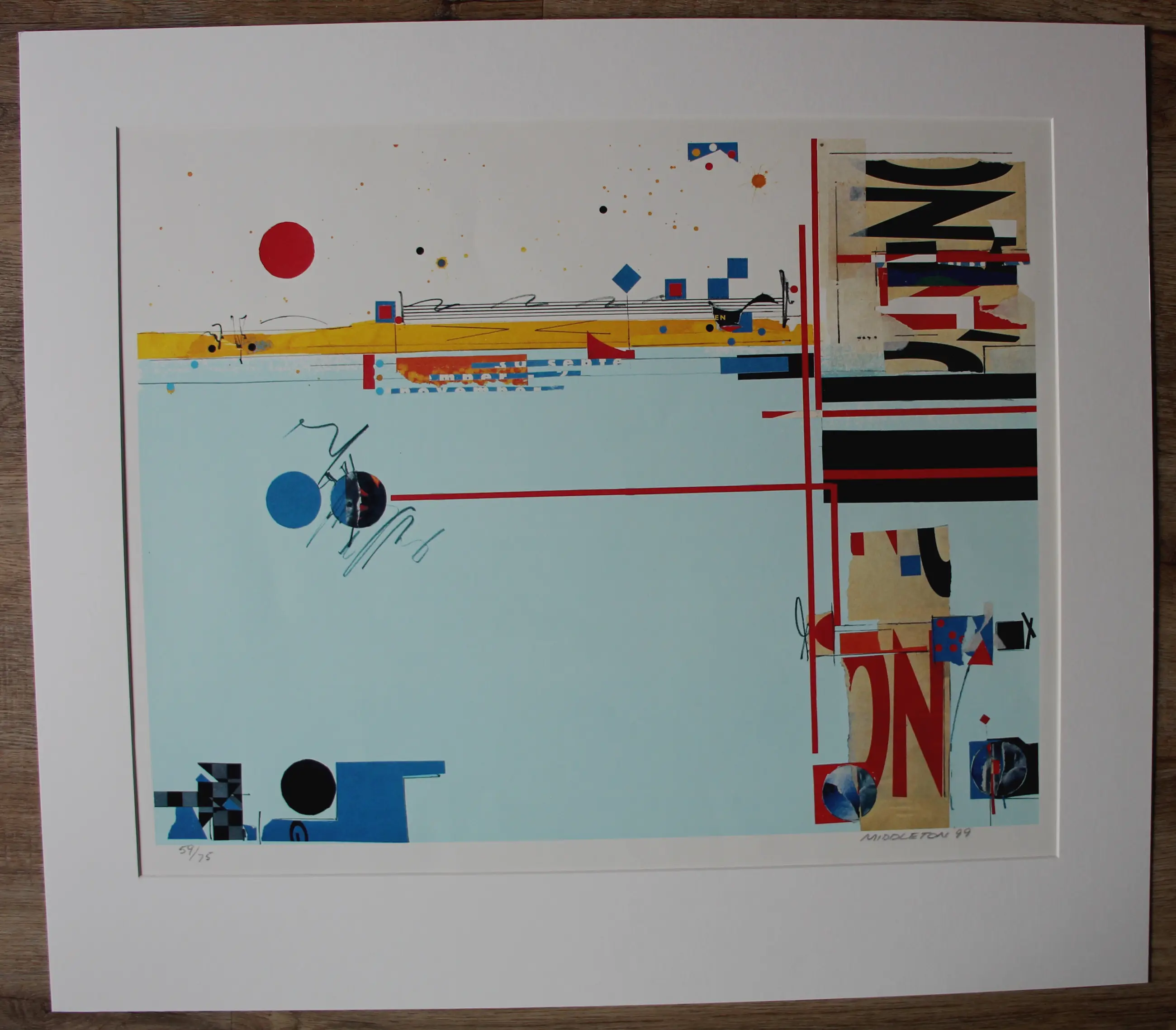 Zeefdruk van Sam Middleton. Titel: Blues manuscript. Jaar: 1999. Oplage: 59/75. Afmetingen incl passe-partout: H70 x b80cm. Afmetingen voorstelling: H49 x b64cm. Het werk is rechts onderaan, met potlood, gesigneerd door de kunstenaar. De authenticiteit van het aangeboden werk wordt volledig gegarandeerd. Een certificaat van echtheid kan, op aanvraag, worden gemaild.