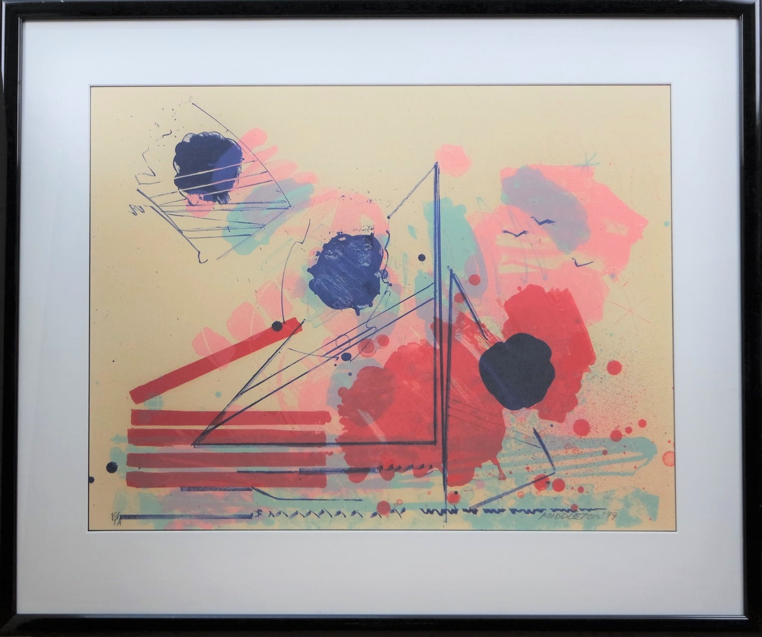 Een prachtig modern kunstwerk ( "zeilboot", zeefdruk op papier, E/A ) van de Amerikaanse kunstenaar Sam Middleton (1927-2015). Het kunstwerk is mooi ingelijst. Gesigneerd rechts onder en gedateerd 1979. De lijst heeft enkele gebruikssporen. Het kunstwerk wordt geleverd met een echtheidscertificaat.