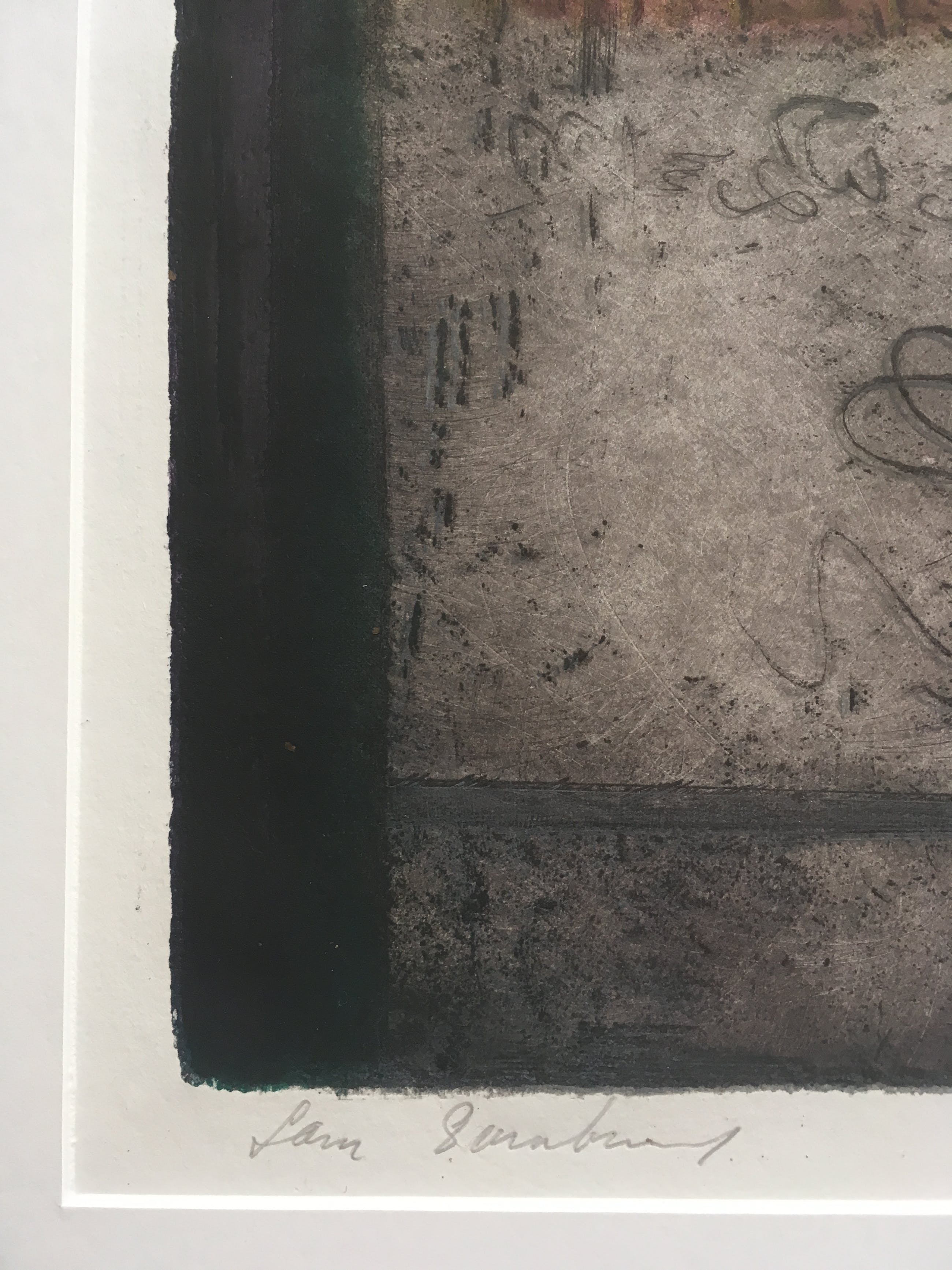 Singnatuur linksonder 'Sam Parabirsingh', titel middenonder 'Curacao Prent', rechtsonder genummerd en gedateerd '2/15 1985', alles in potlood.