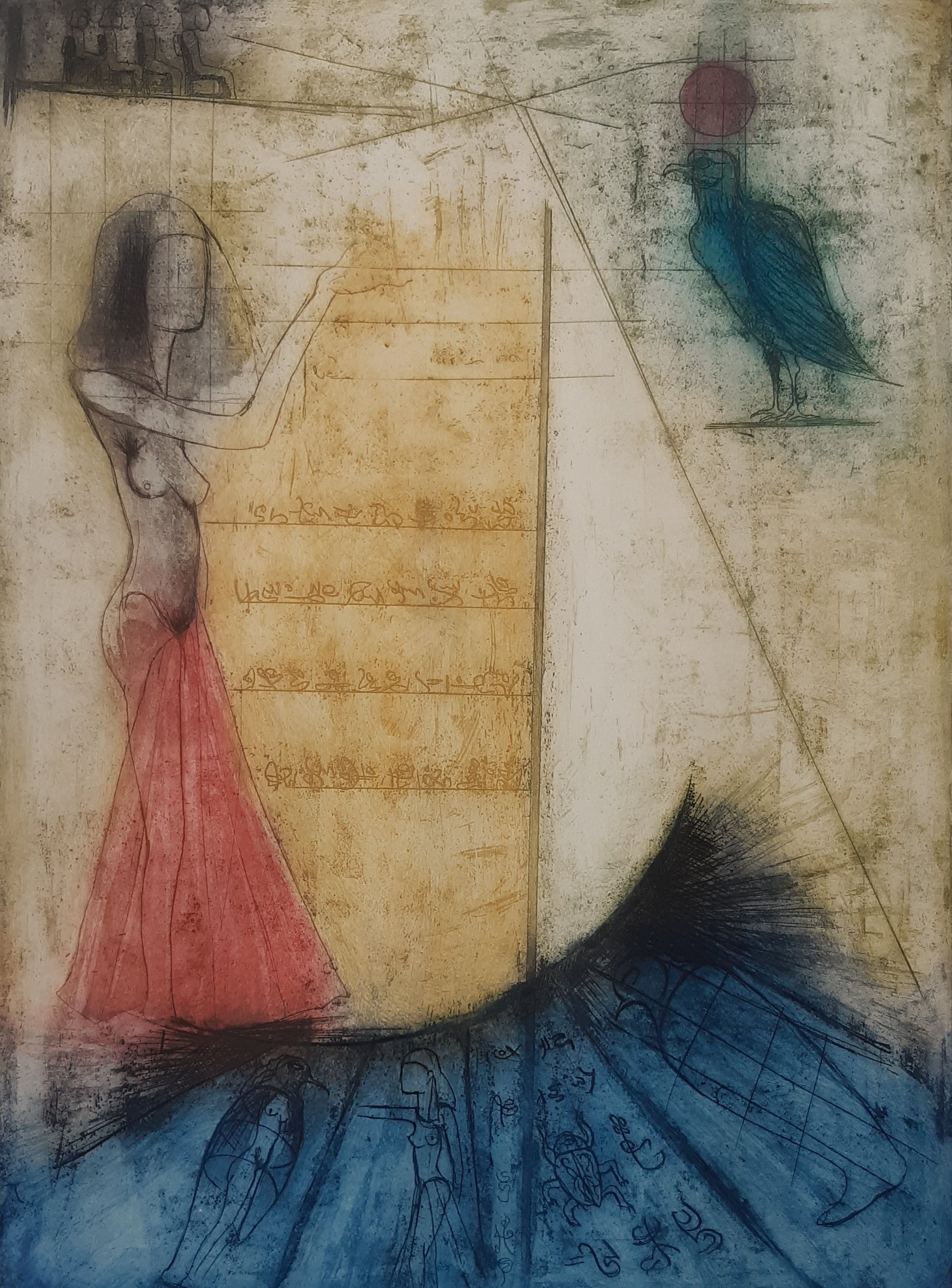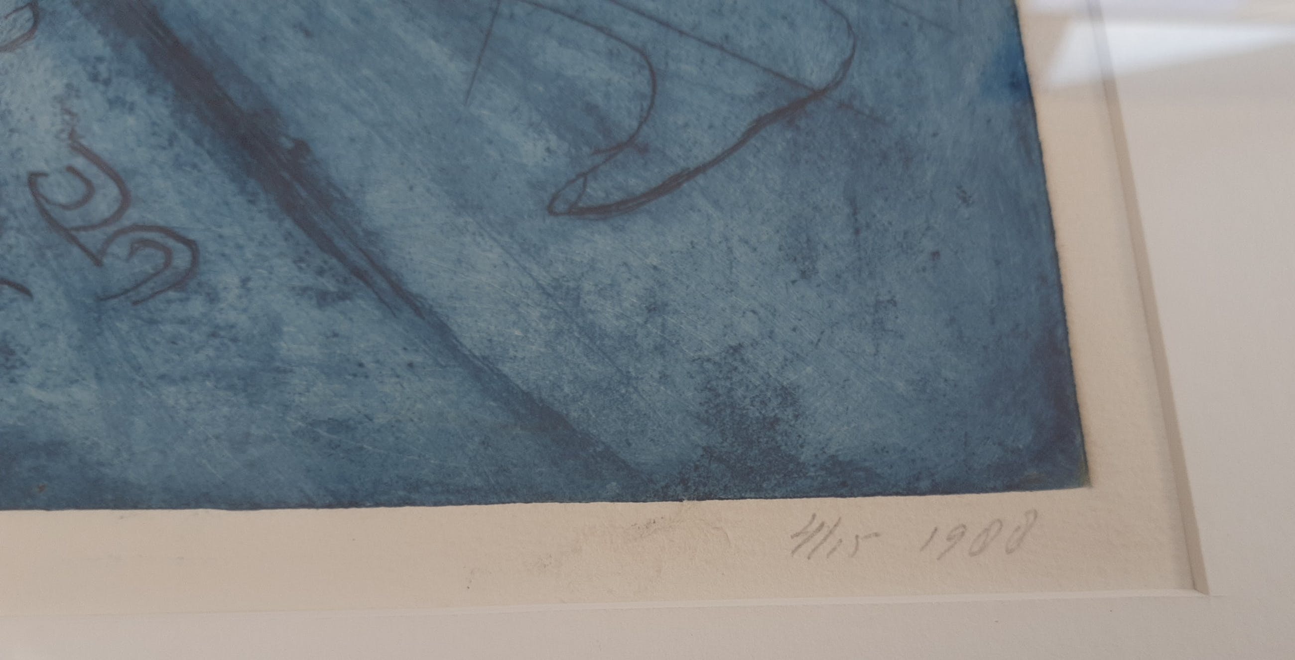 Kleurenets van Sam Parabirsingh. Met potlood gesigneerd, gedateerd 1988 en genummerd 4 / 15. Ingelijst in aluminium lijst, met schade aan glas rechtsonder, zie foto. De conditie van de ets is uitstekend. Op de foto's zijn reflecties zichtbaar. Het werk kan zonder kosten worden opgehaald in Breda. Verzending met Swift Koeriers op kosten van de koper.