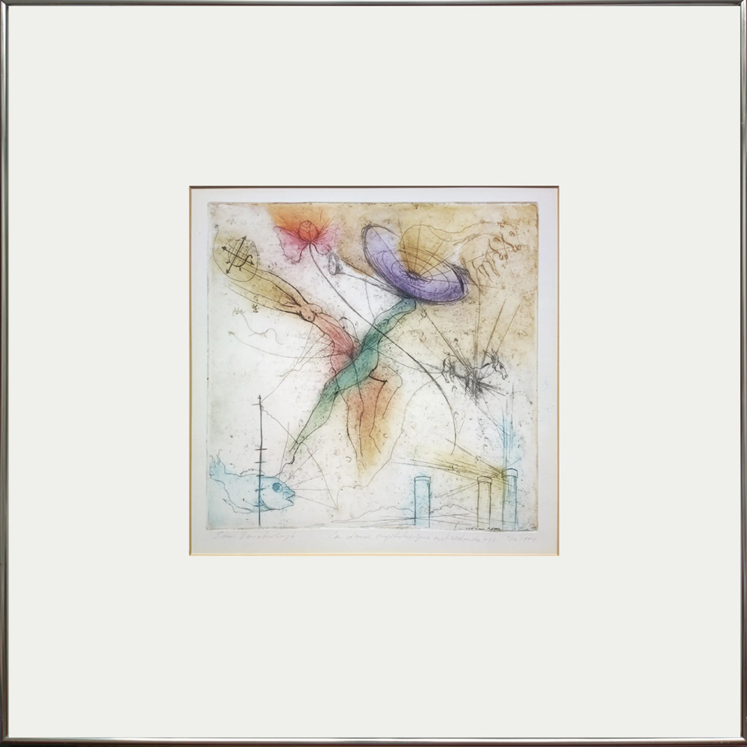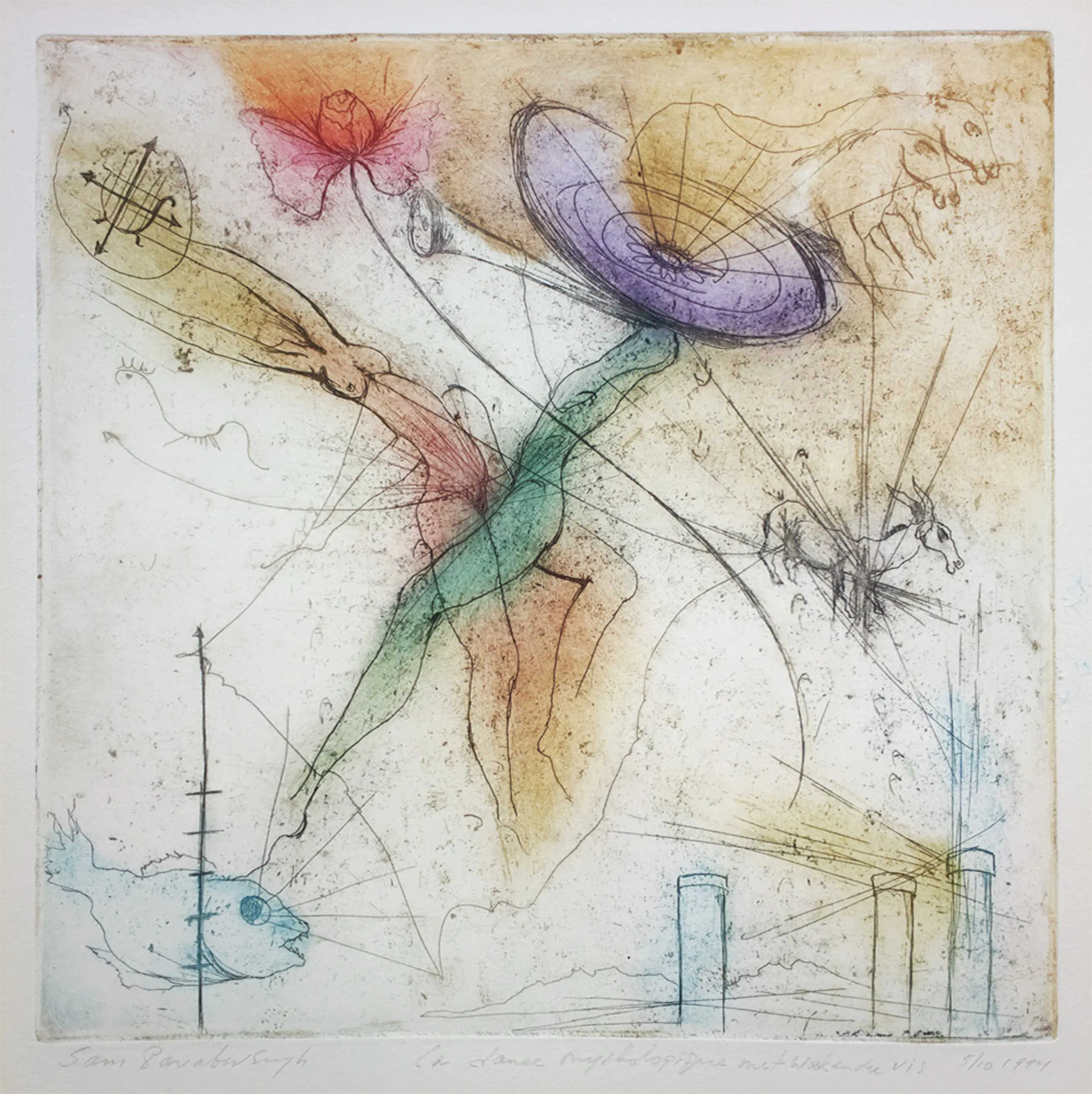 Fantasierijke ets van de kunstenaar Sam Parabirsingh. Het werk is linksonder gesigneerd met 'Sam Parabirsingh' en rechtsonder genummerd '5/10' en gedateerd '1994'.