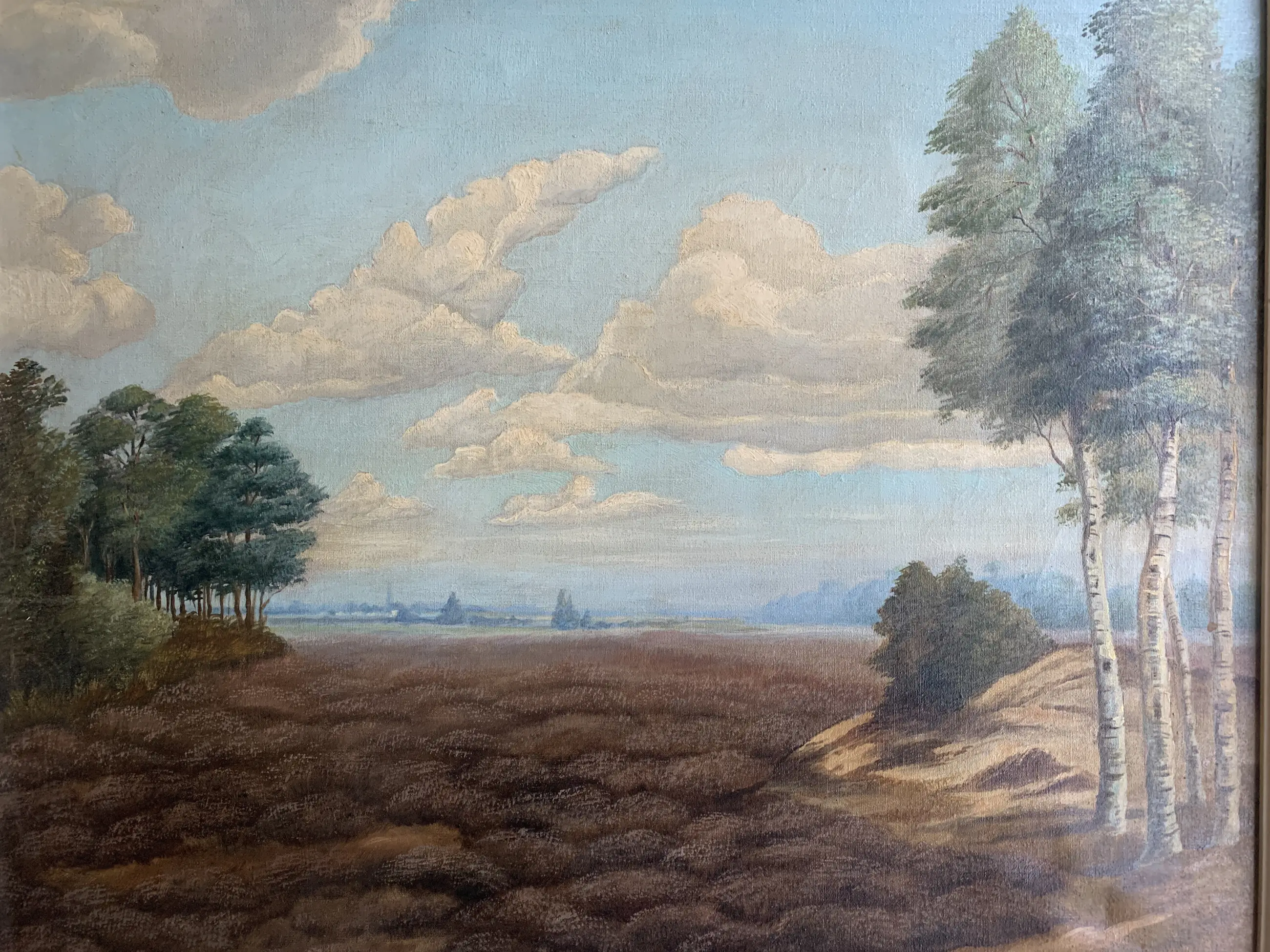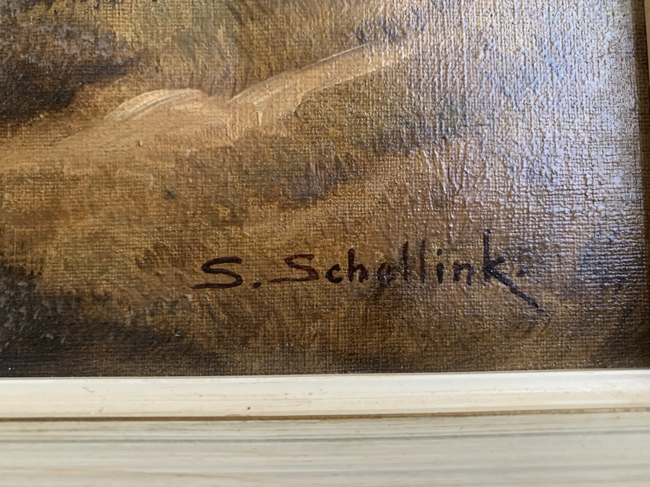 Heide landschap van Sam Schellink. Olieverf op doek. Schilderij verkeert in zeer nette staat. De lijst vertoont wat lichte gebruikssporen.