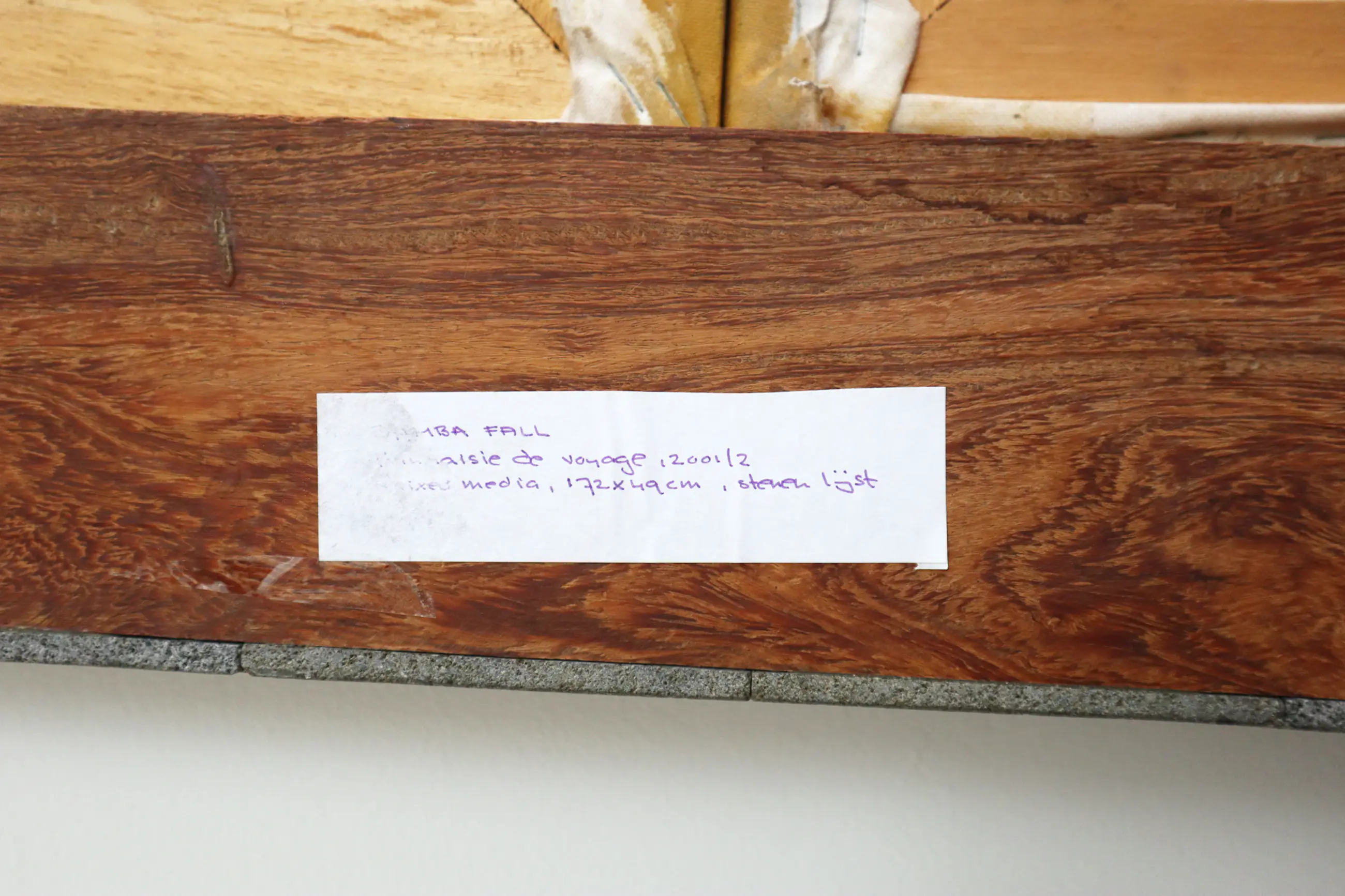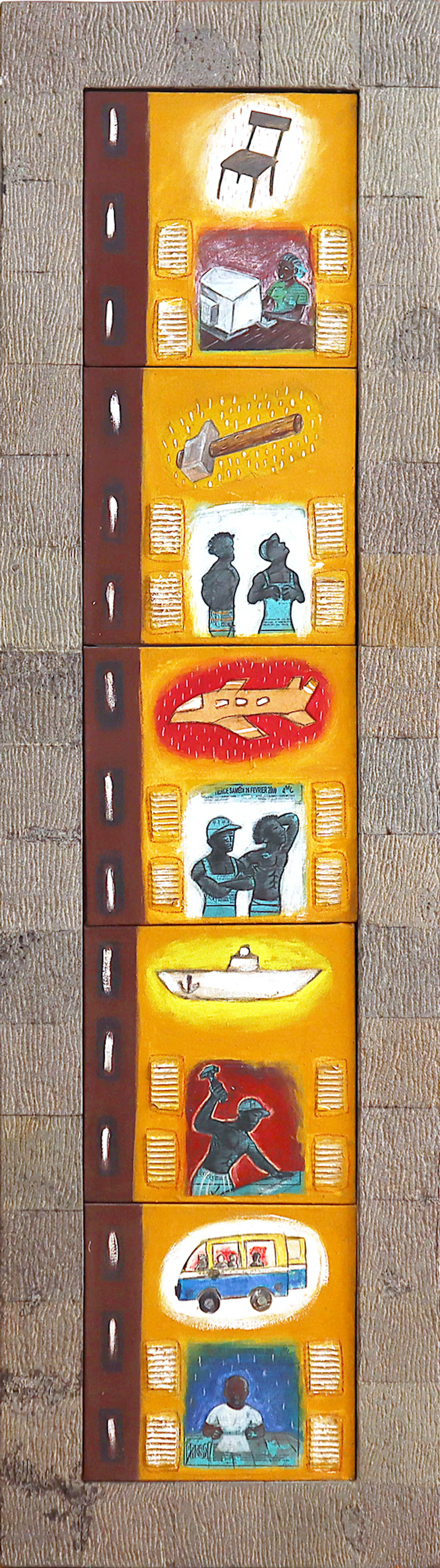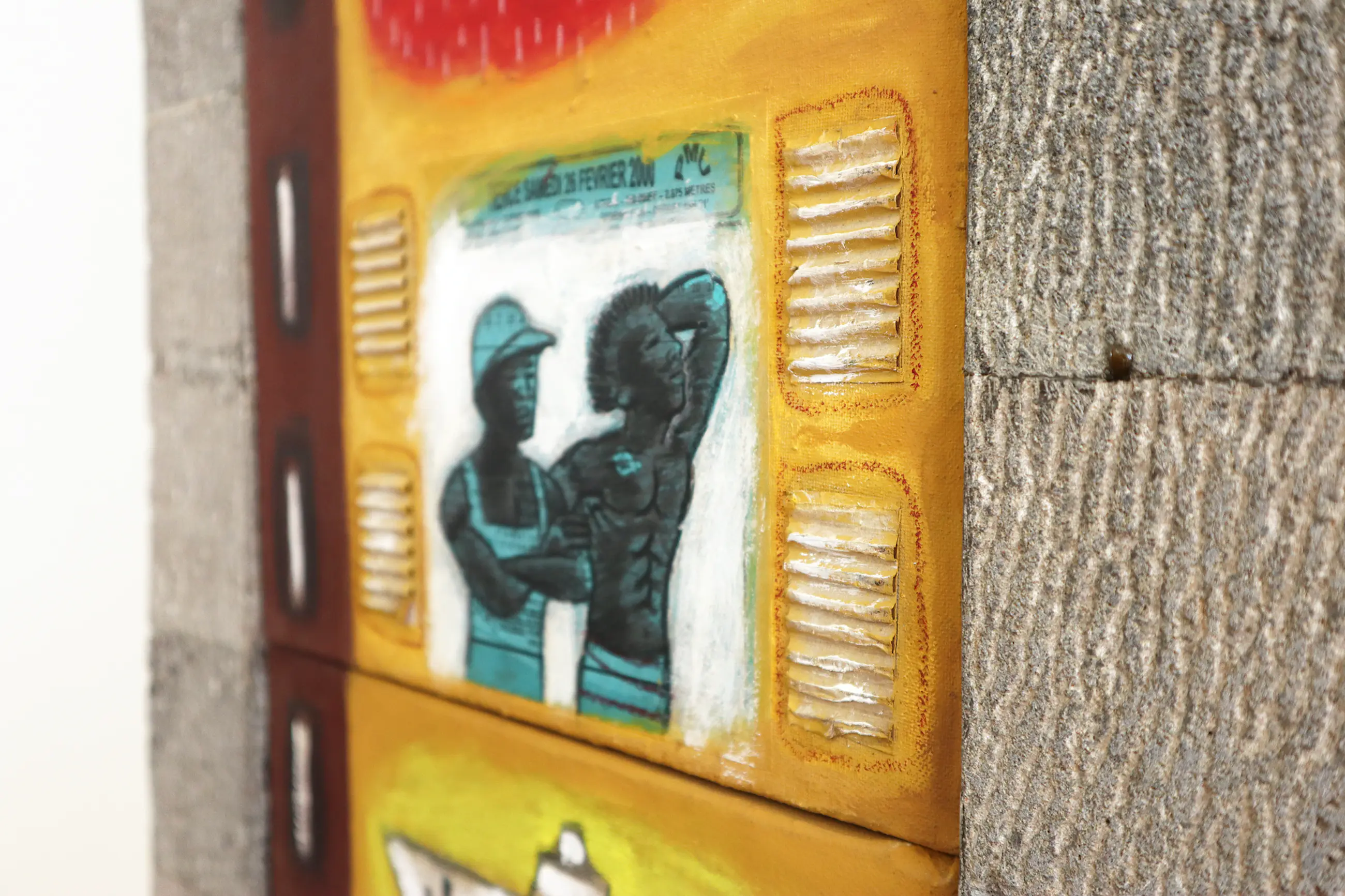 Het werk van de multidisciplinaire Senegalese kunstenaar Samba Fall (Dakar, 1977) combineert meerdere materialen. Fall beplakt zijn canvassen met grote en kleine stukken papier, bedrukte biljetten en etiketten en kleine objecten, die hij daarna overgeschilderd. Deze speciale vorm van beschilderde collage creëert diepgang in het werk, mede doordat de bedrukking van de etiketten (deels) te lezen blijven. Het werk ‘Fantaisie de voyage’ bevat naast overschilderde biljetten ook stukjes golfkarton. Het werk bestaat uit 5 doeken van 30 x 30 cm, die boven elkaar zijn ingelijst in een massieve lijst van basalt steen