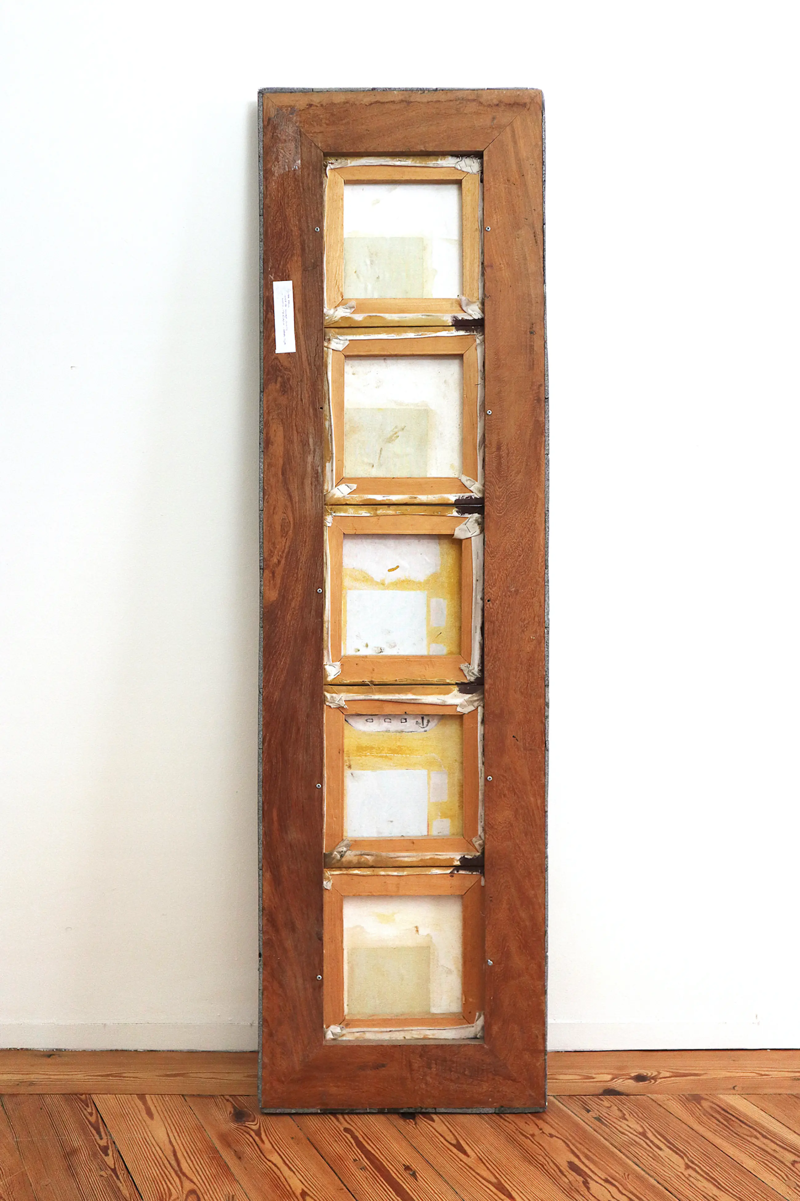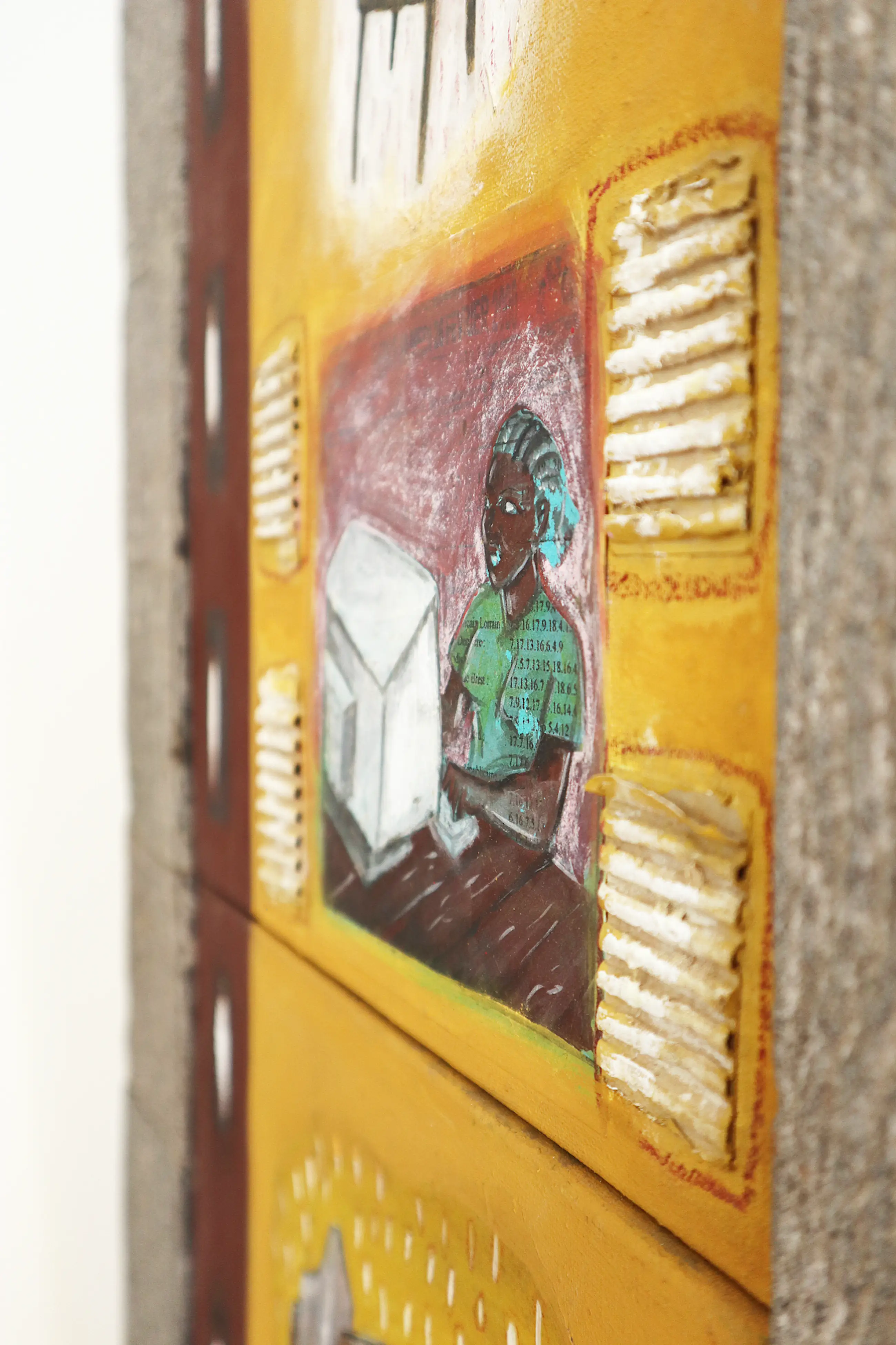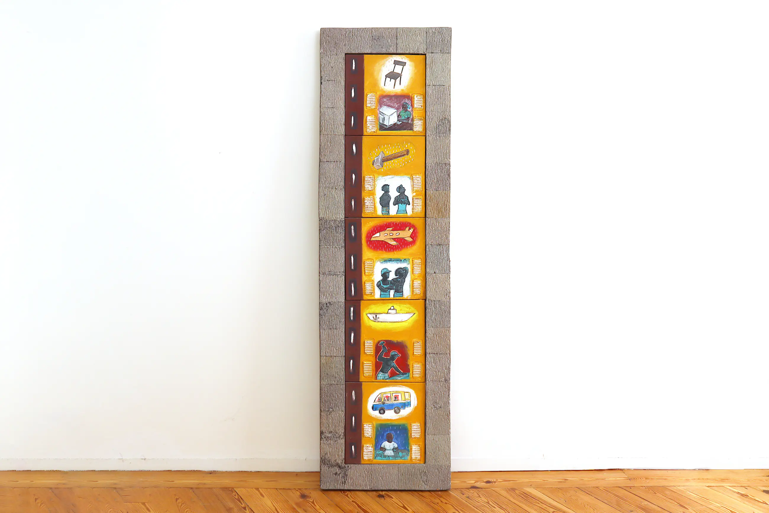 Het werk van de multidisciplinaire Senegalese kunstenaar Samba Fall (Dakar, 1977) combineert meerdere materialen. Fall beplakt zijn canvassen met grote en kleine stukken papier, bedrukte biljetten en etiketten en kleine objecten, die hij daarna overgeschilderd. Deze speciale vorm van beschilderde collage creëert diepgang in het werk, mede doordat de bedrukking van de etiketten (deels) te lezen blijven. Het werk ‘Fantaisie de voyage’ bevat naast overschilderde biljetten ook stukjes golfkarton. Het werk bestaat uit 5 doeken van 30 x 30 cm, die boven elkaar zijn ingelijst in een massieve lijst van basalt steen