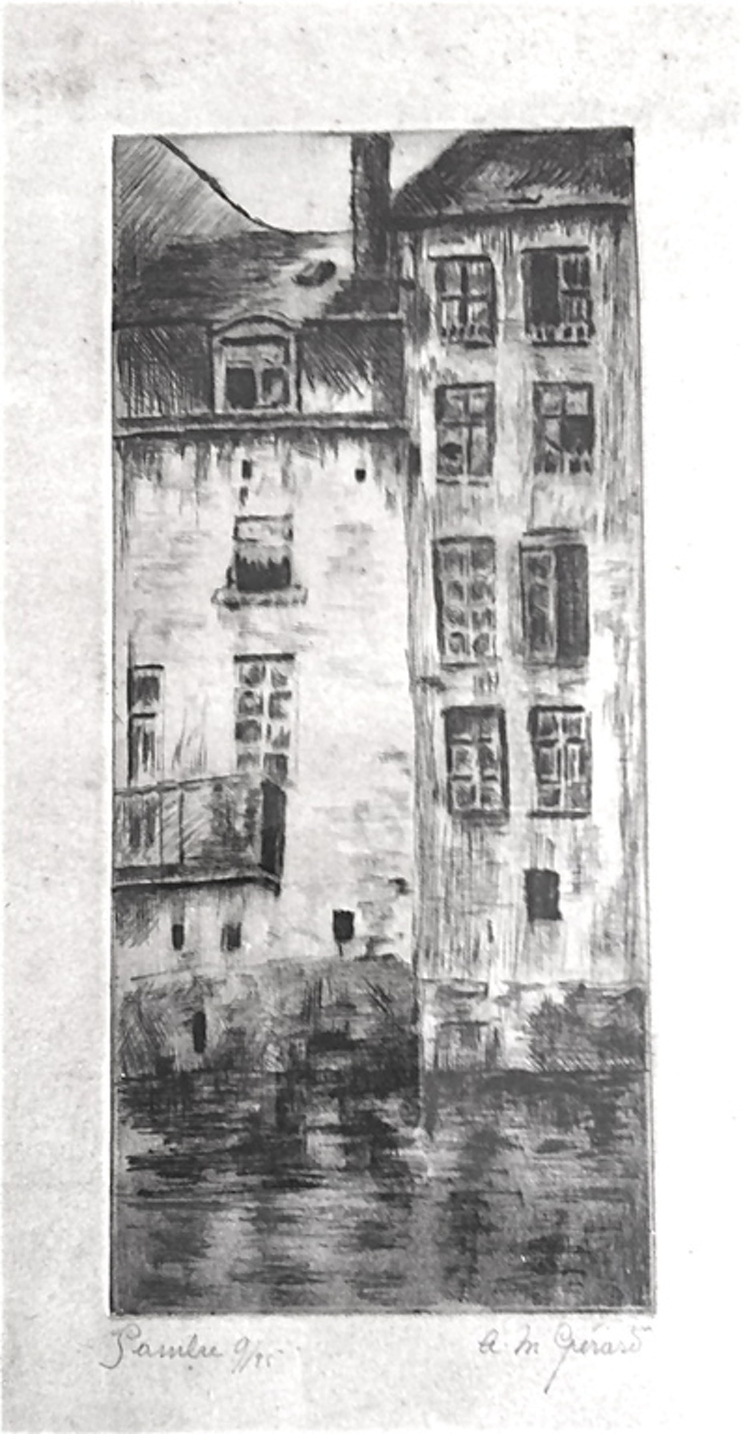 Fraai werk van een simpele huizenrij aan de rivier de Sambre van voor 1935
