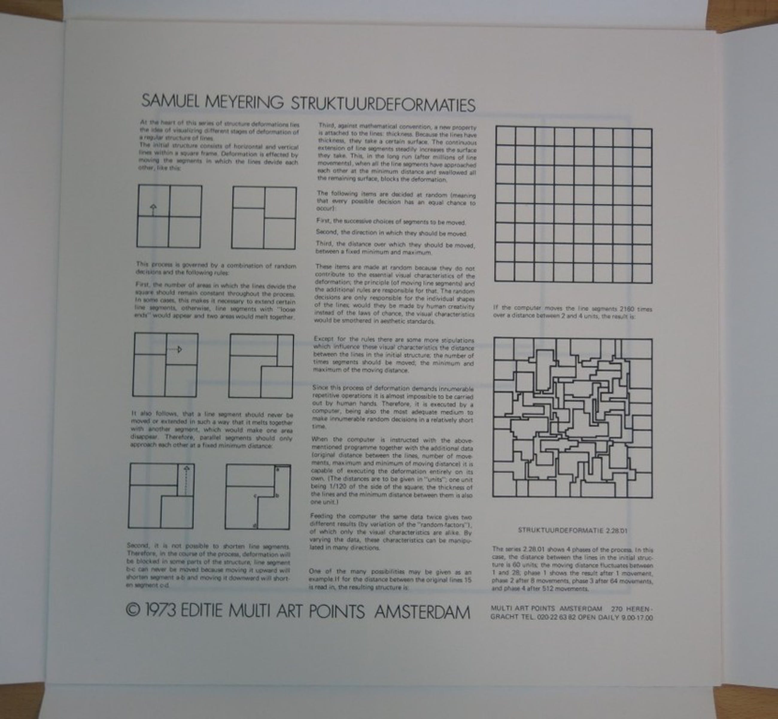 Map met 4 zeefdrukken van Samuel Meyering, uit het jaar waarin tevens zijn wereldberoemde Rolykit het levenslicht zag. De map is uitgegeven door Multi Art Points te Amsterdam, en bevat een blad met uitleg over het ontstaan van de structuurdeformaties.
