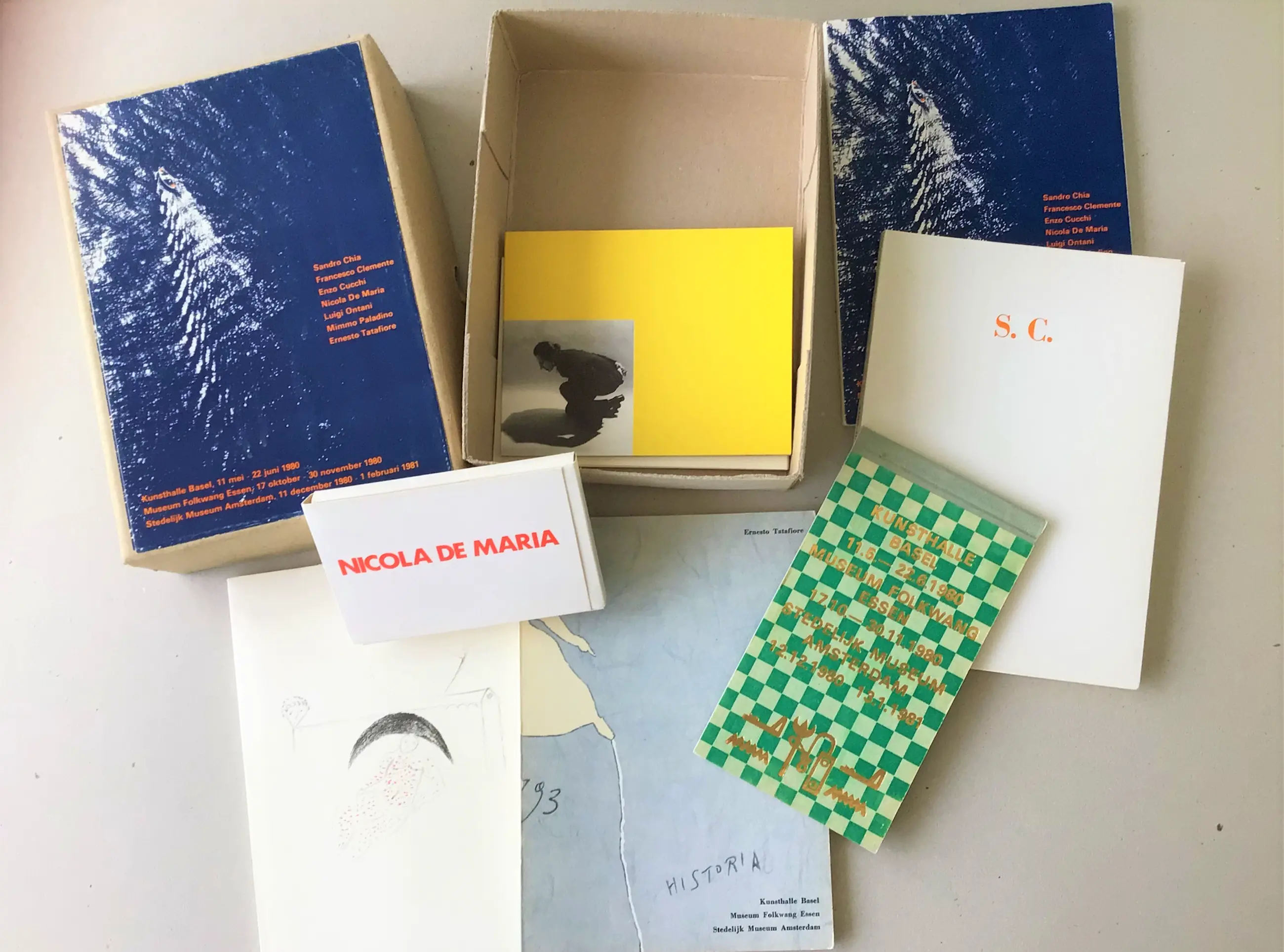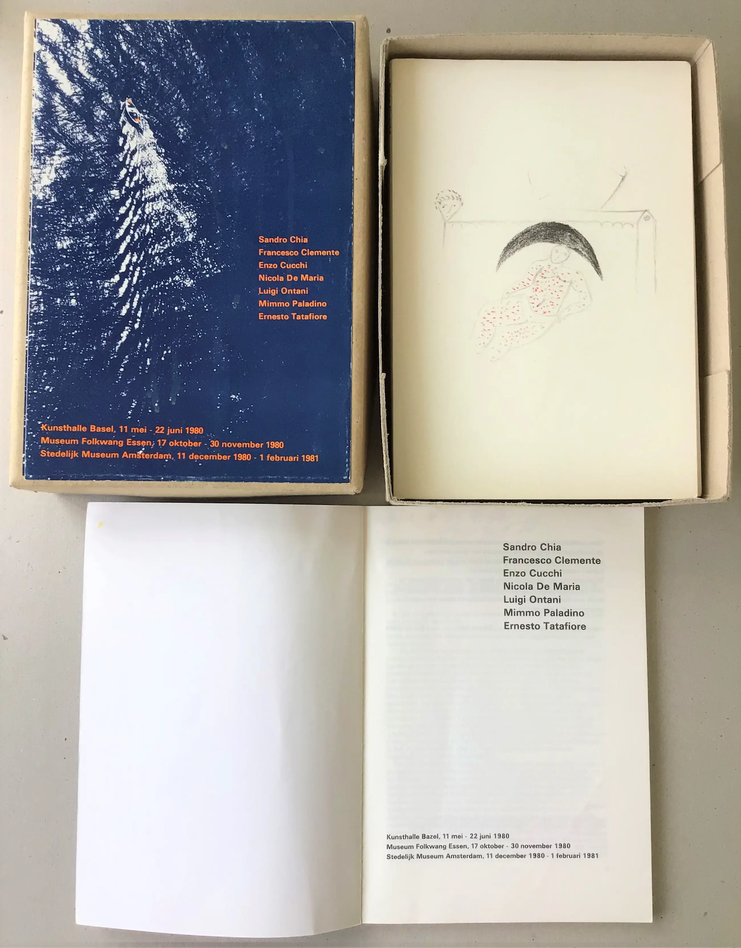 Karton box met 7 verschillende catalogi + 1 algemene informatie. Uitgave Kunsthalle Basel 1980 Tevens Museum Folkwang, Essen en Stedelijk Museum Amsterdam. Formaat box 22 x 16 x 6 cm Algemene informatie in Nederlands Catalogi in Italiaans Catalogi in uitstekende conditie, als nieuw. Box weinig gebruikssporen.