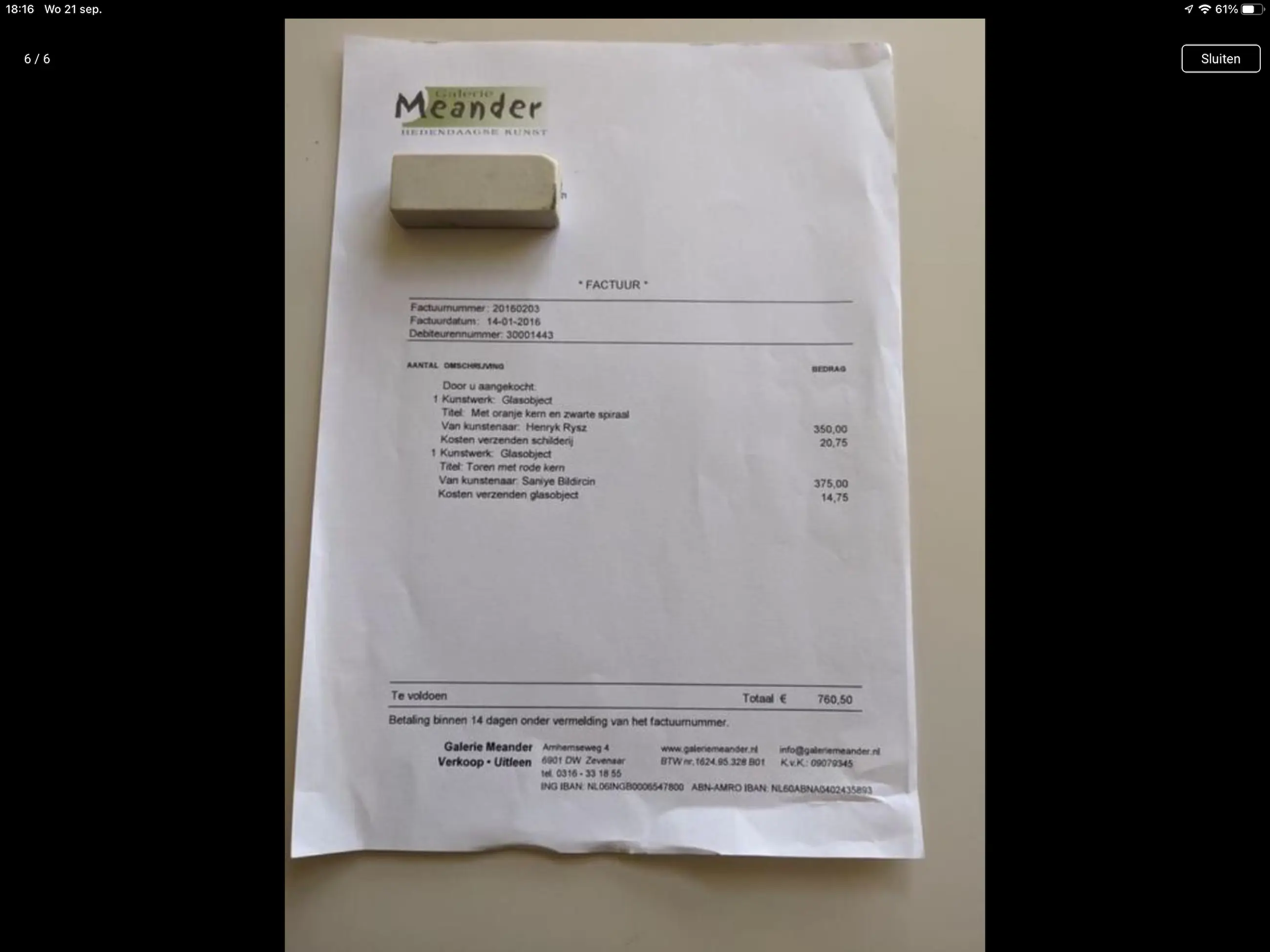 Het werk is af te halen op locatie. Als koper dient u zelf verpakkingsmateriaal mee te nemen. De locatie is: Amstelveen, Nederland