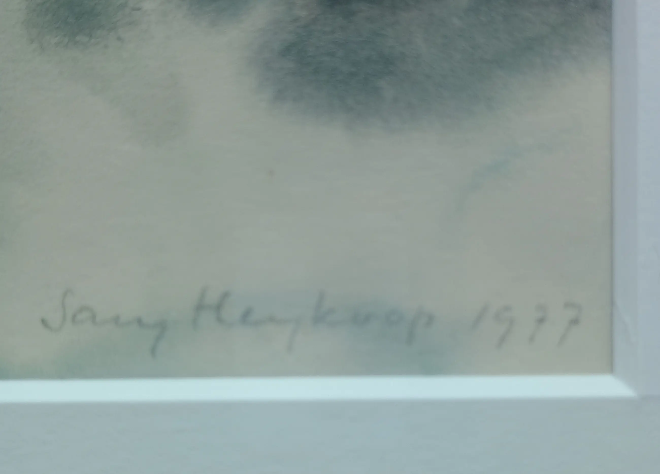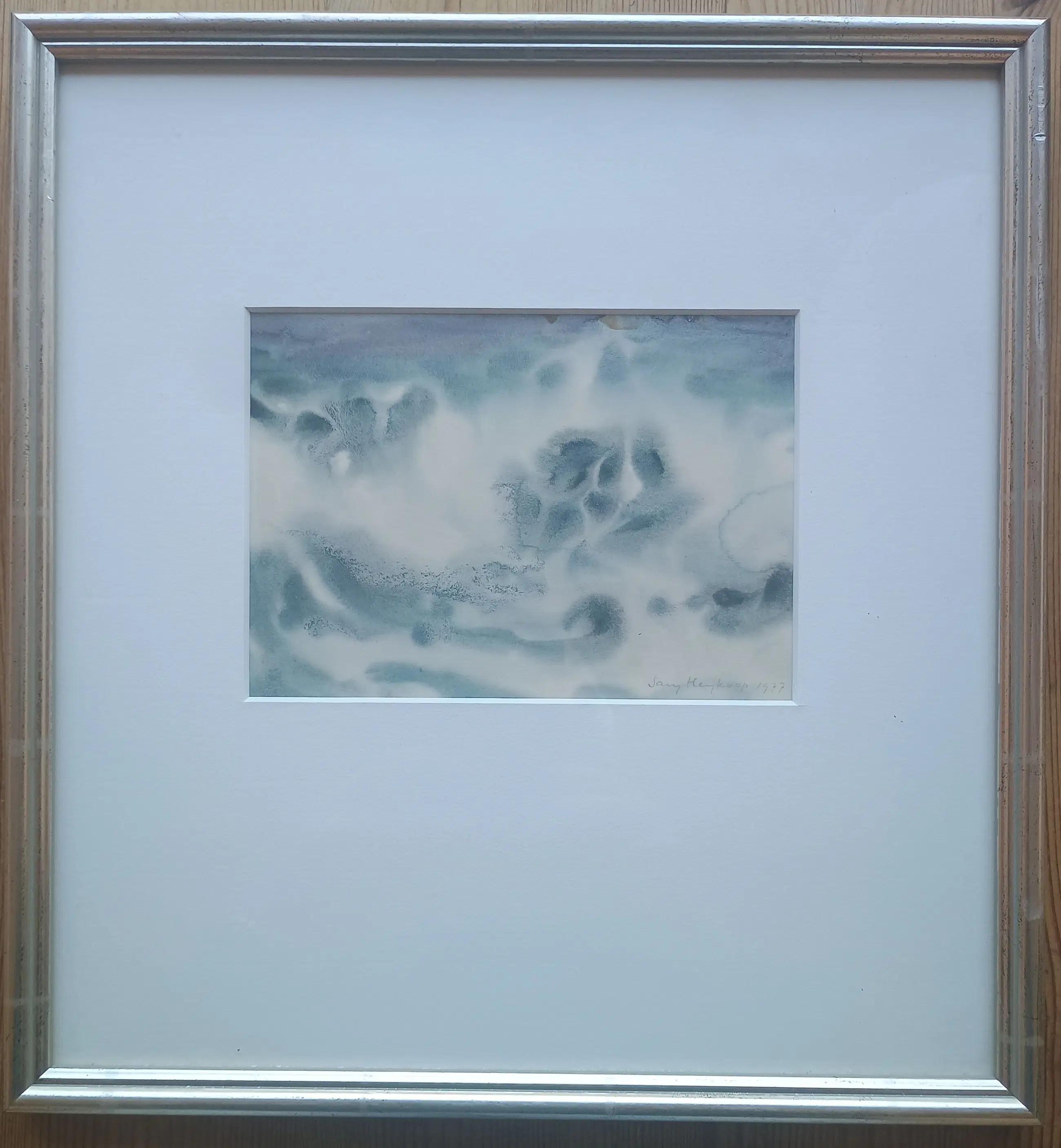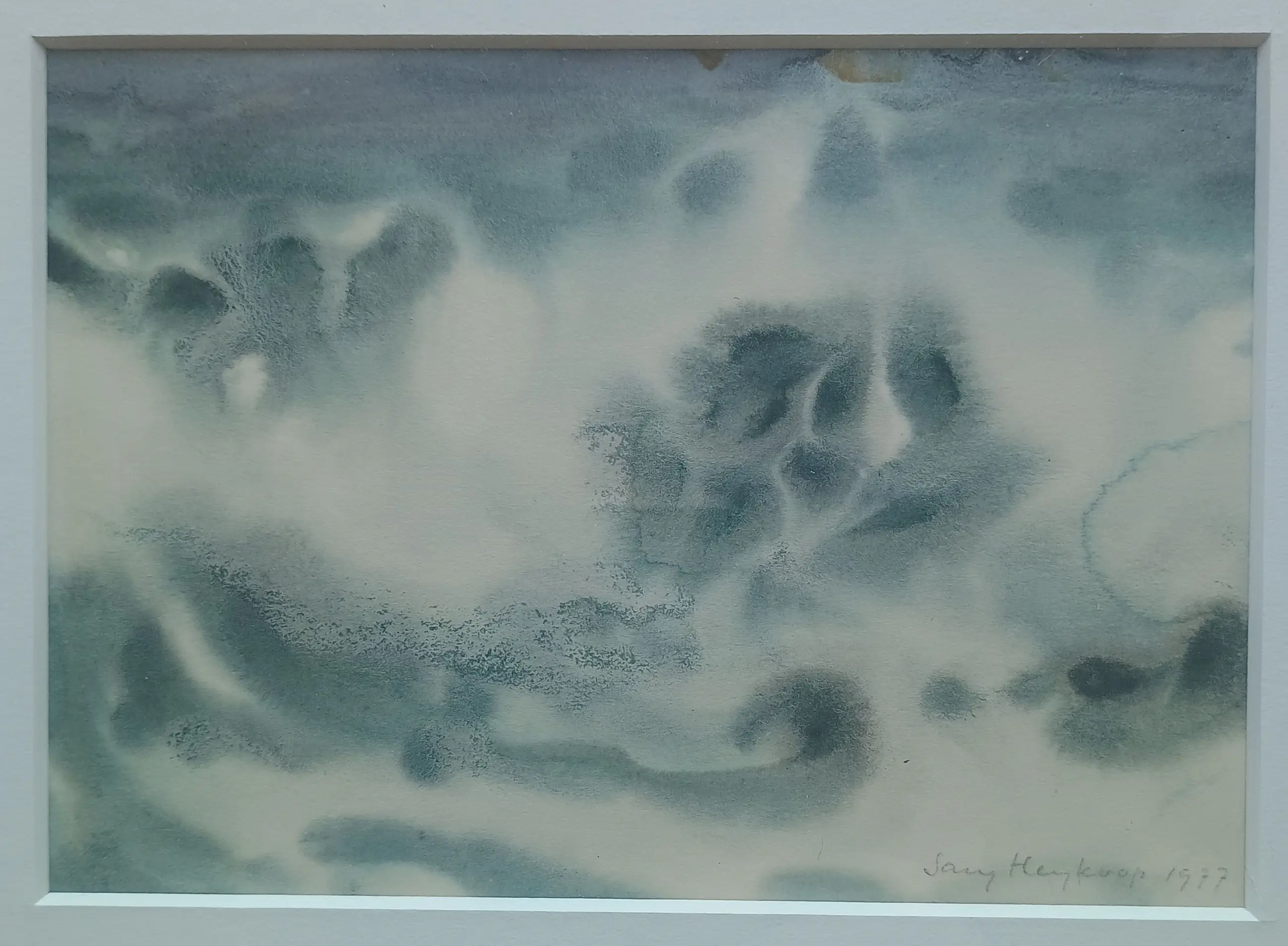 Fantasie / abstracte aquarel van Sary Heykoop, gemaakt in 1977. Sary Heykoop was lithograaf, illustrator, aquarellist, tekenaar en textielkunstenaar op Terschelling, waar zij een galerie bezat.