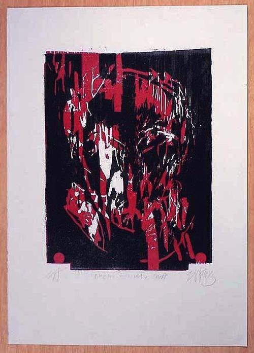Technik: Holzschnitt (-druck) in 2 Farben, matt und glänzend