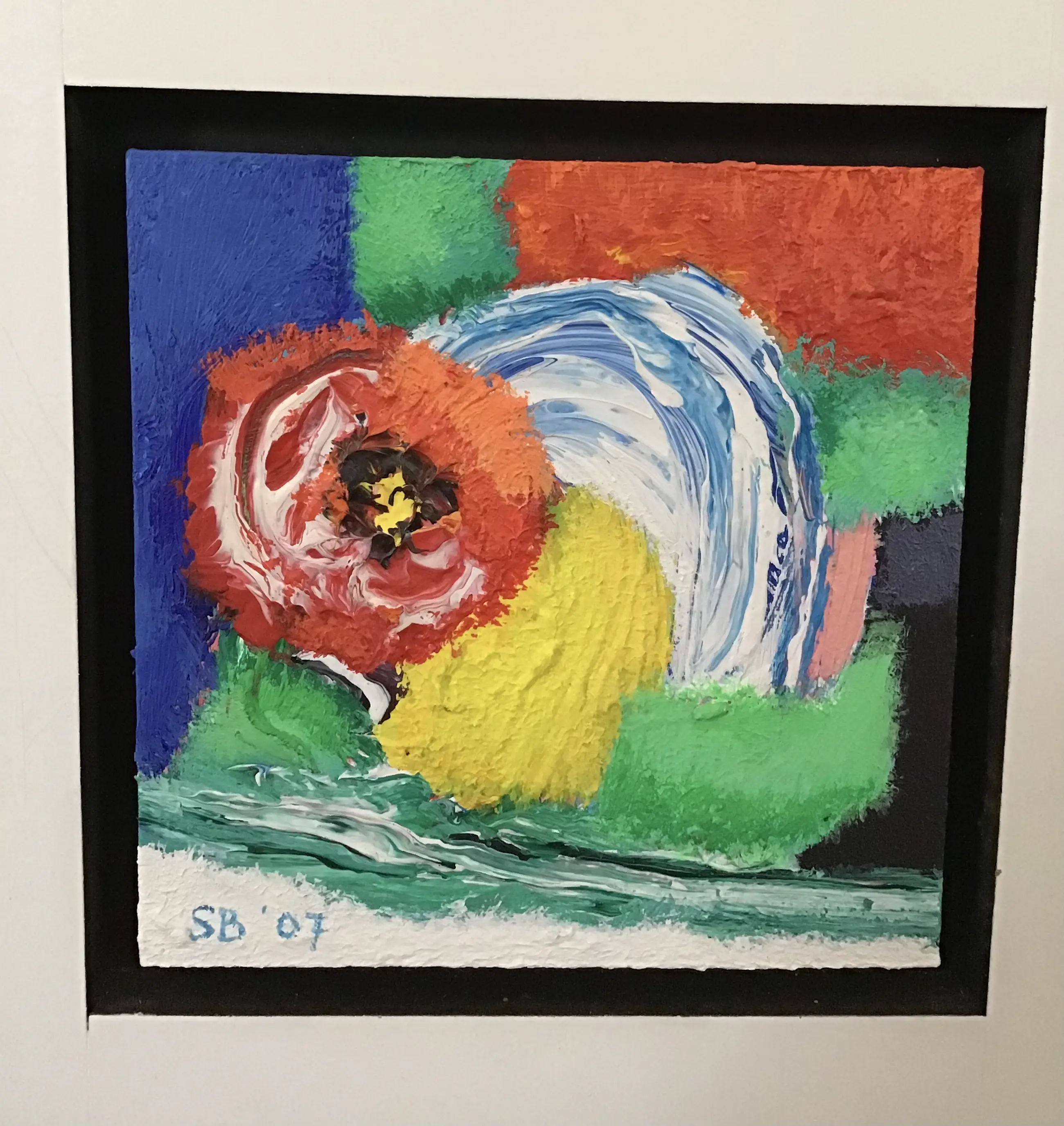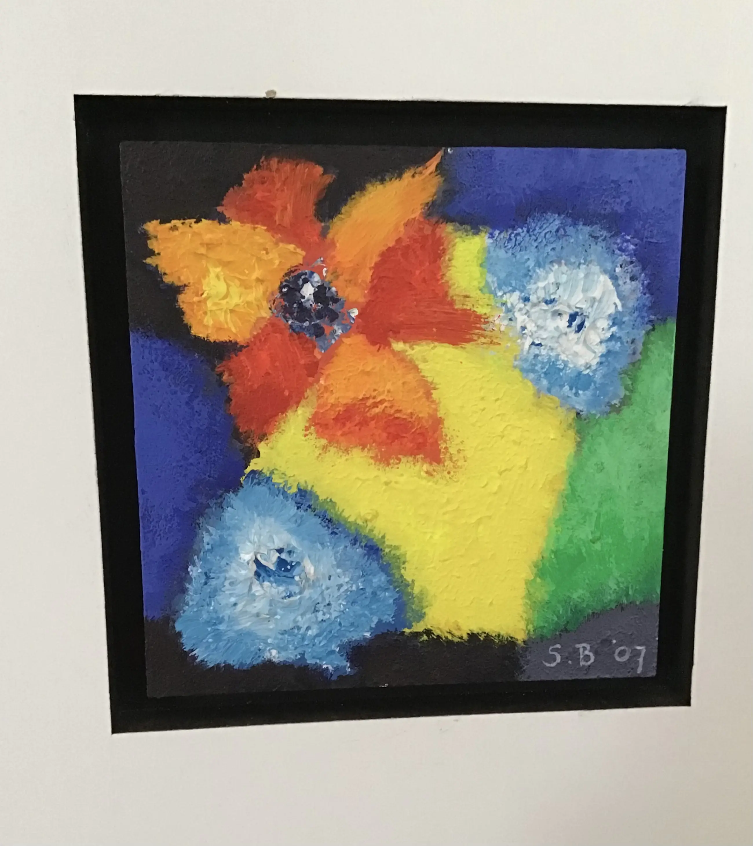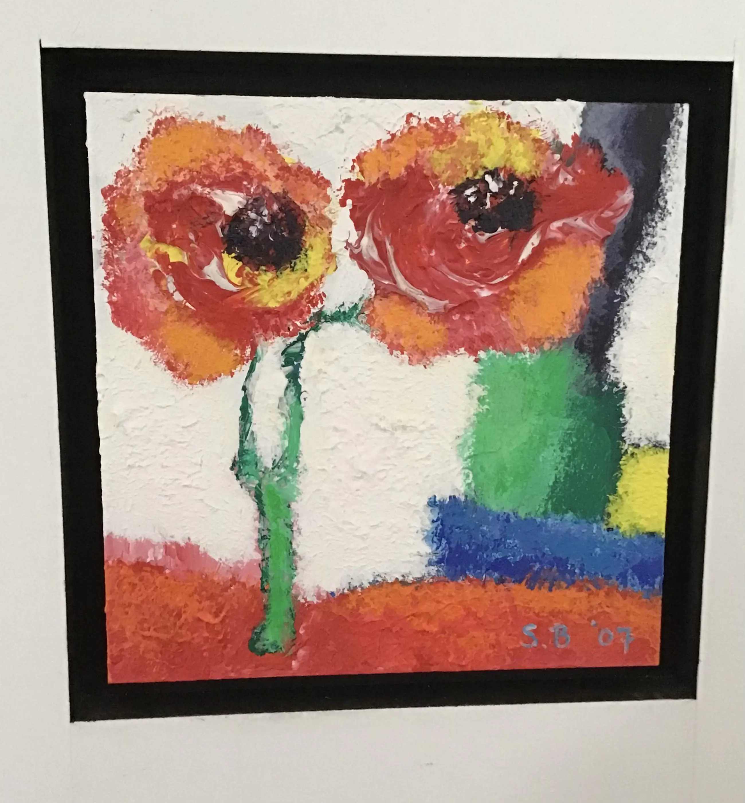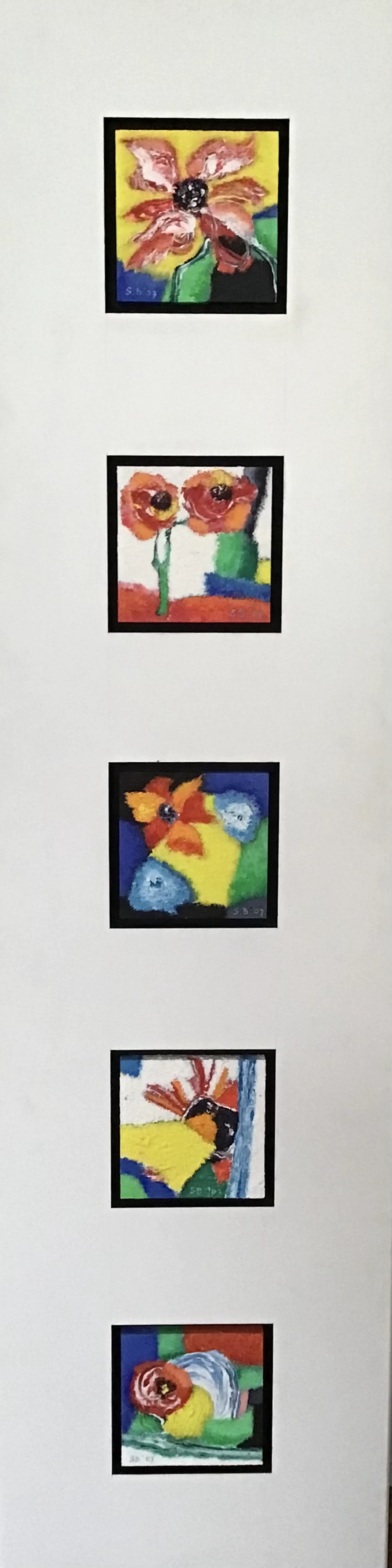 Saskia Bremer, Flower Power in Portugal 5 originele schilderijtjes , verdiept ingelijst in houten paneel Allen gesigneerd Jaar 2007 Hoogte paneel 152cm Breedte 40cm Dikte 3,5 cm Heel mooi op wat smallere muur Ophang gereed Ivm gewicht liefst afhalen Bezorgen in overleg