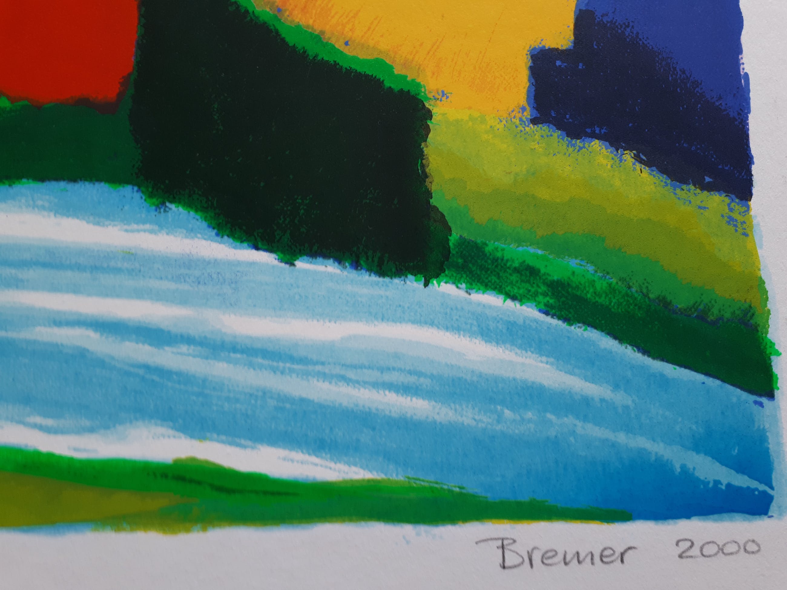 De zeefdruk is ingelijst geweest. Het blad heeft zeer lichte schade door het inlijsten, maar het beeld is ZGAN / in zeer goede staat. Bij opnieuw inlijsten valt de schade op het blad weg.