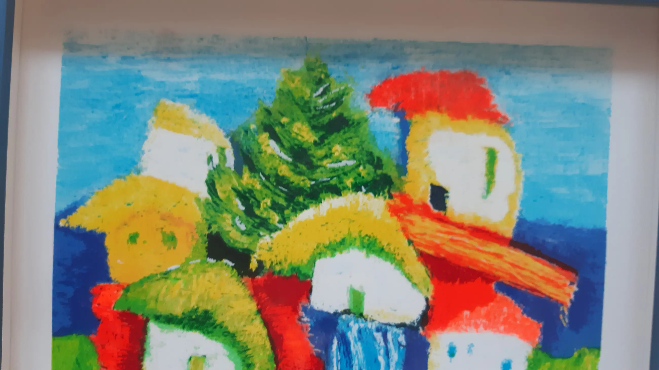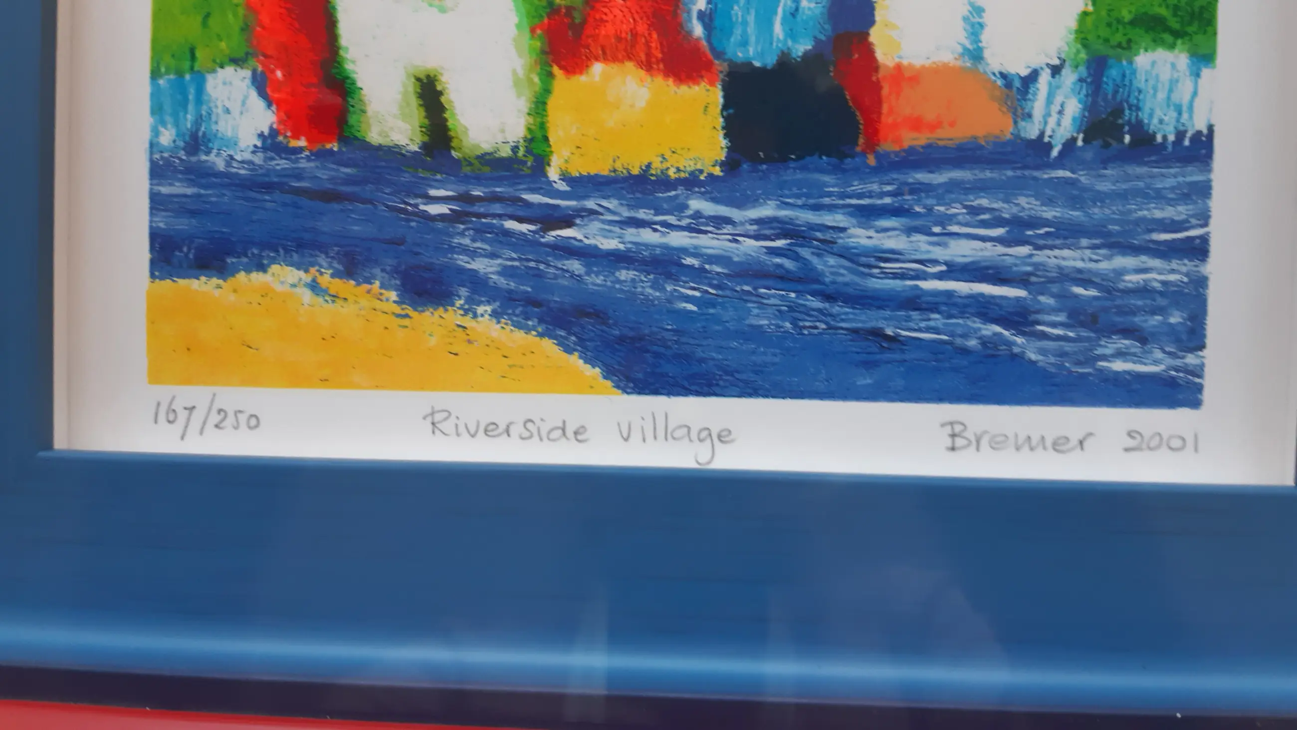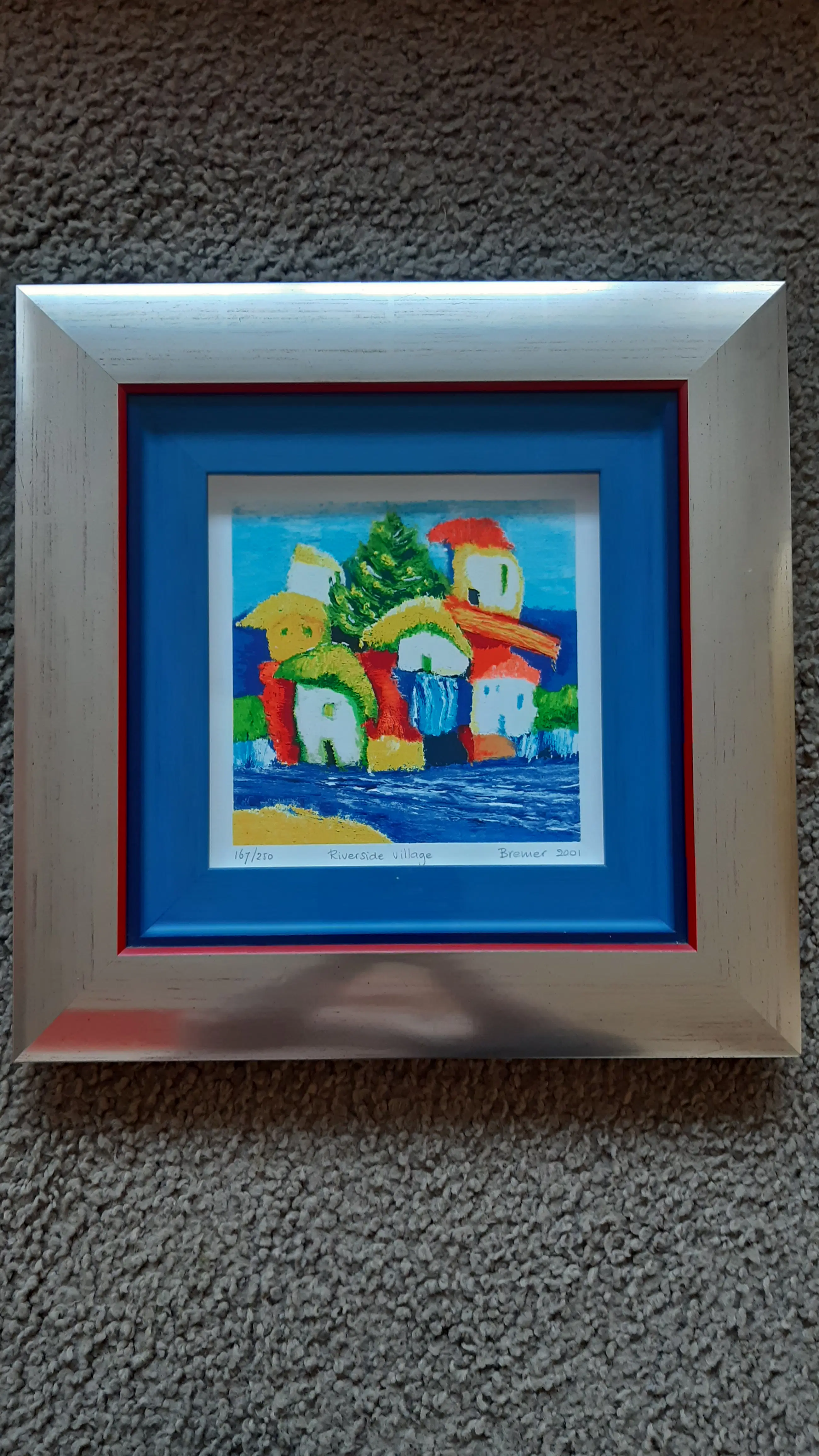 Dit mooie werkje van Saskia Bremer komt door de inlijsting nog mooier uit dan het al is: het is verdiept ingelijst met een blauwe lijst en daarom heen nog een mooie zilverkleurige lijst (rood geaderd) met rood accentrandje aan de binnenkant, waardoor het geheel het effect heeft van een kijkdoosje