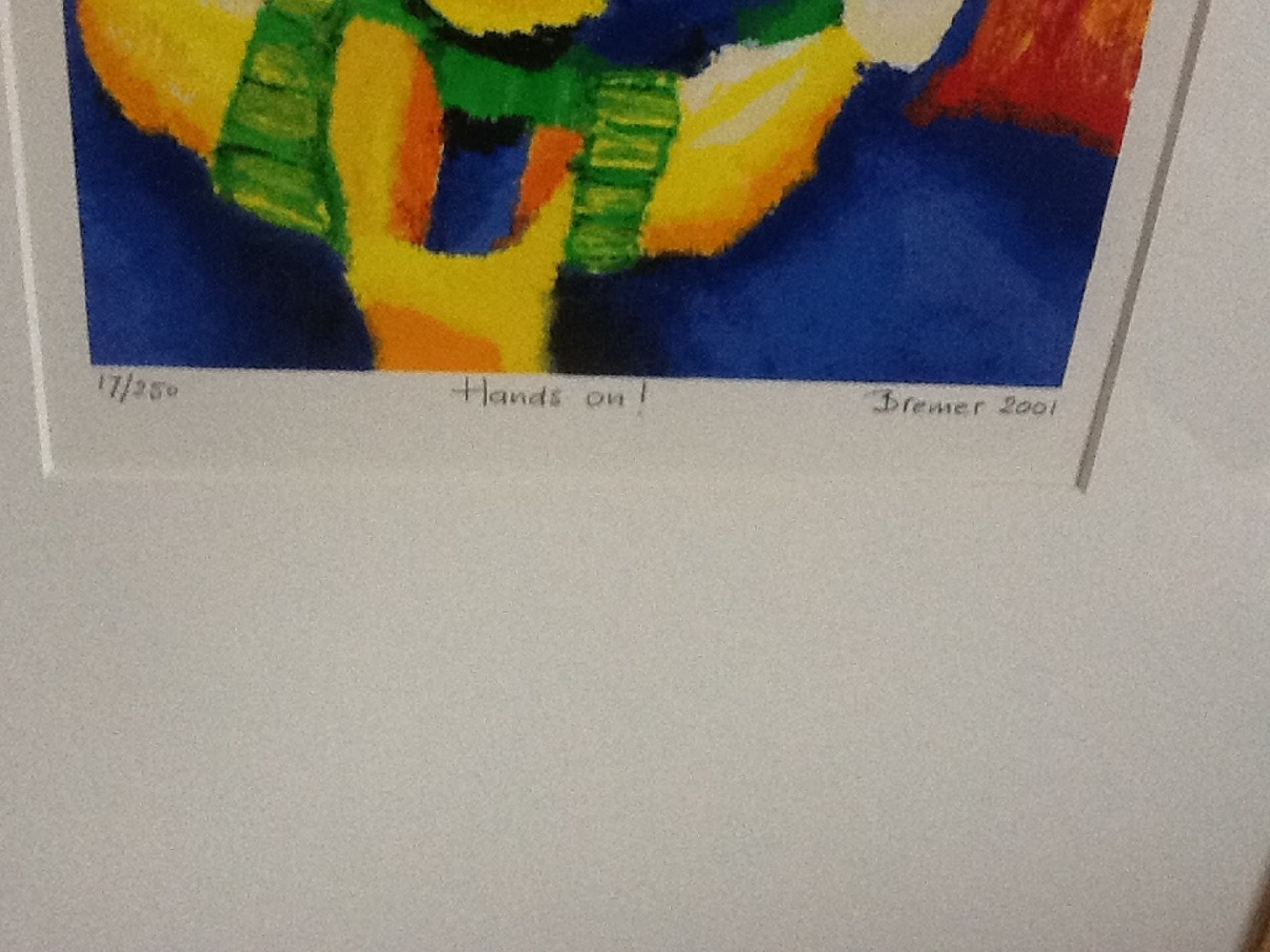 Kleurenlitho. Ingelijst : ja, met glas en houten lijst van 2 cm breed. Gesigneerd : ja met Bremer 2001 r.o.met potlood. Genummerd : ja, 17/250. Titel : ja, Hands On! Maten : Blad 53 x 43 cm en beeld 23 x 22 cm. Prijs is excl verzendkosten.