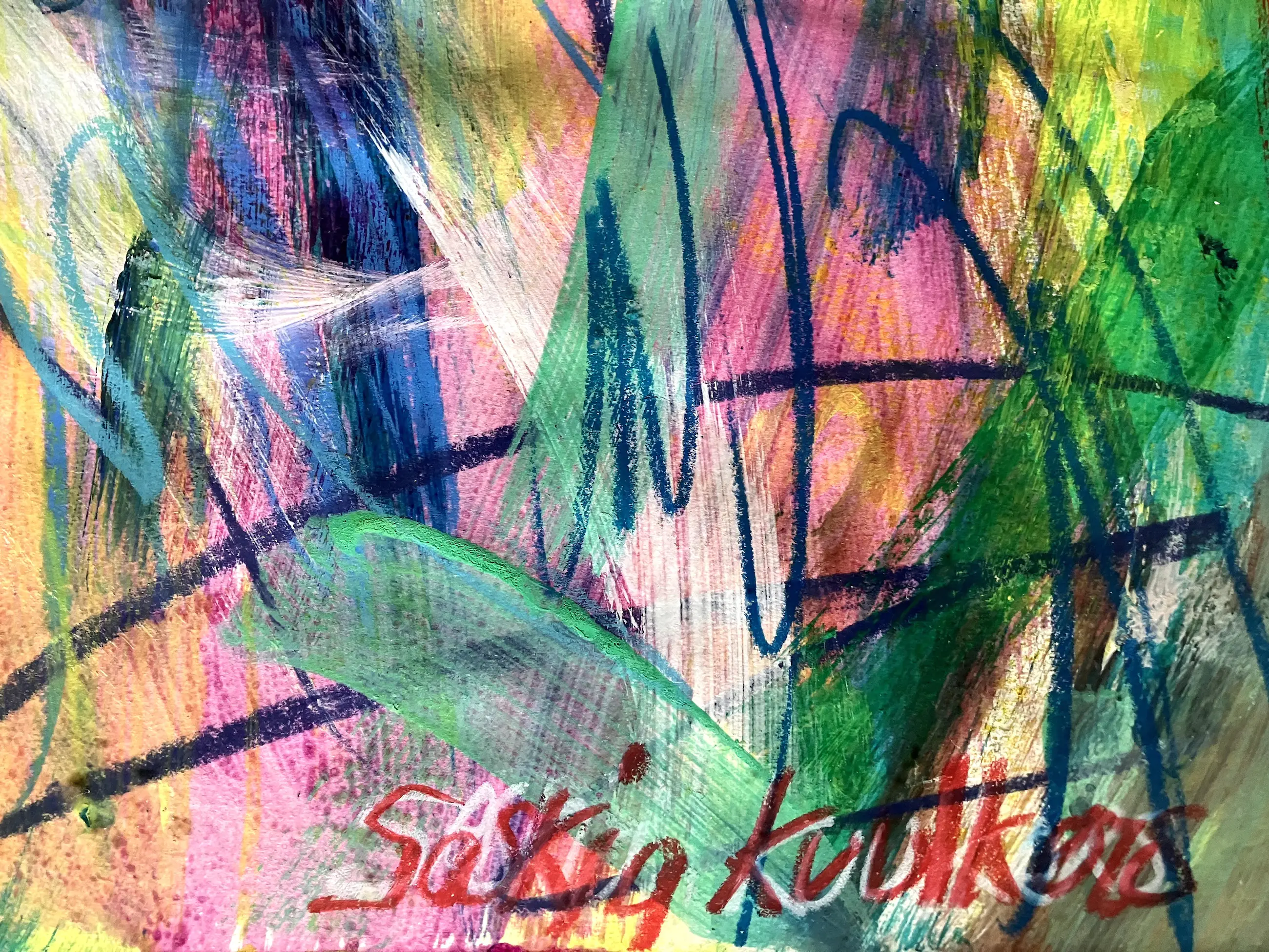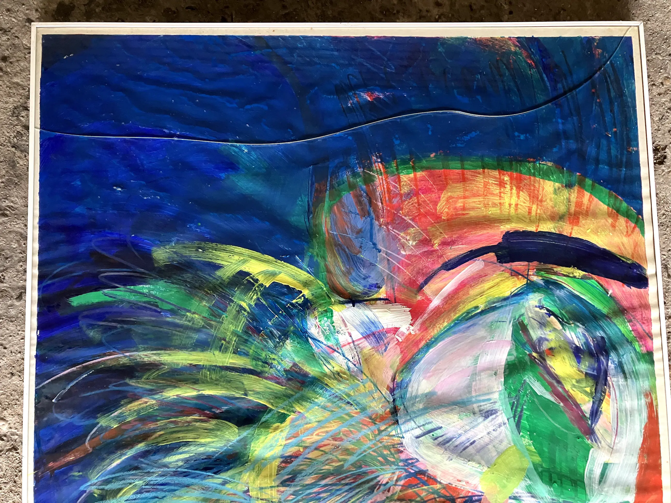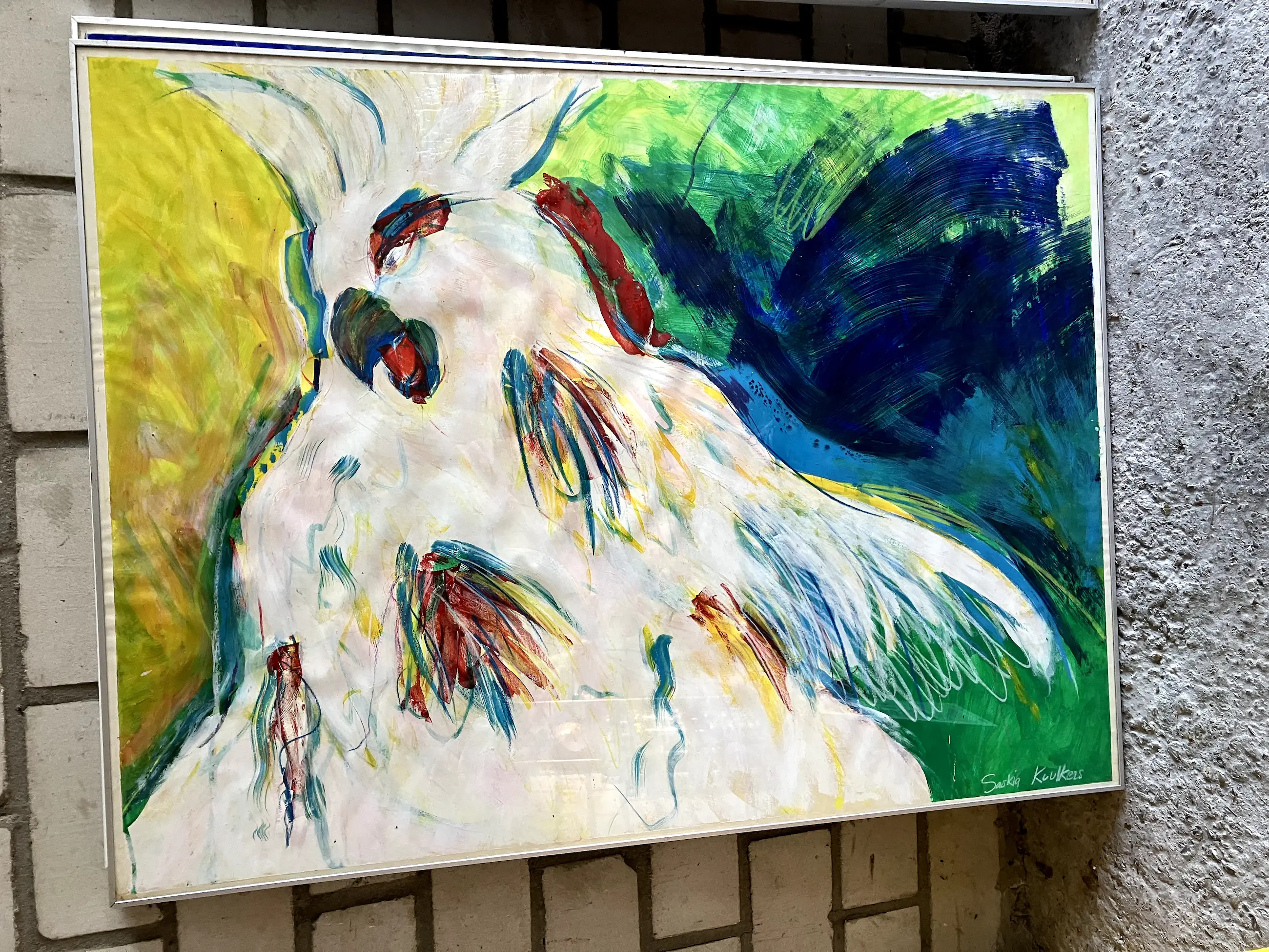 Unieke werken omdat deze kunstenares meestal zeefdrukken verkoopt. Zitten in mooie lijsten maar moeten opnieuw strak worden ingelijst - de lijsten zijn zeker bruikbaar.