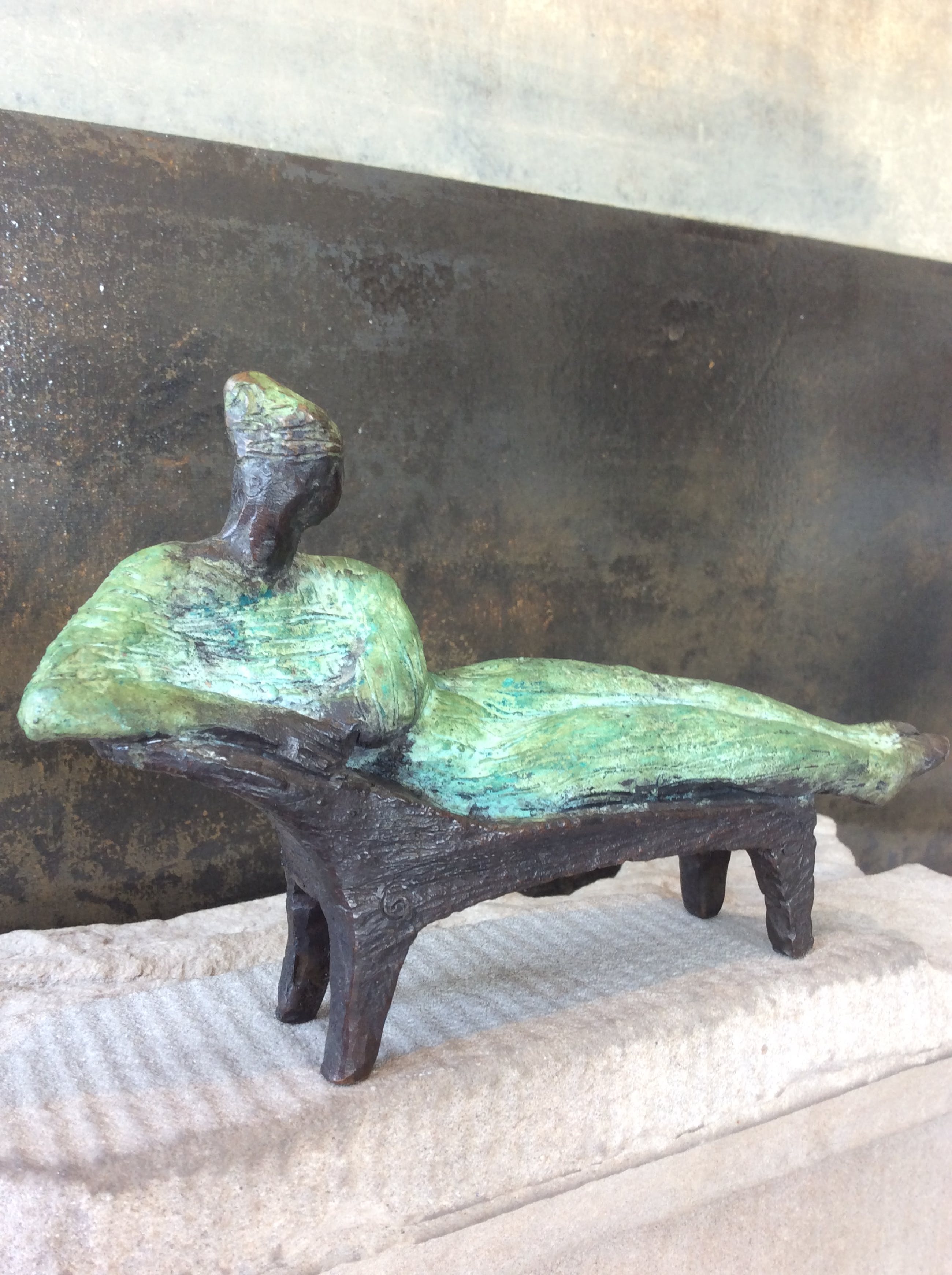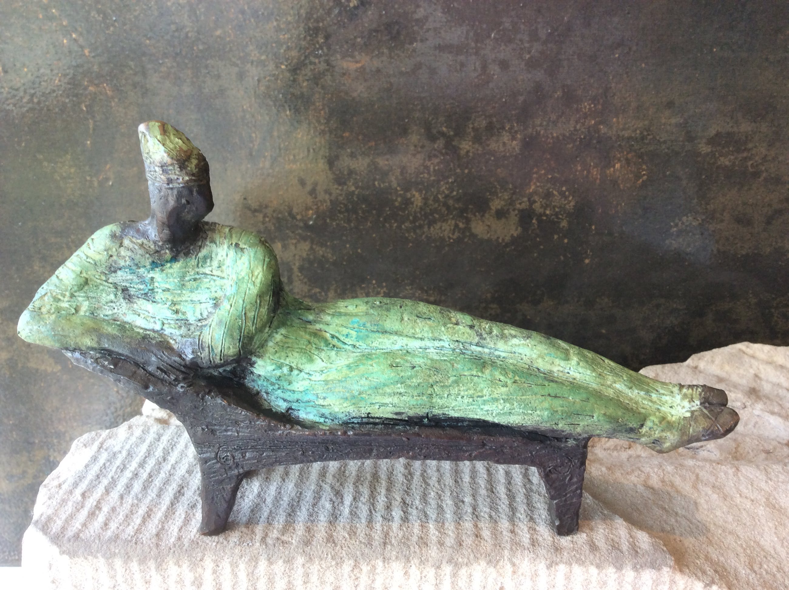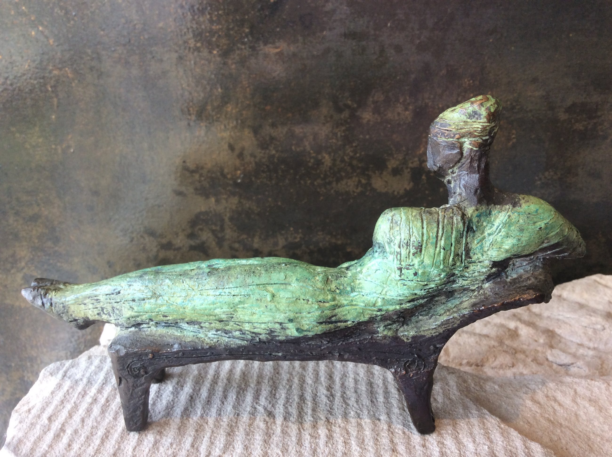 Prachtig brons van Saskia Pfaeltzer.Liggende vrouw op bank, gemaakt in de periode die ze in de tropen doorbracht. Pfaeltzer heeft vele exposities in binnen- en buitenland gehad en haar werk -vrij en in opdracht- bevindt zich in museale, particuliere en bedrijfscollecties wereldwijd. Werken zijn de laatste jaren ook regelmatig aangeboden op de PAN. Let op: galerieprijs: 1.950,-