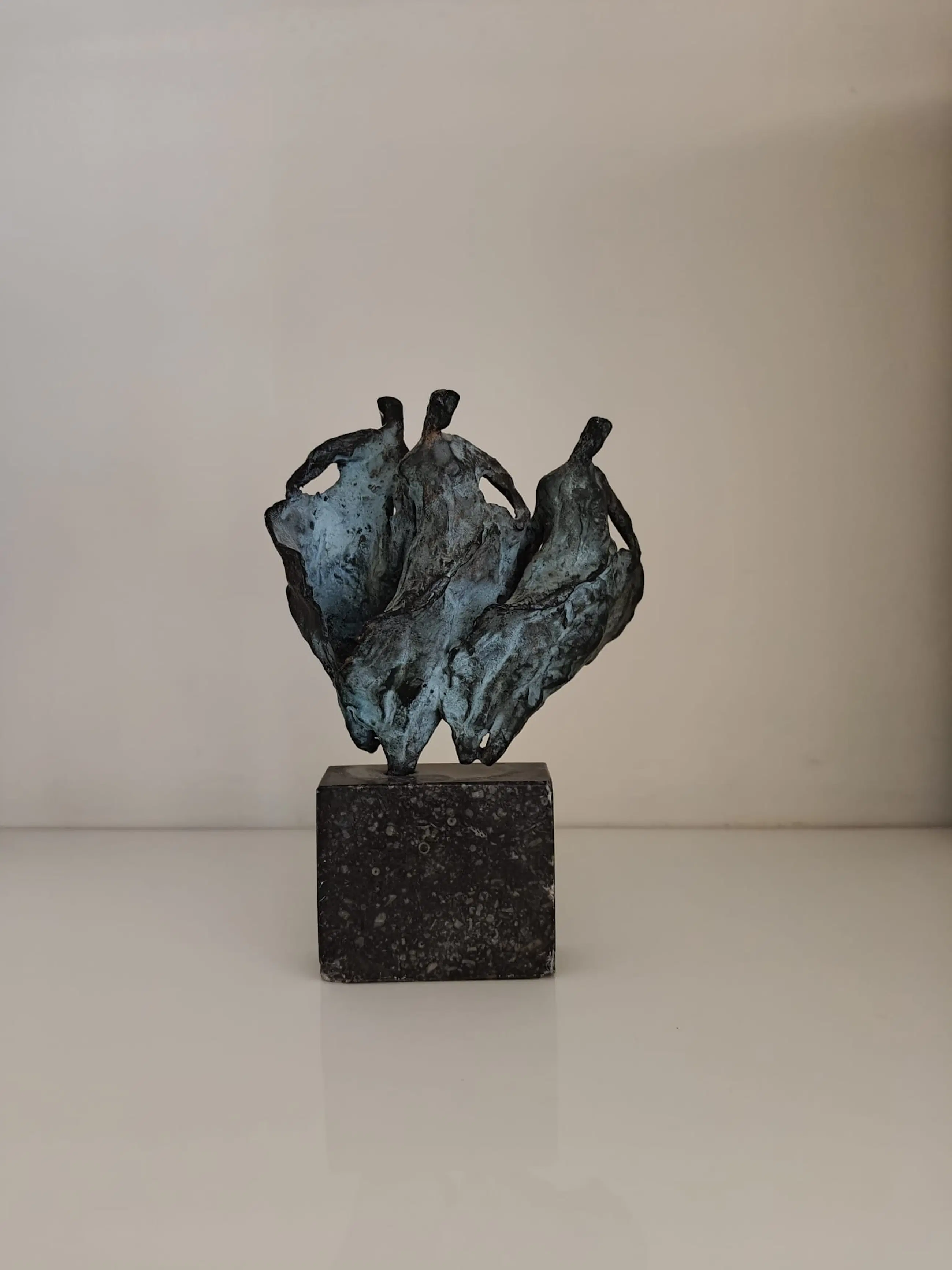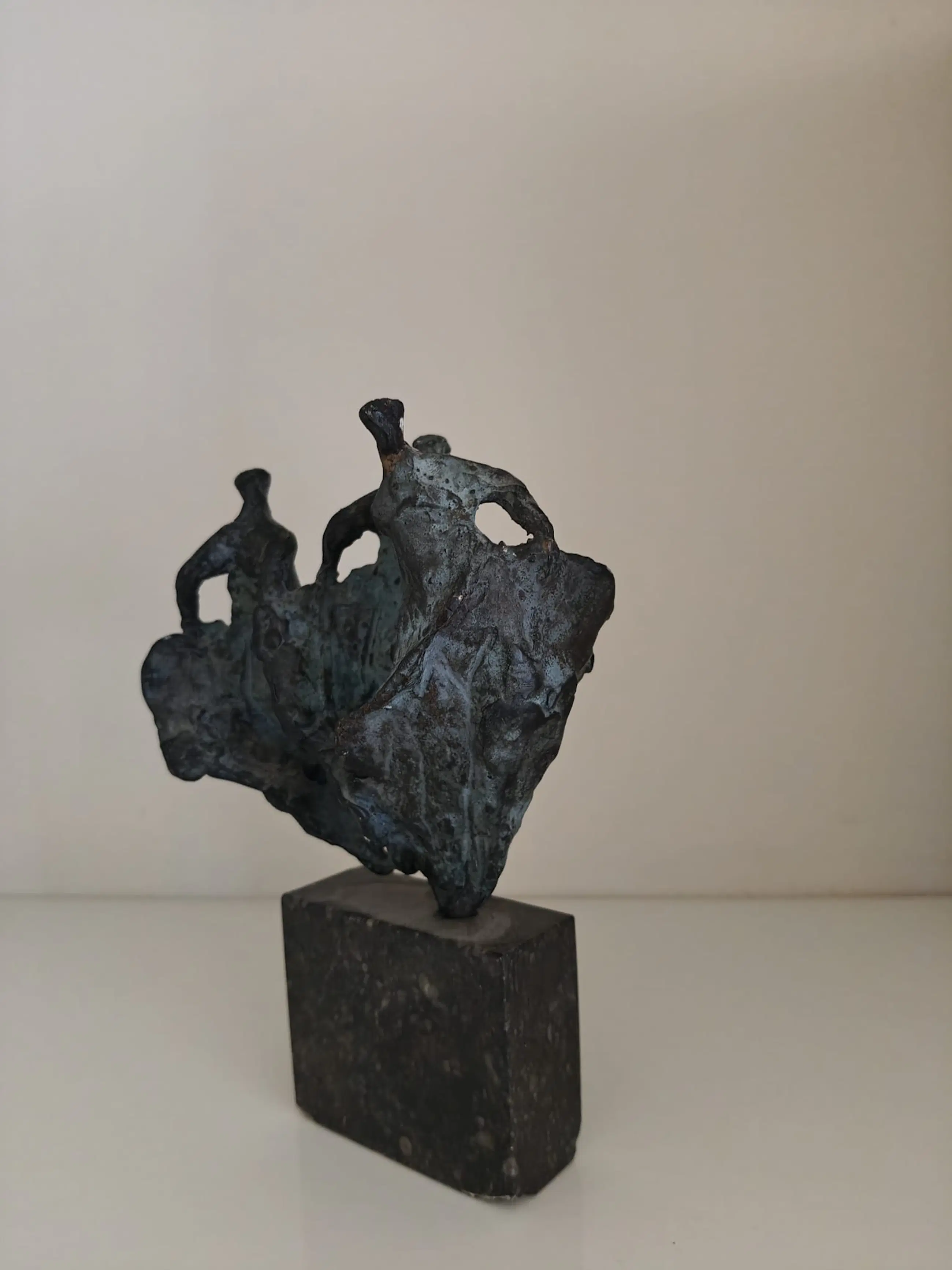 Beeldje op sokkel, sokkel heeft 2 slijtage plekjes en 1 kleine beschadiging, beeldje is onbeschadigd.