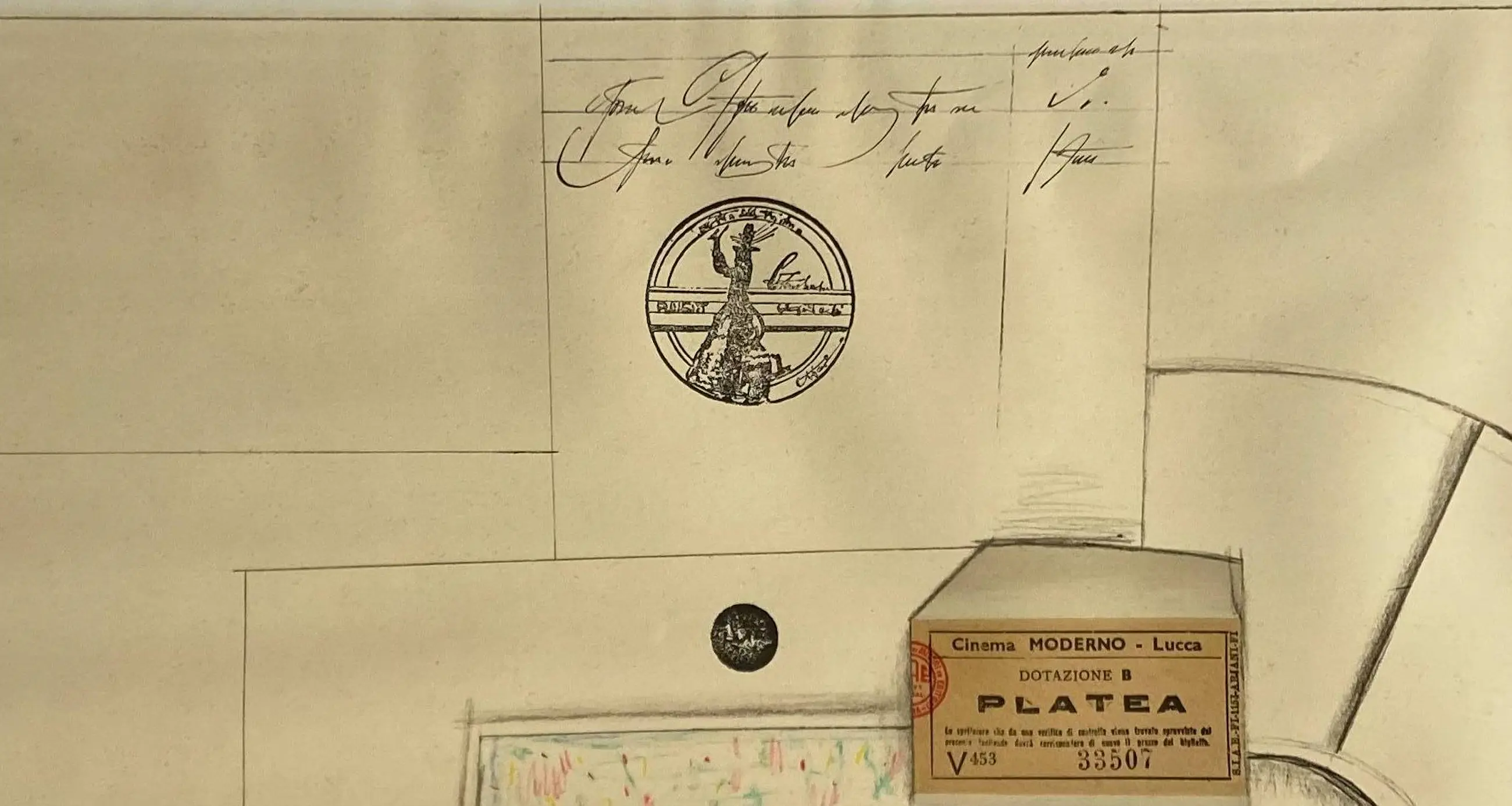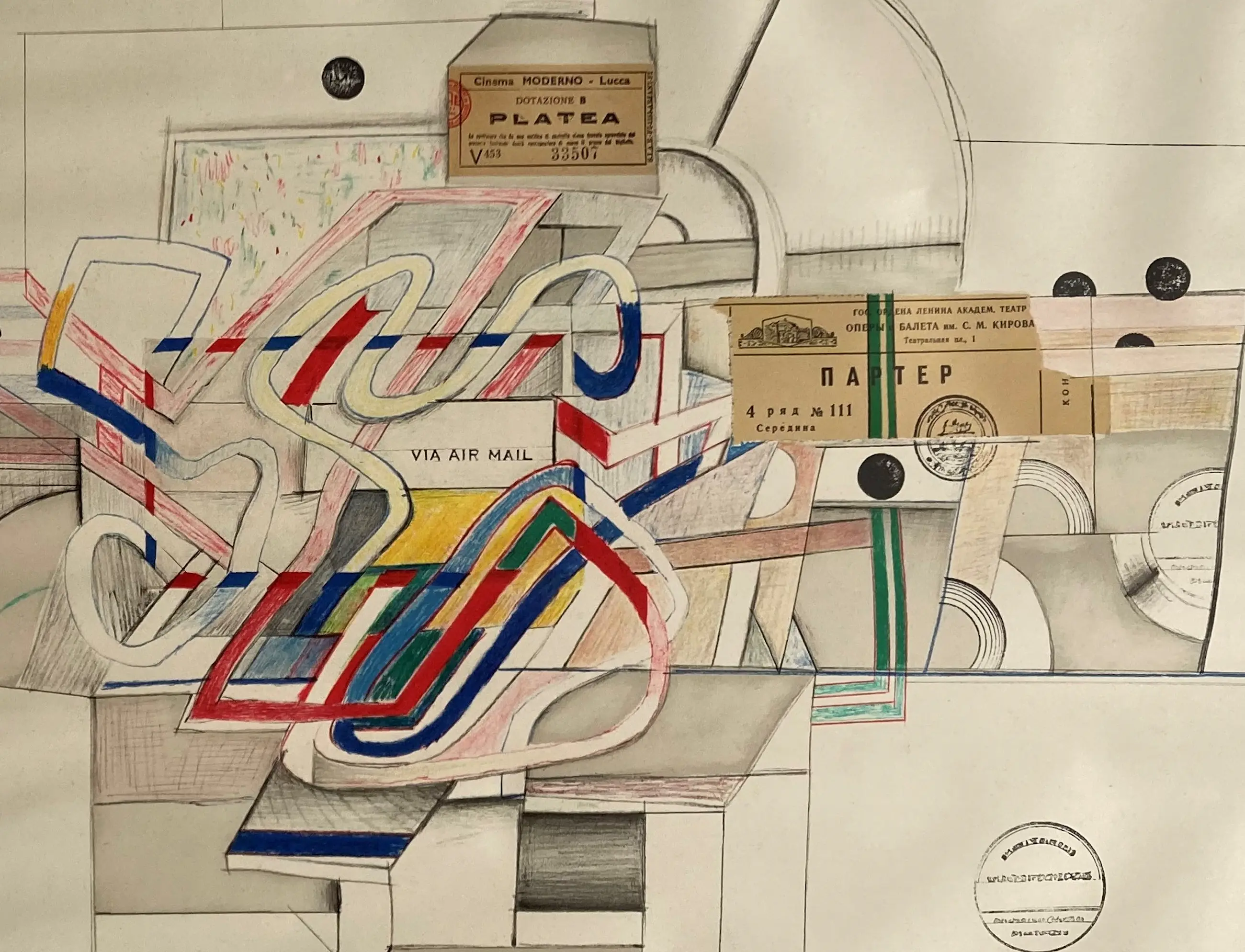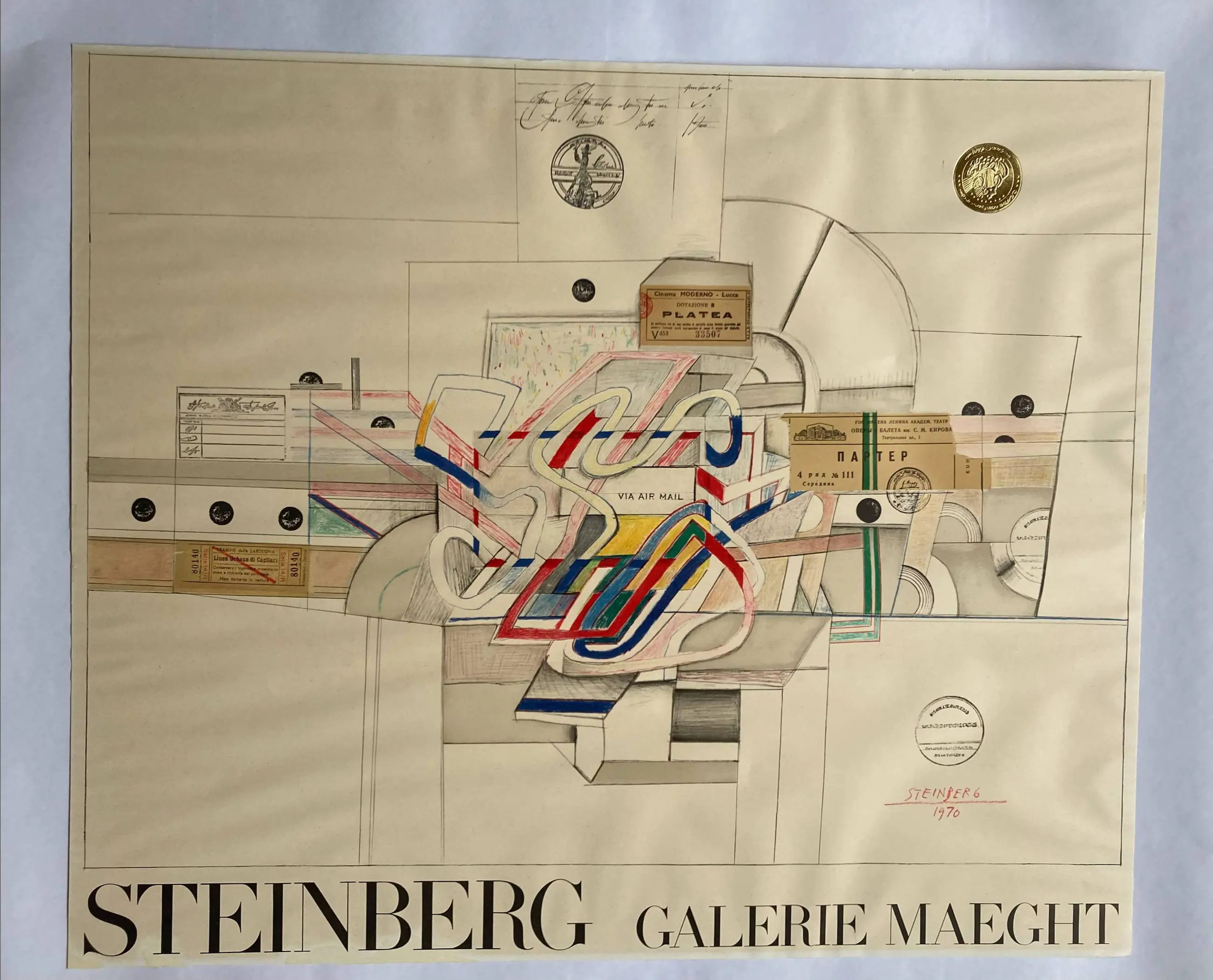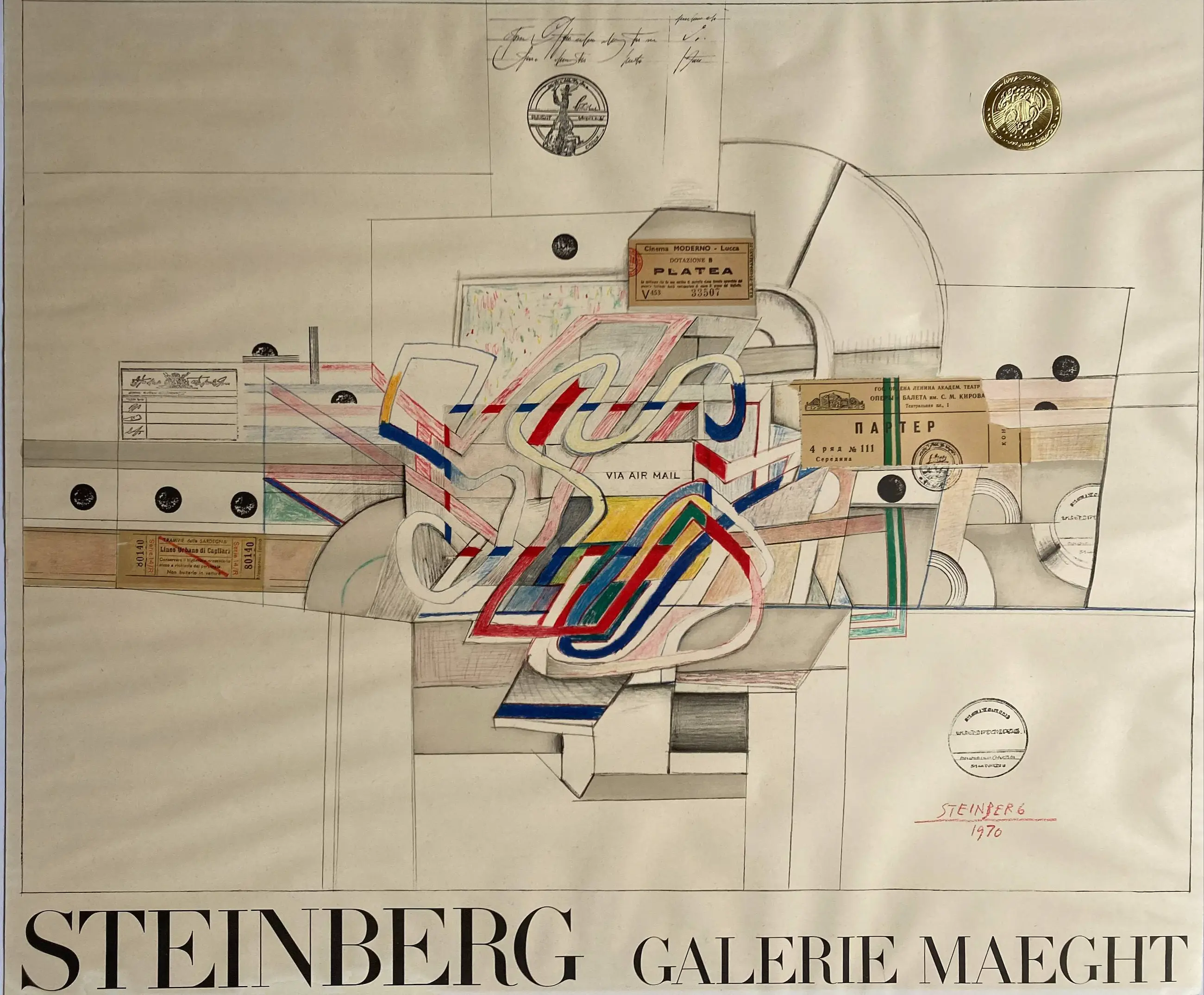 Lithografie van Saul Steinberg, uitgebracht door Galerie Maeght. Gesigneerd in de druk. Met goudkleurige afzonderlijk opgedrukte zegel. De lithografie heeft hobbels, deze druk je plat bij inlijsting achter glas (lijst niet inclusief).