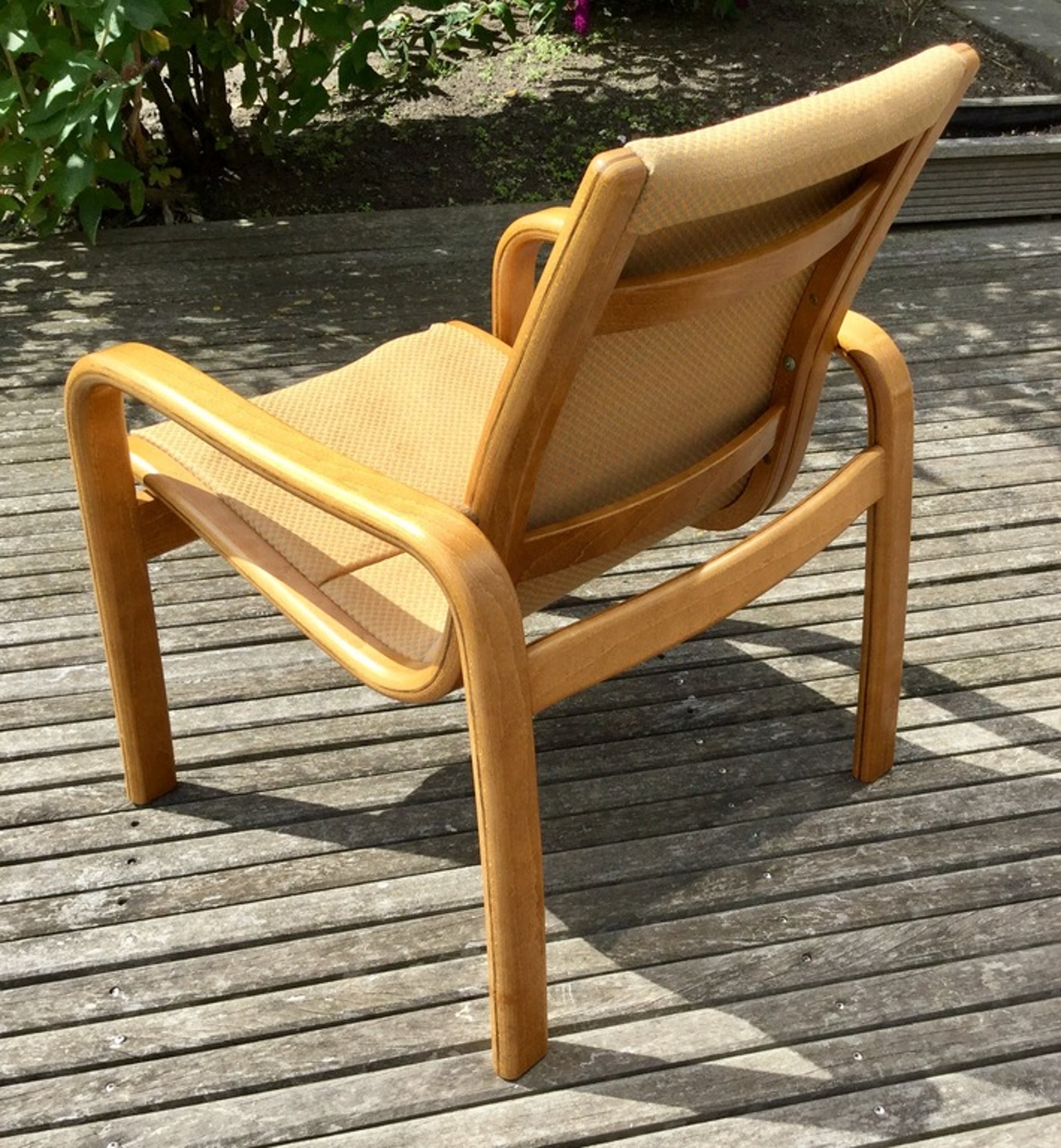 Een kleinere variant op de Lamino (1956), deze comfortabele leunstoel van ontwerper Yngve Ekström (Zweden, 1913-1988)