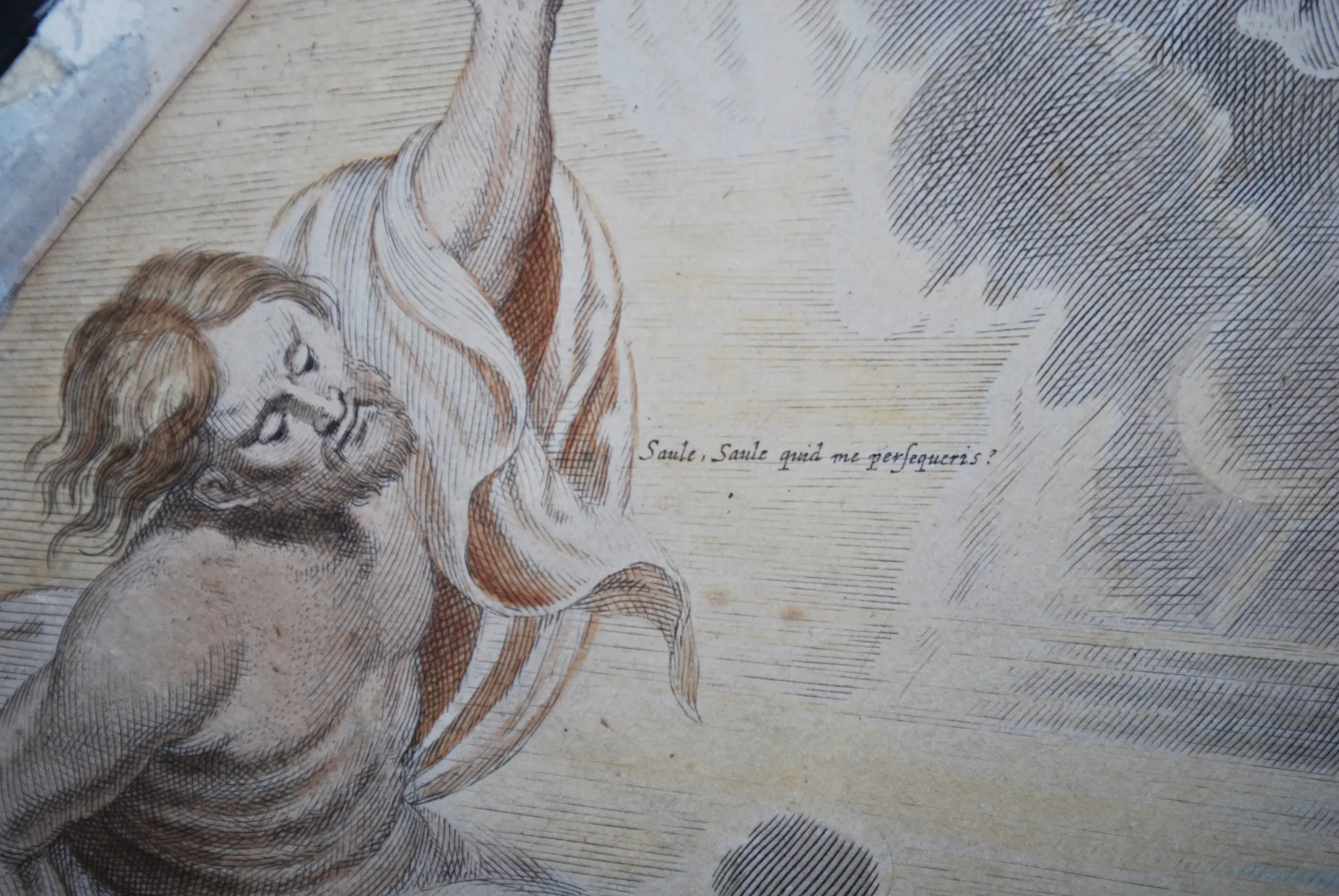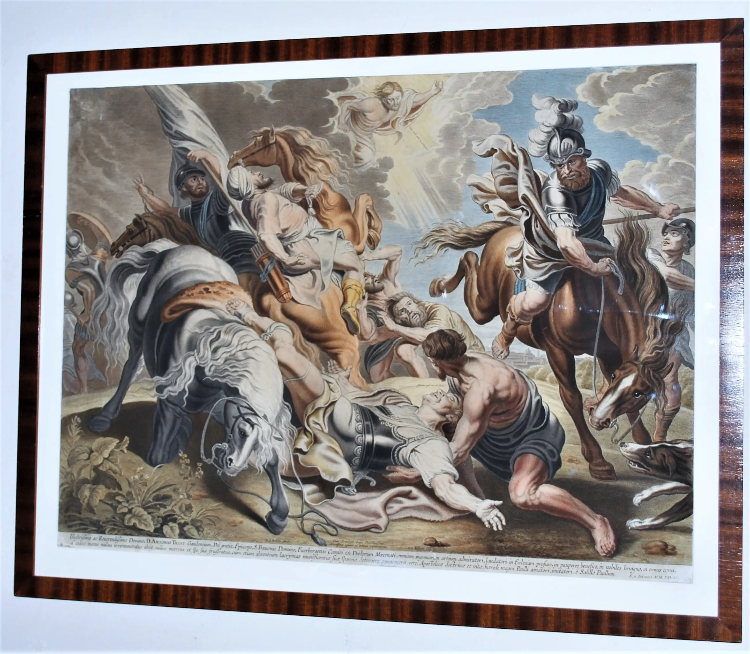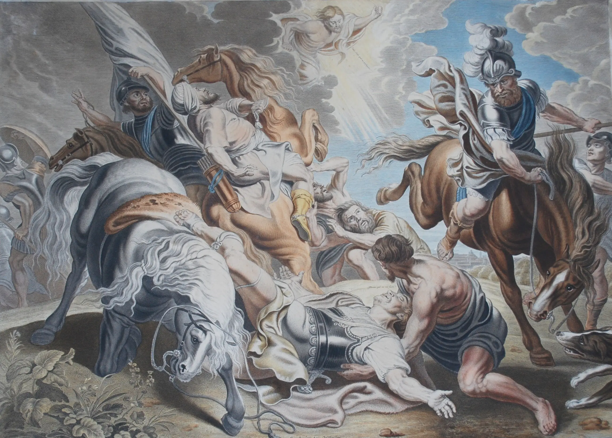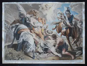 Saulus is een Joodse Christenvervolger die zich bekeerde en als Paulus de 'apostel der heidenen' werd. Toen hij naar Damascus reisde kreeg hij een visioen, de geestesverschijning die hij waarnam, maakte zich bekend met de woorden: 'Ik ben Jezus die jij vervolgt'. Paulus valt van zijn paard en verliest voor een aantal dagen het zicht ten gevolge van het visioen. Steigerende paarden die hun ruiters afwerpen, zijn een terugkerend motief bij Rubens. Rubens liet zich voor de voorstelling inspireren door Italiaanse meesters als Caravaggio. Zowel compositorisch als in details zoals het paard zien we sterke relaties met andere werken van Rubens zoals de jachtstukken die ook hier te zien zijn, of Rubens’ Defeat of Sennacherib. Rubens schilderde minimaal drie werken met dit thema. Deze prent gaat terug op de laatste versie, namelijk een schilderij dat zich in het Kaiser Friedrich-Museum te Berlijn (Duitsland) bevond, maar in 1945 in een brand verloren ging. De gravure is, zoals meer het geval was, opgedragen aan een personaliteit, in dit geval Antoon Triest, bisschop van Gent (onderaan de gravure uitgebreid in latijn beschreven). Het werk is een voorbeeld van volmaakt meesterschap.