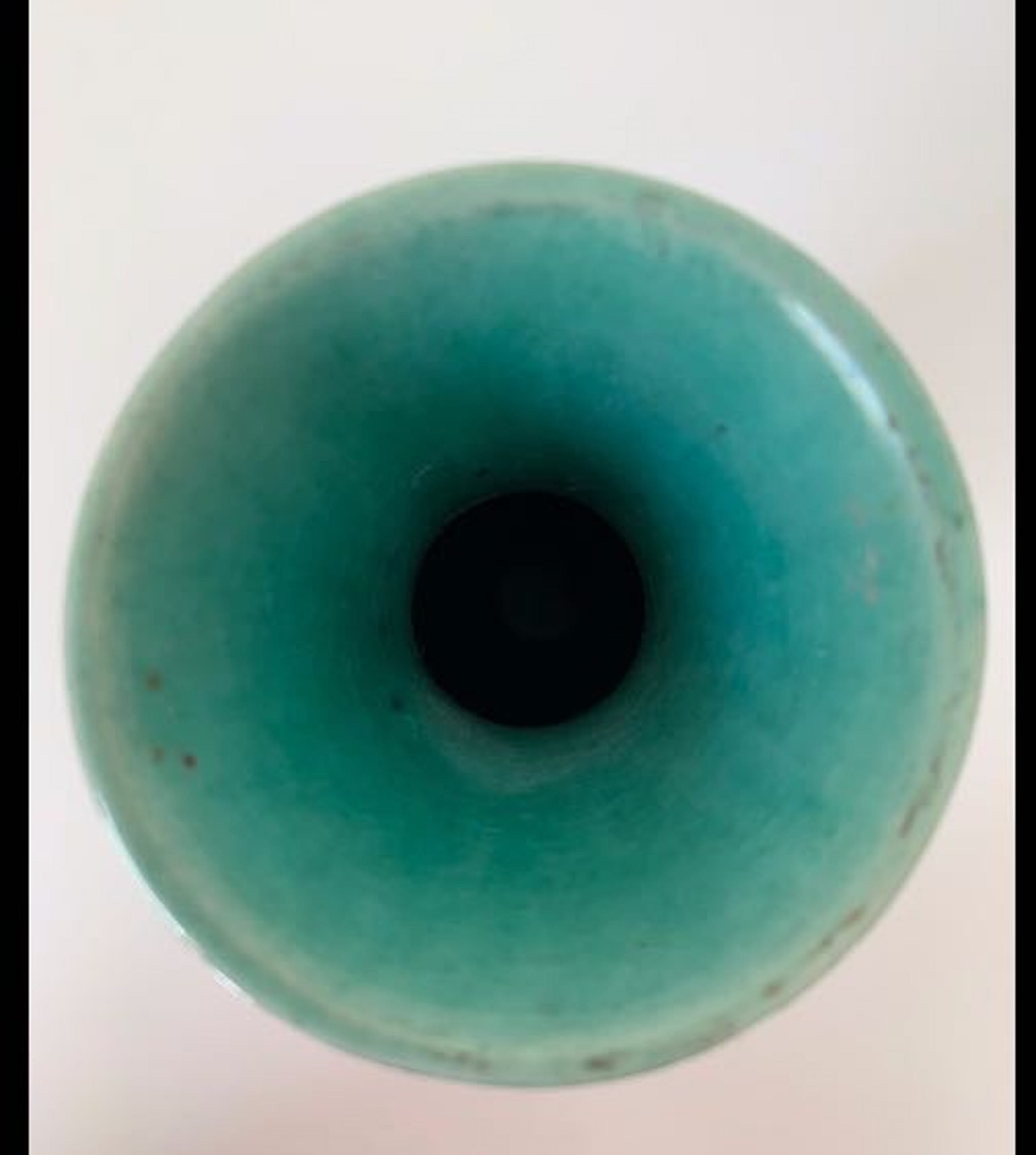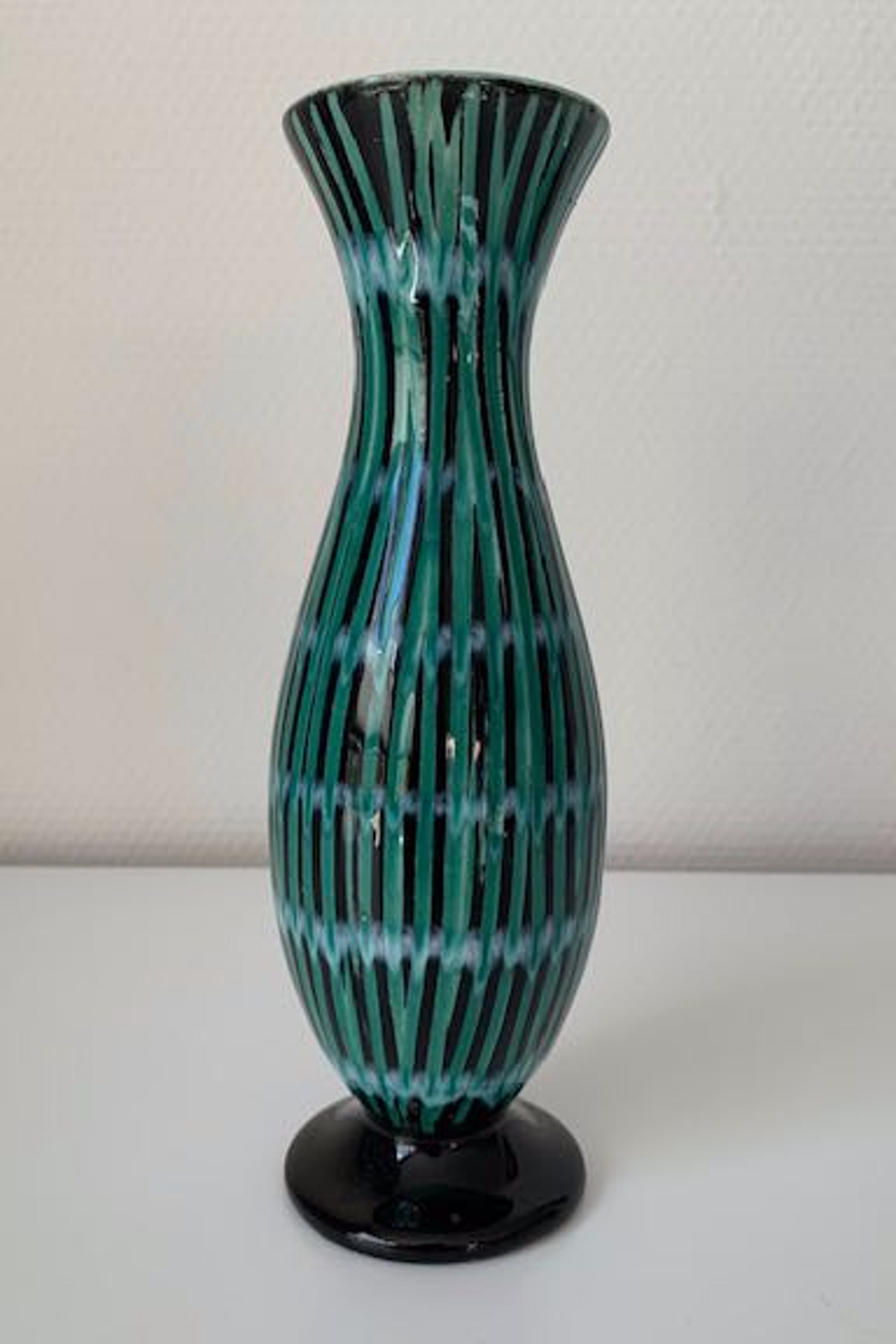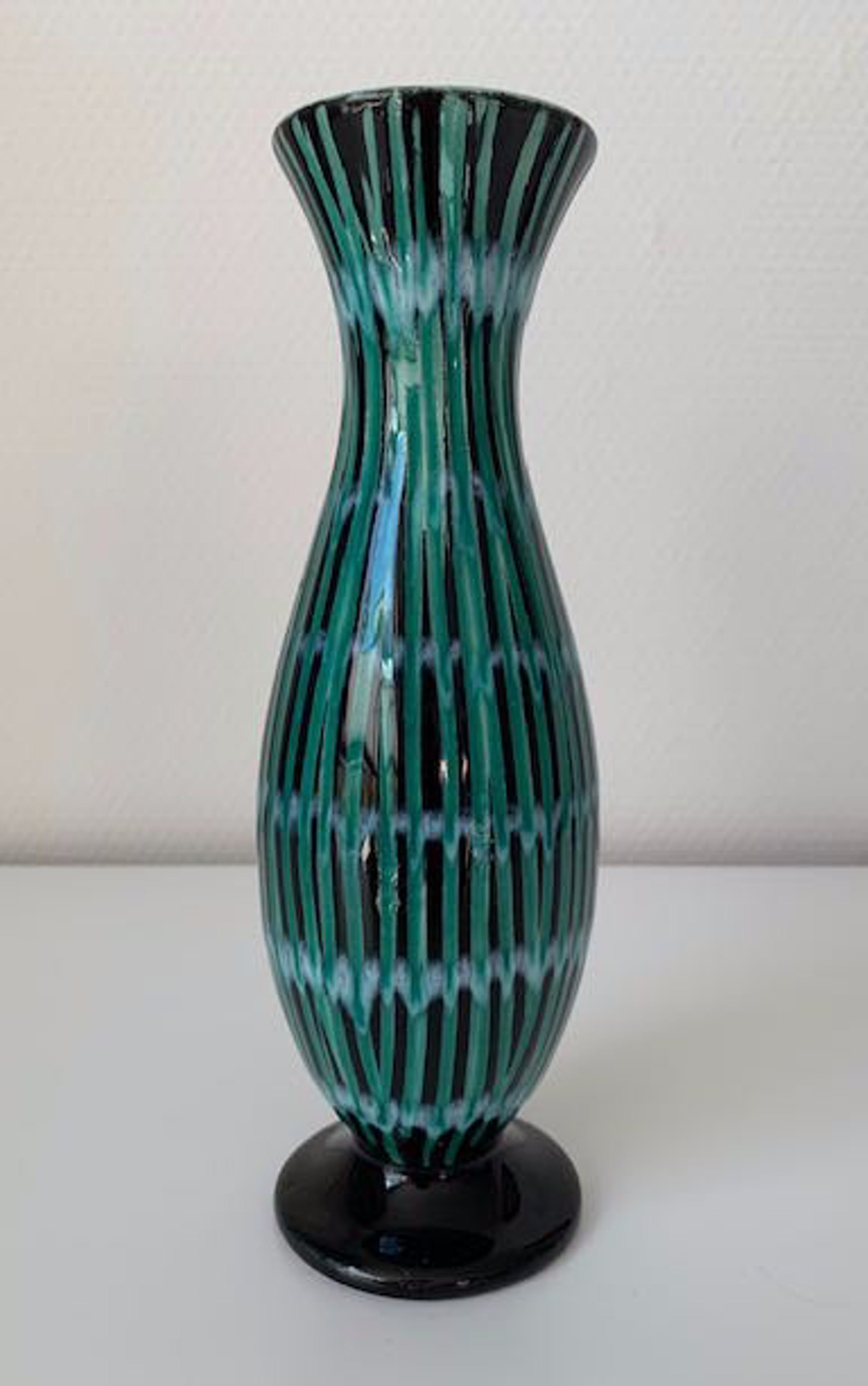 Vintage vaasje met bamboe decor in de kleuren turquoise en zwart.