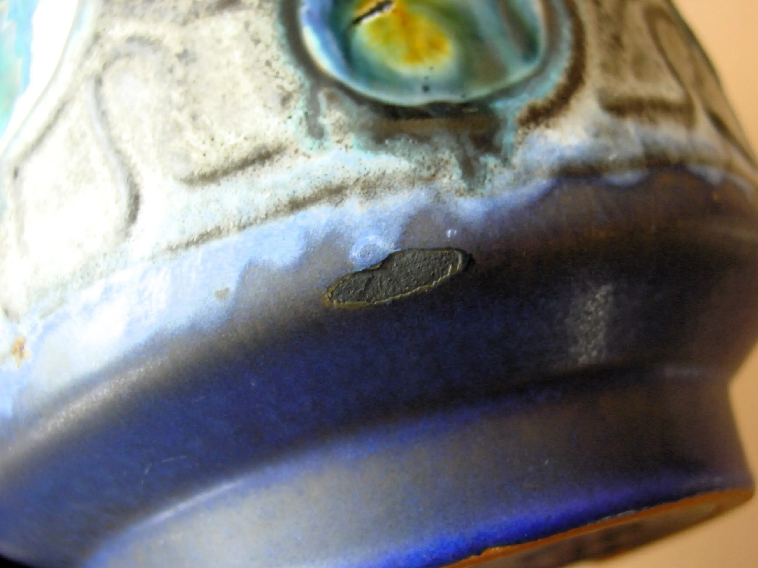 Bevat meerdere beschadigingen aan het glazuur, aan de onderzijde en aan één zijde van het handvat.