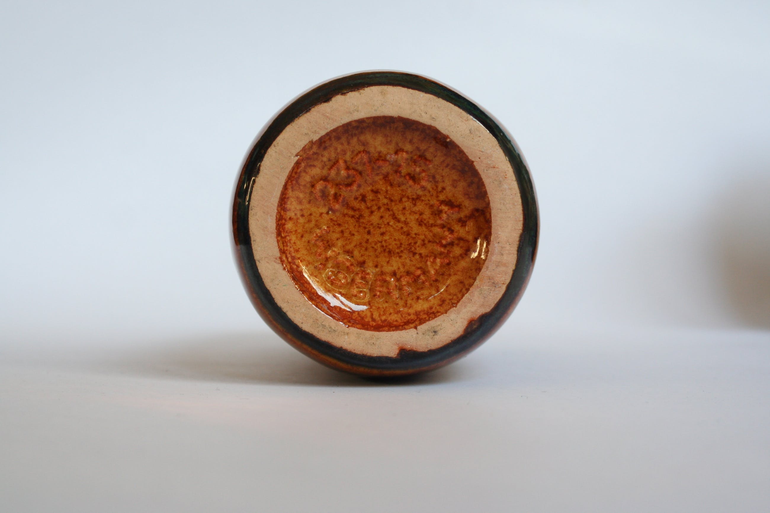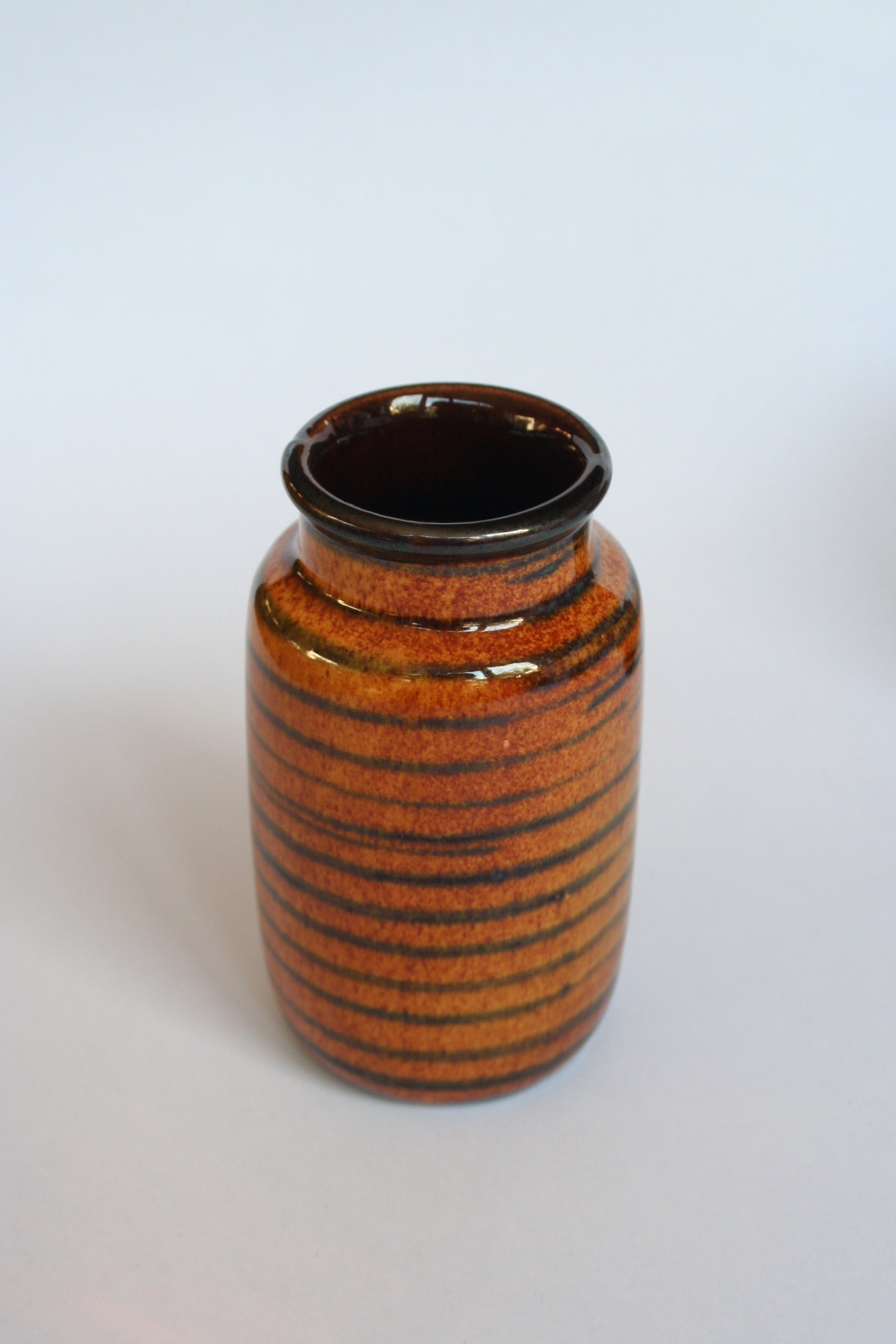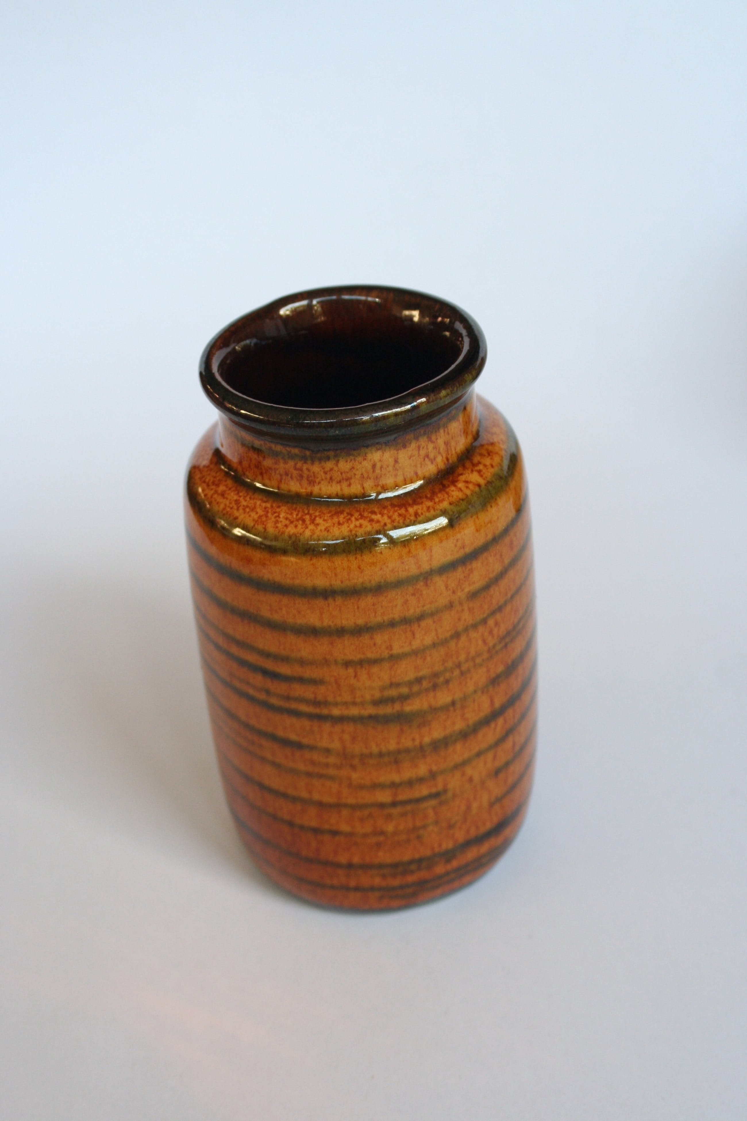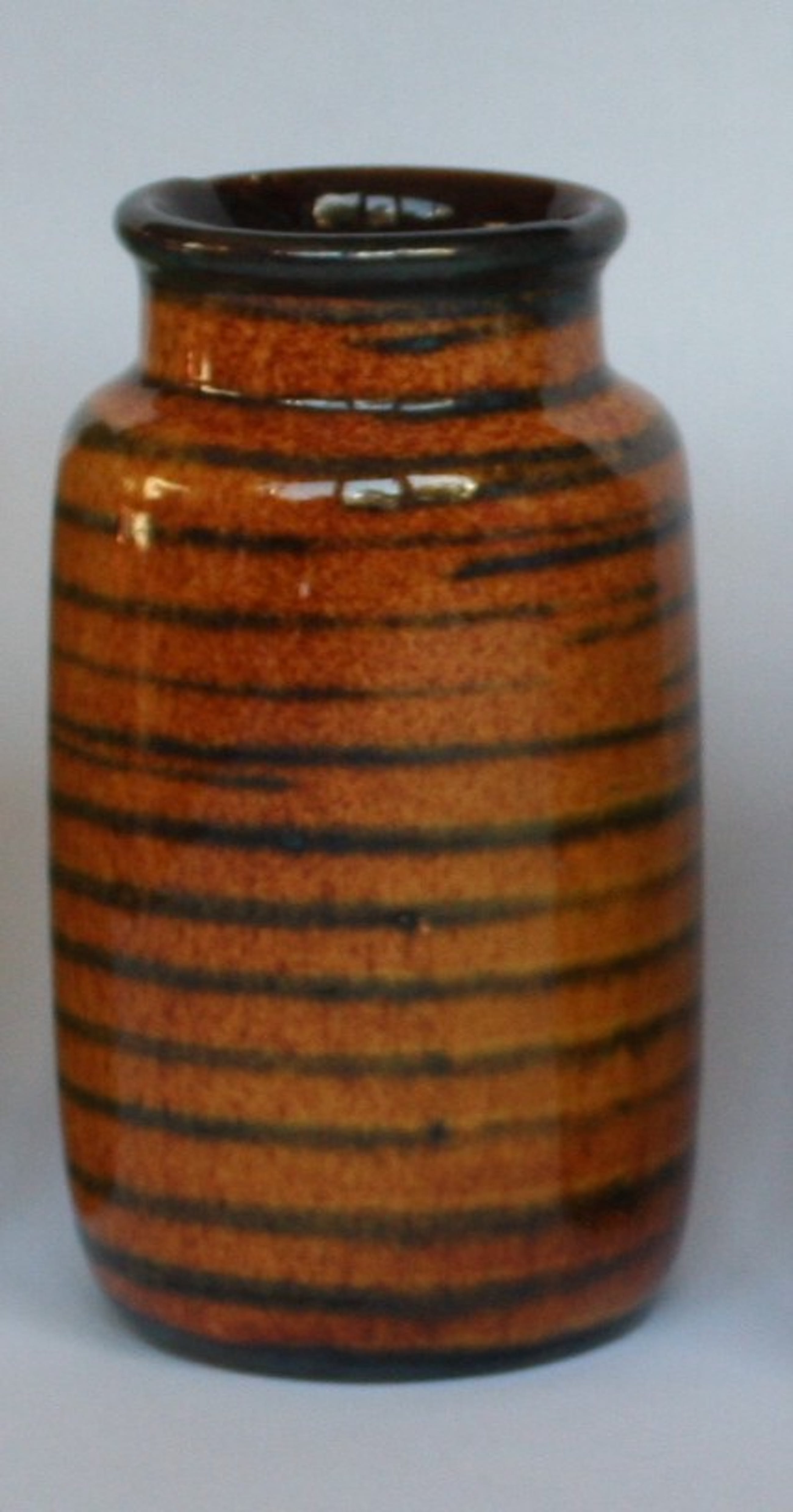 Wordt goed verpakt verzonden. Model 285-15. Hoogglans glazuur met rood / oranje / gele tinten. Horizontale lijnen.