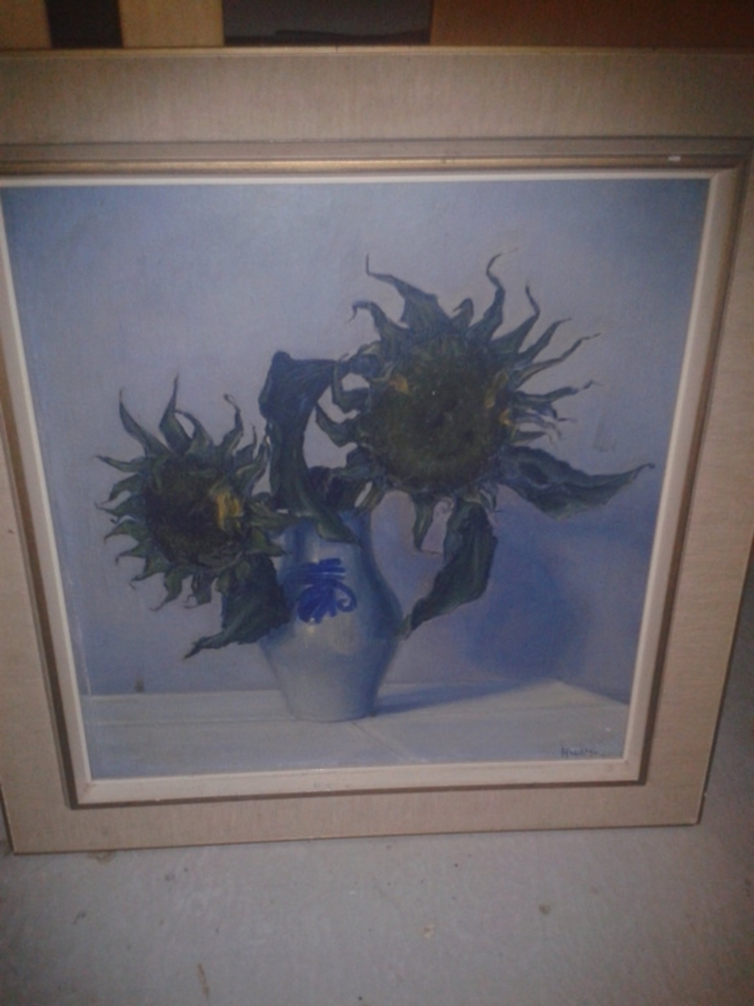 Voor schilderijen en ander ingelijst werk geldt het volgende: bij verzending kan ik geen garanties geven op het heel overkomen van het glas van een lijst, wel zal ik mijn uiterste best doen het werk zo goed mogeljik te verpakken. Kleine gebreken aan de lijst in de vorm van stootplekjes en krassen vermeld ik niet.