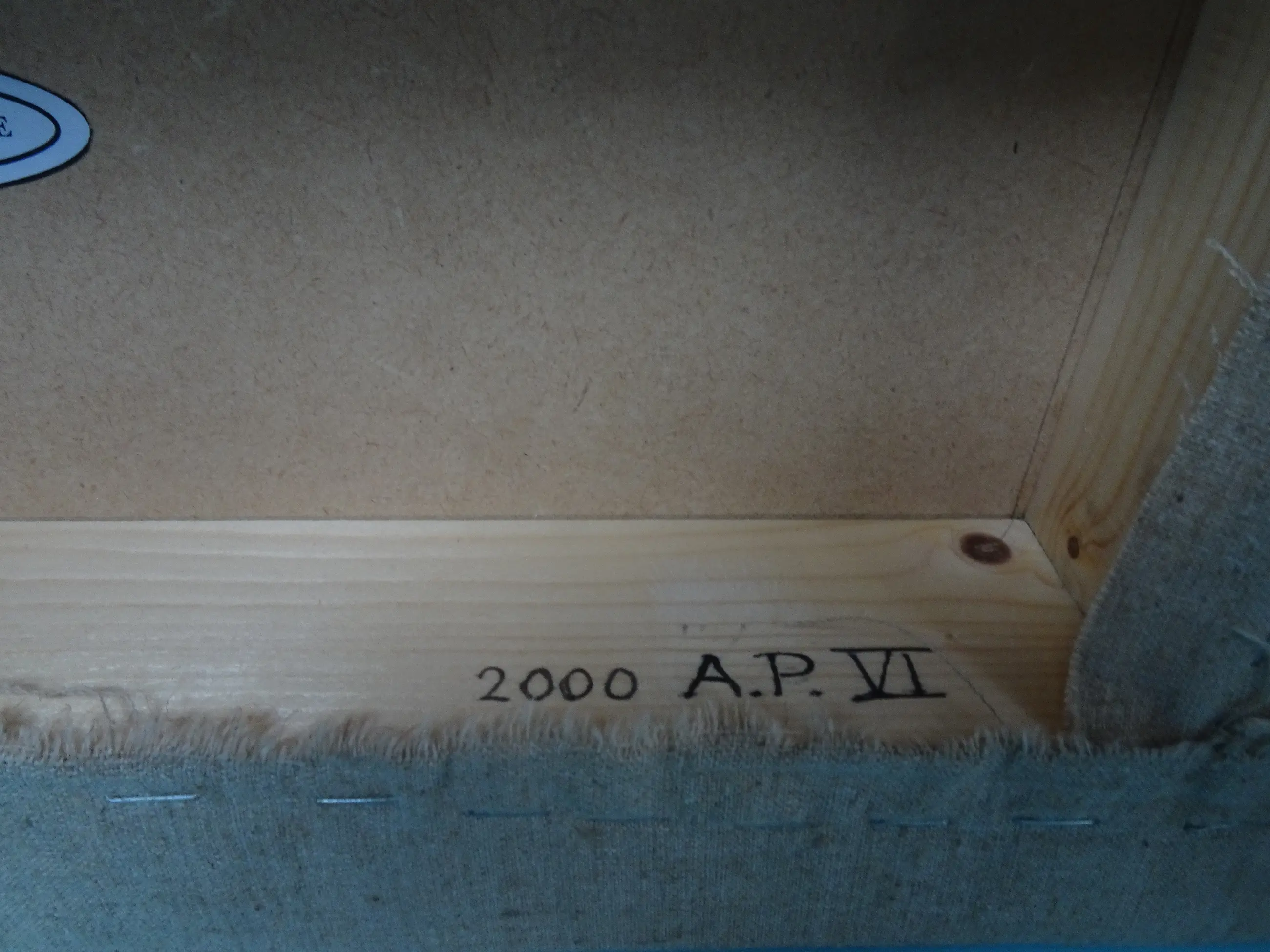 Digitaal bewerkte foto van het bekende kunstenaarsduo Schilte & Portielje. Het is een multiple bestaande uit een houten frame, bespannen met wit geverfd canvas en daarop bevestigt de foto. Aangezien de multiple (VI AP) een dikte heeft van 4 cm, kan het kunstwerk aan de muur hangen maar ook rechtop in de ruimte gezet worden. Het werk zit ter bescherming in een fraaie jute zak. Alles is in perfecte staat, heeft altijd in de jute beschermtas gezeten.