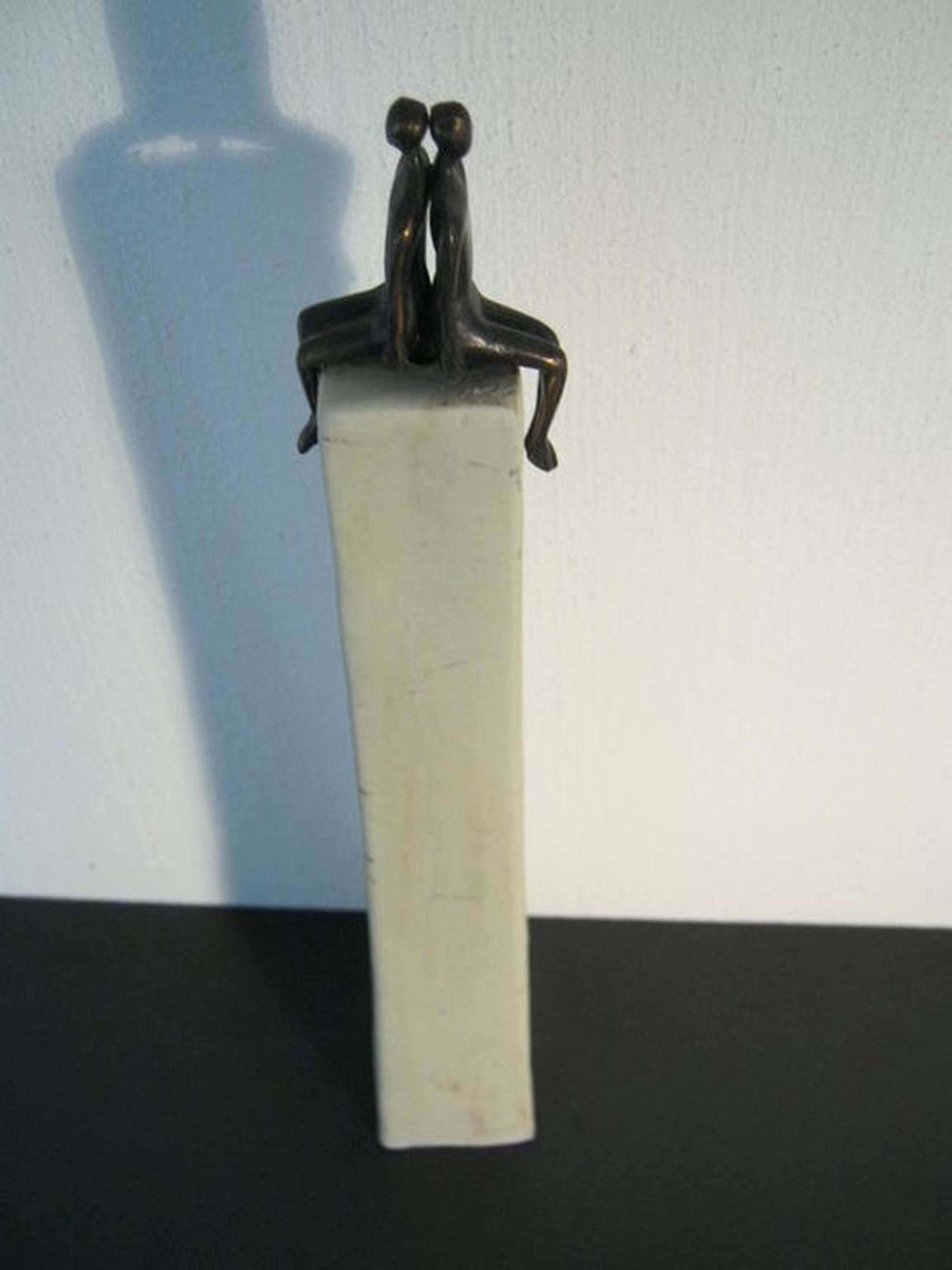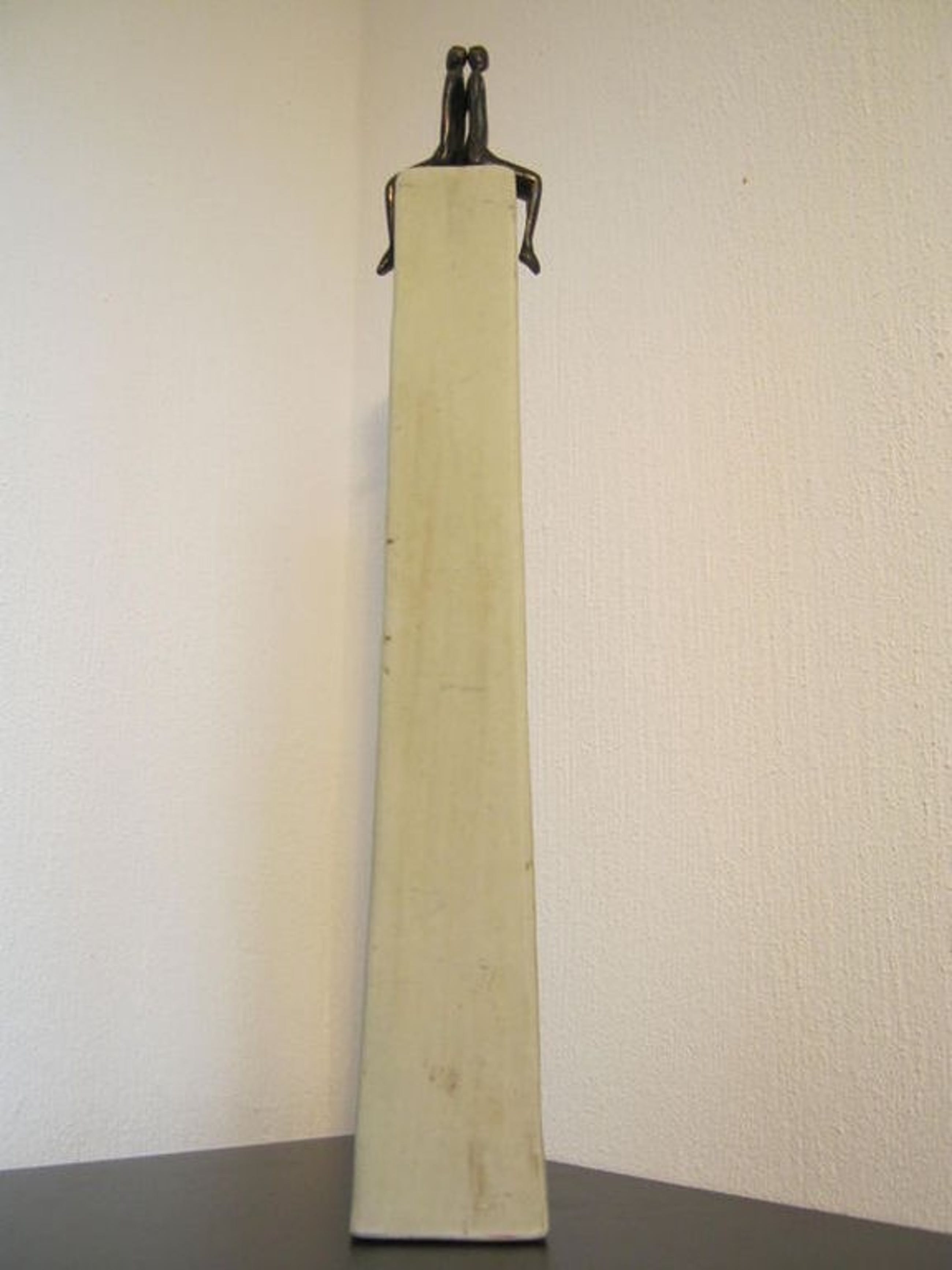 Sculptuur van twee Bronzen figuurtjes op hoge sokkel van Keramiek.