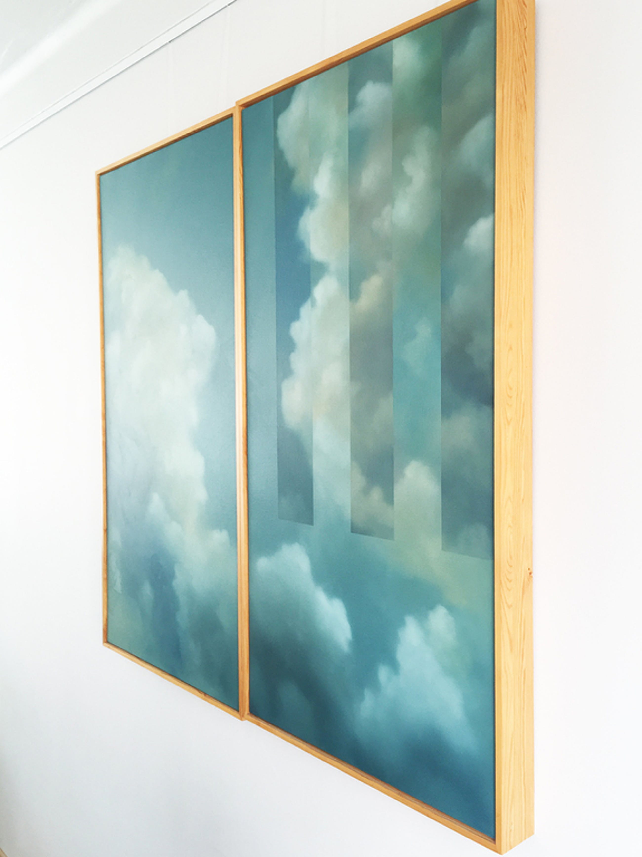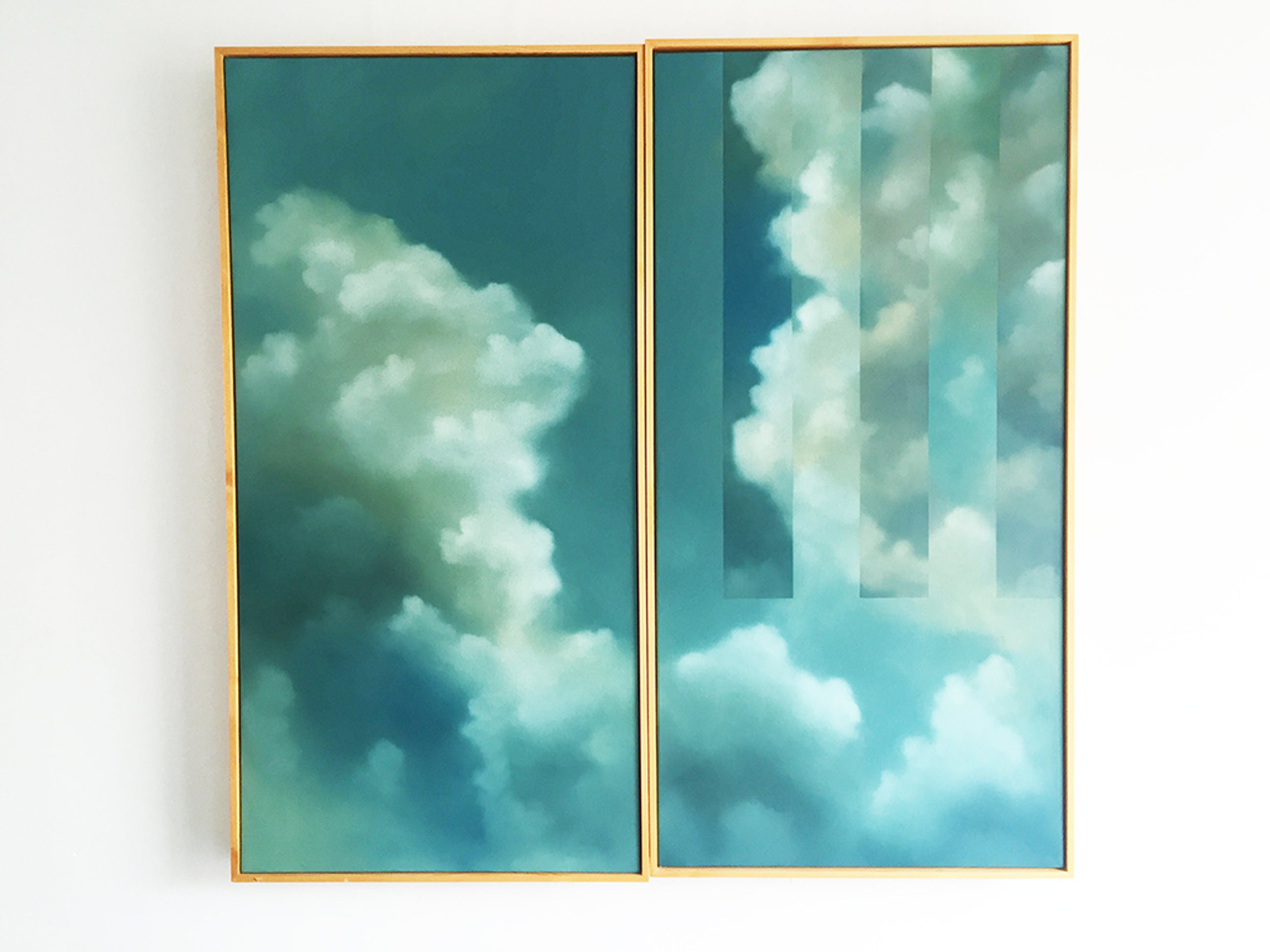 Sebastiaan Spit (1958 - ) "Tweeluik Wolken" Schilderijen/Olieverf op doek (2003). H120 x B60 per doek. H120 x B120 totaal.