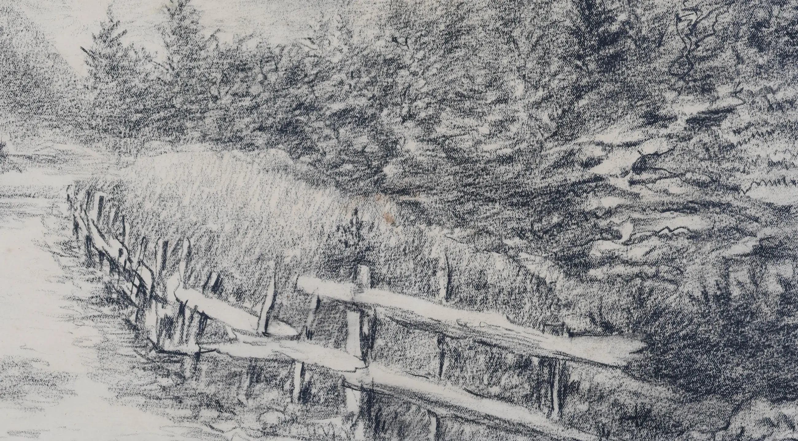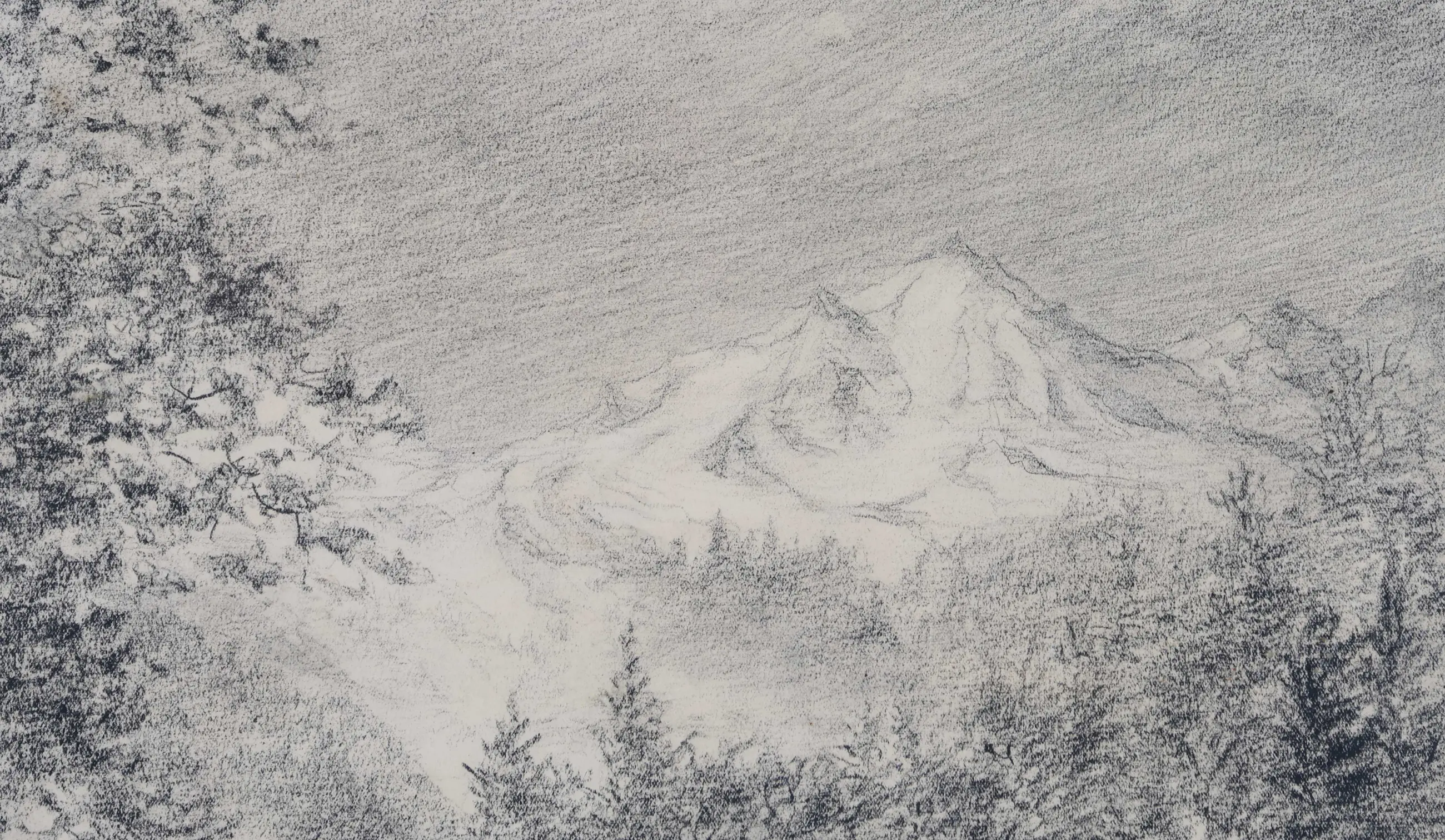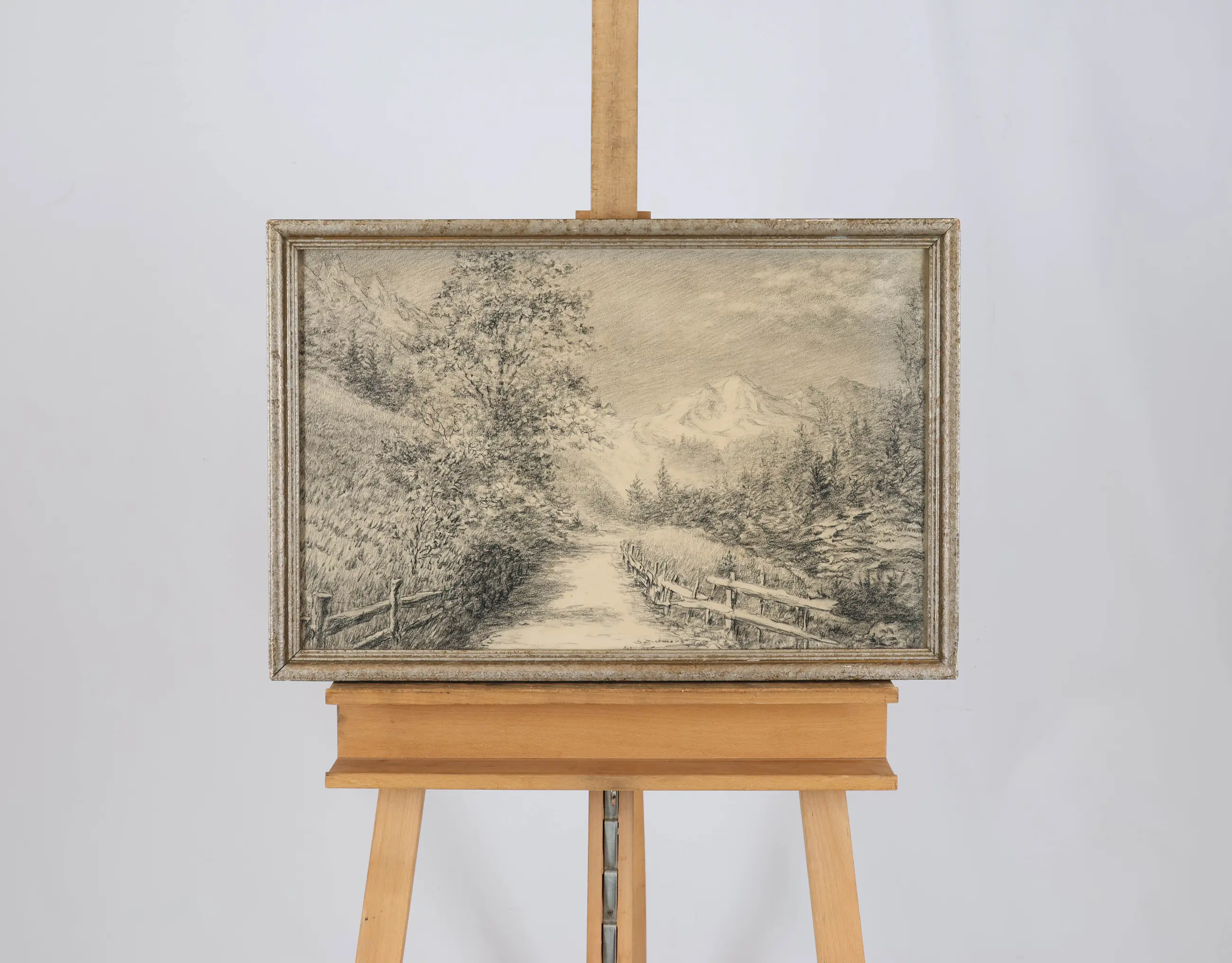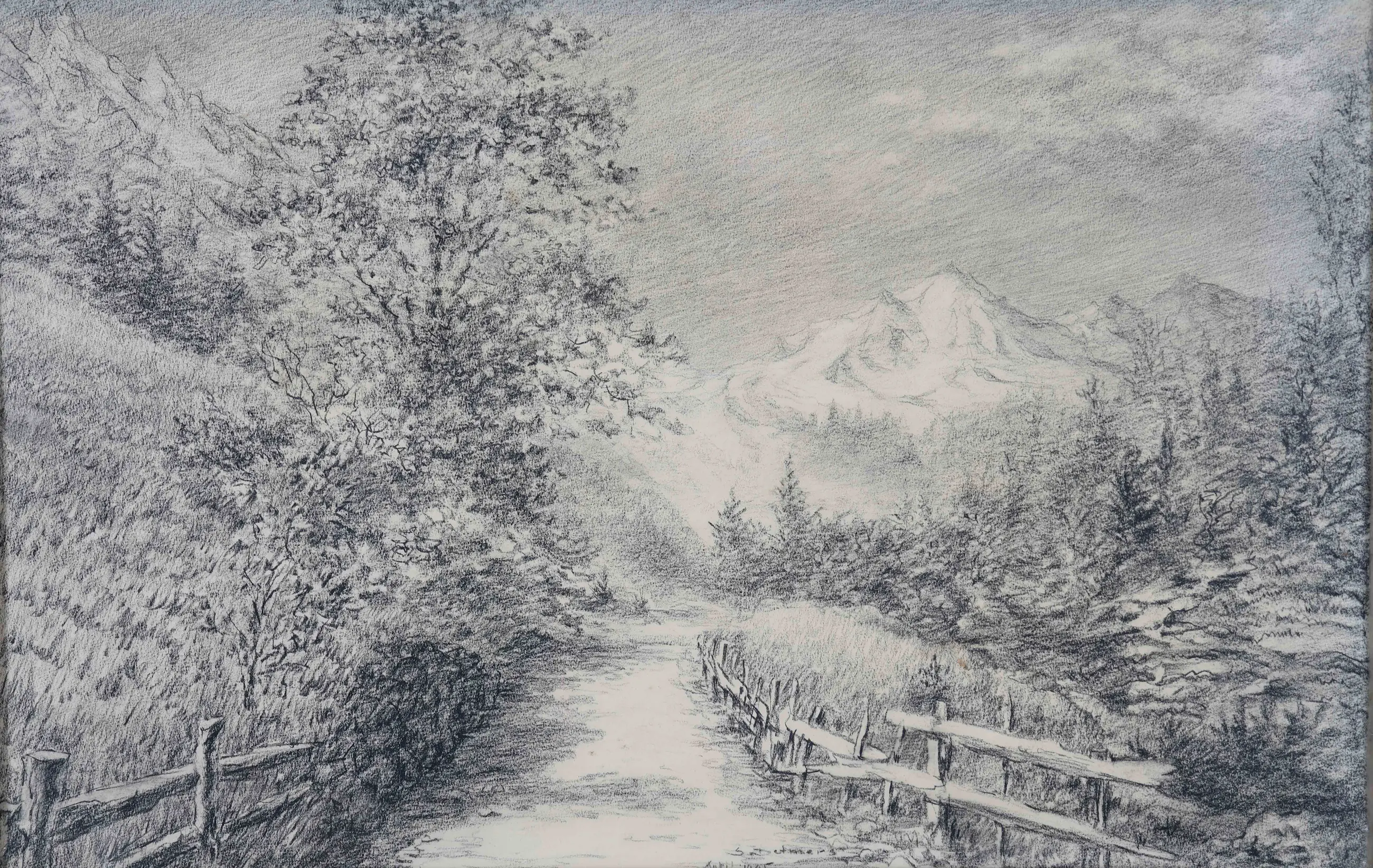 Dit werk toont zijn vaardigheid als tekenaar. In deze potloodtekening brengt Detmers een berglandschap tot leven met subtiele schakeringen in grijs en wit. Een rustig pad slingert tussen bomen en houten hekken richting de met sneeuw bedekte bergtoppen in de verte. De fijnzinnige lijnvoering en zachte arceringen geven het tafereel een serene, bijna dromerige sfeer. Het werk ademt stilte en natuurkracht, en laat zien hoe Detmers, ook zonder kleur, zijn gevoel voor licht, diepte en compositie meesterlijk wist te behouden.
