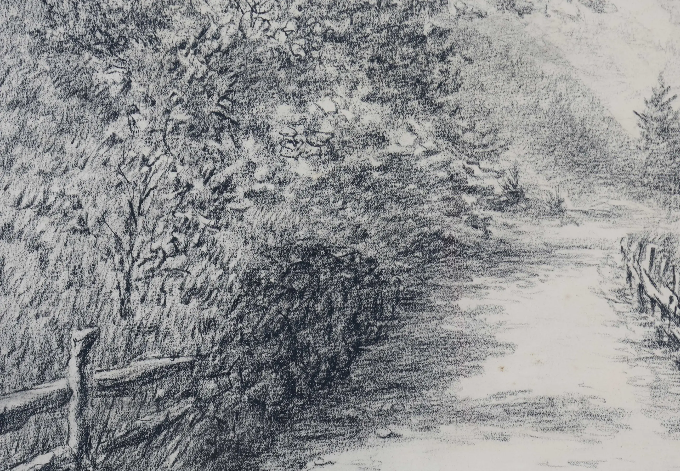 Deze houtskooltekening is in het midden onder gesigneerd. De lijst heeft een paar beschadigingen.