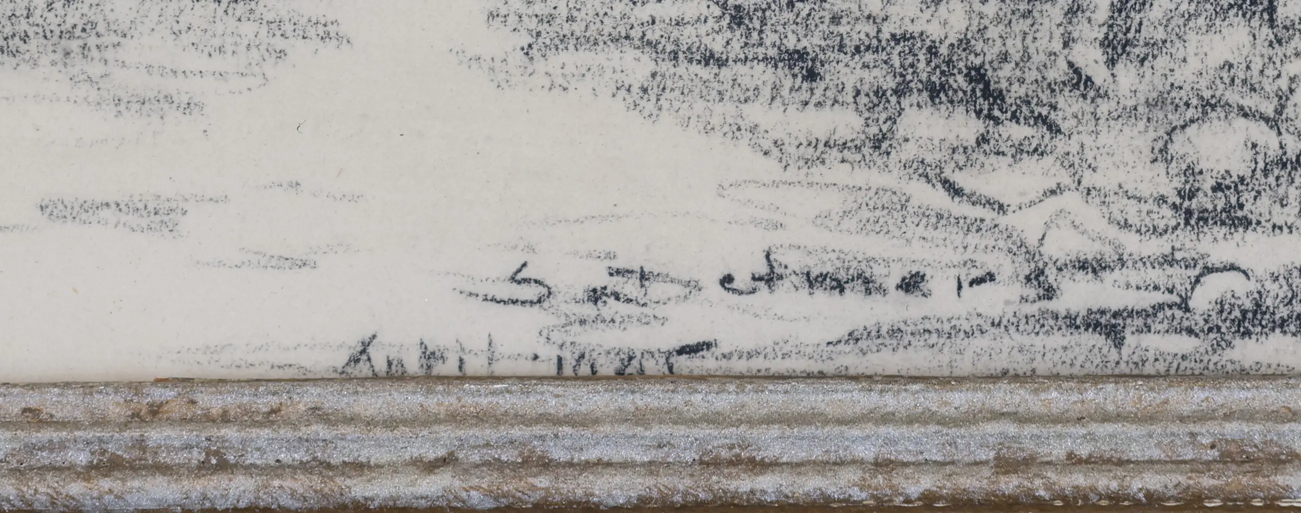 Deze houtskooltekening is in het midden onder gesigneerd. De lijst heeft een paar beschadigingen.