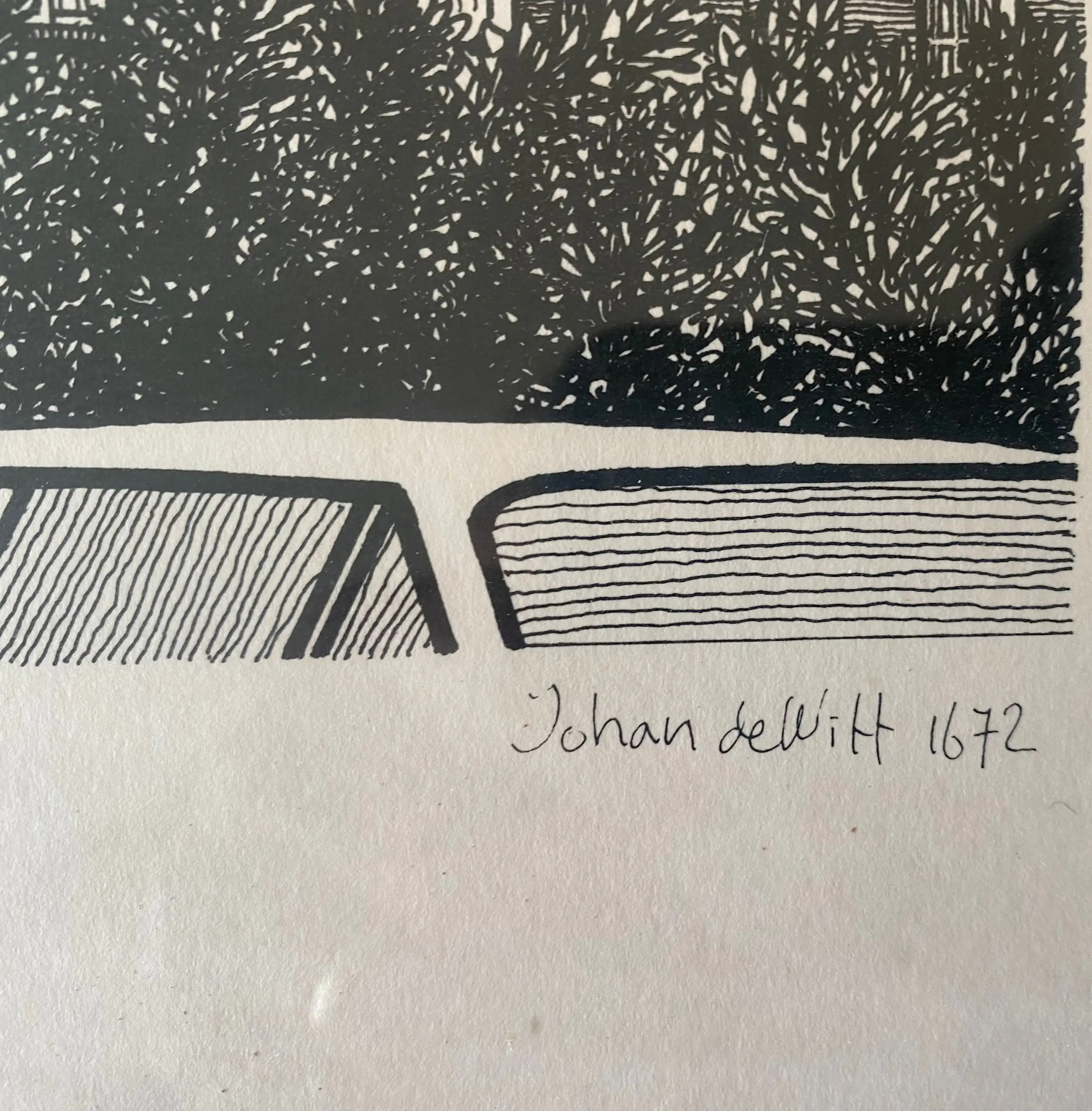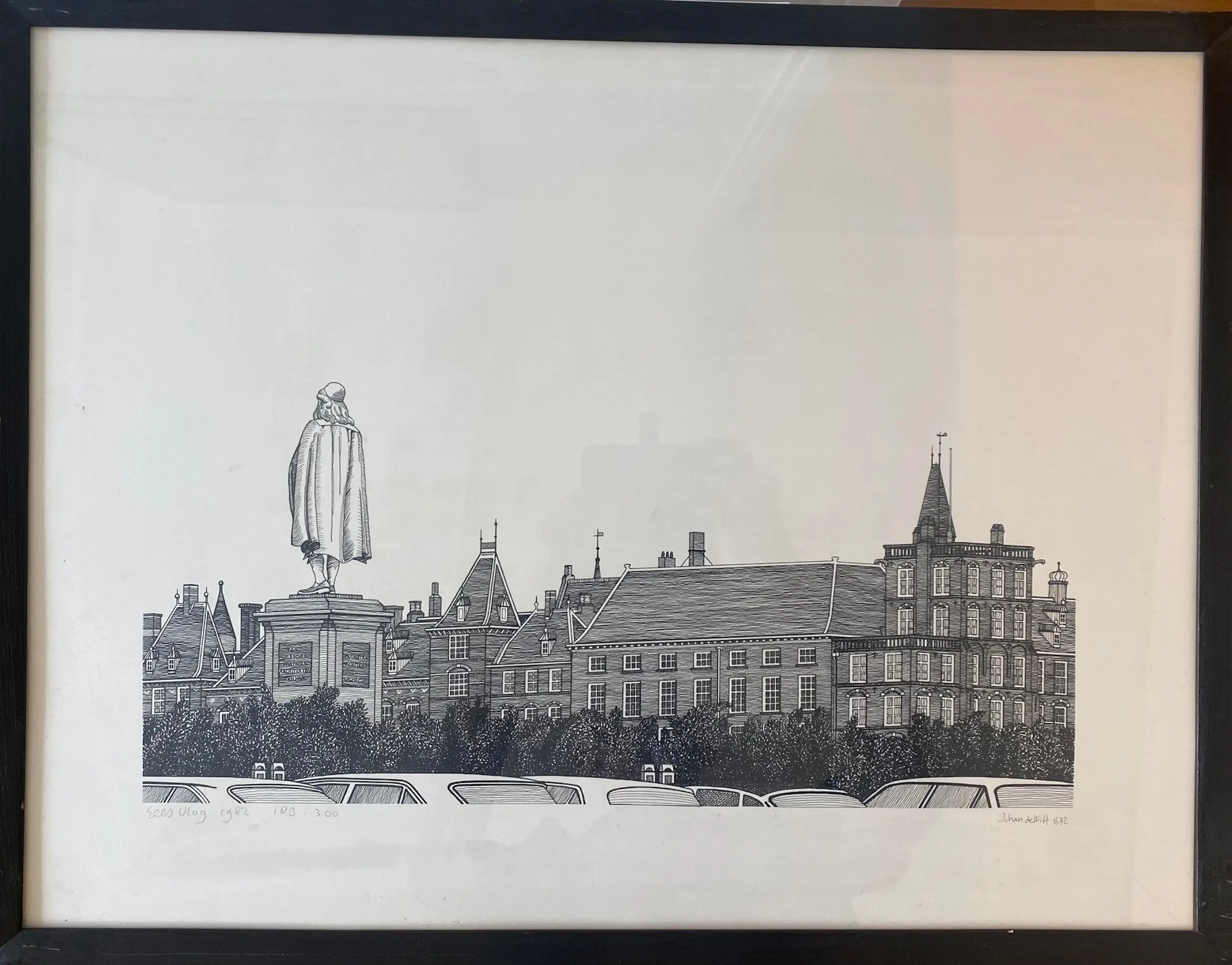 Werk in zwart wit. Standbeeld van Johan de Witt op de Plaats in Den Haag met zicht op het Binnenhof complex