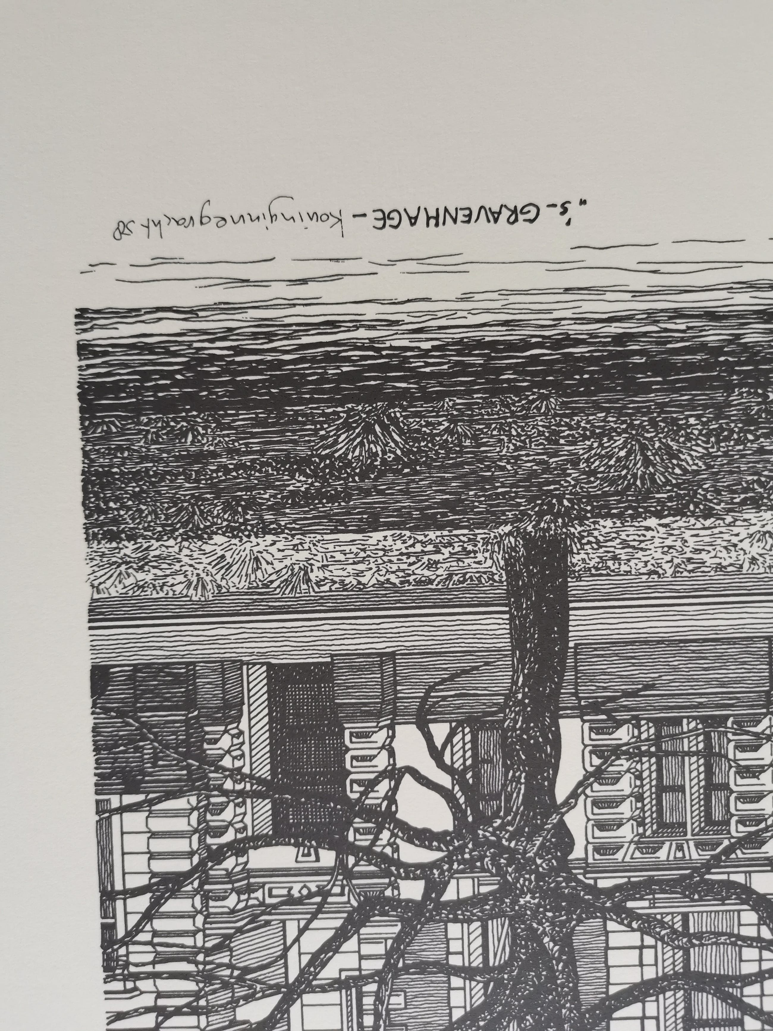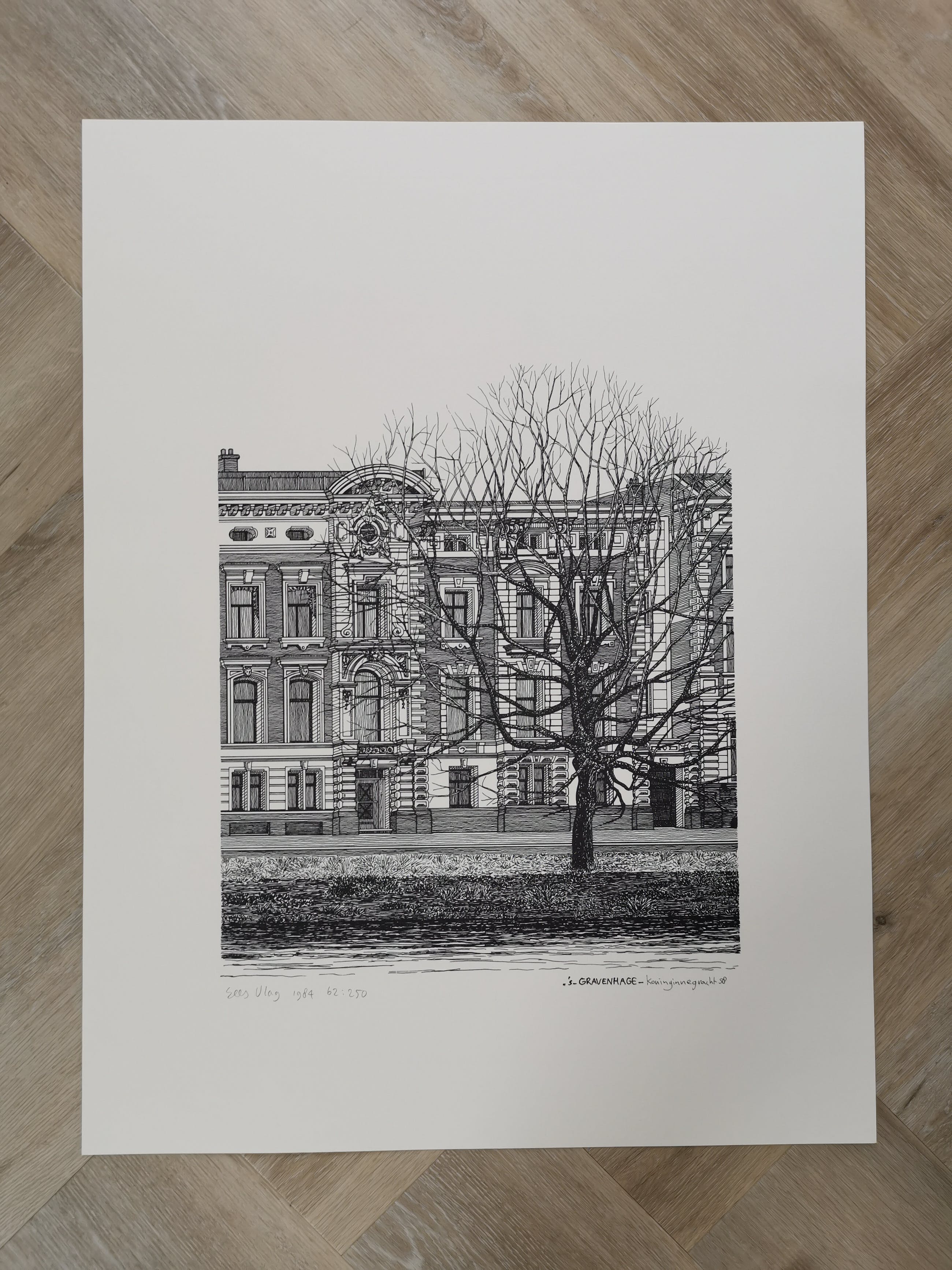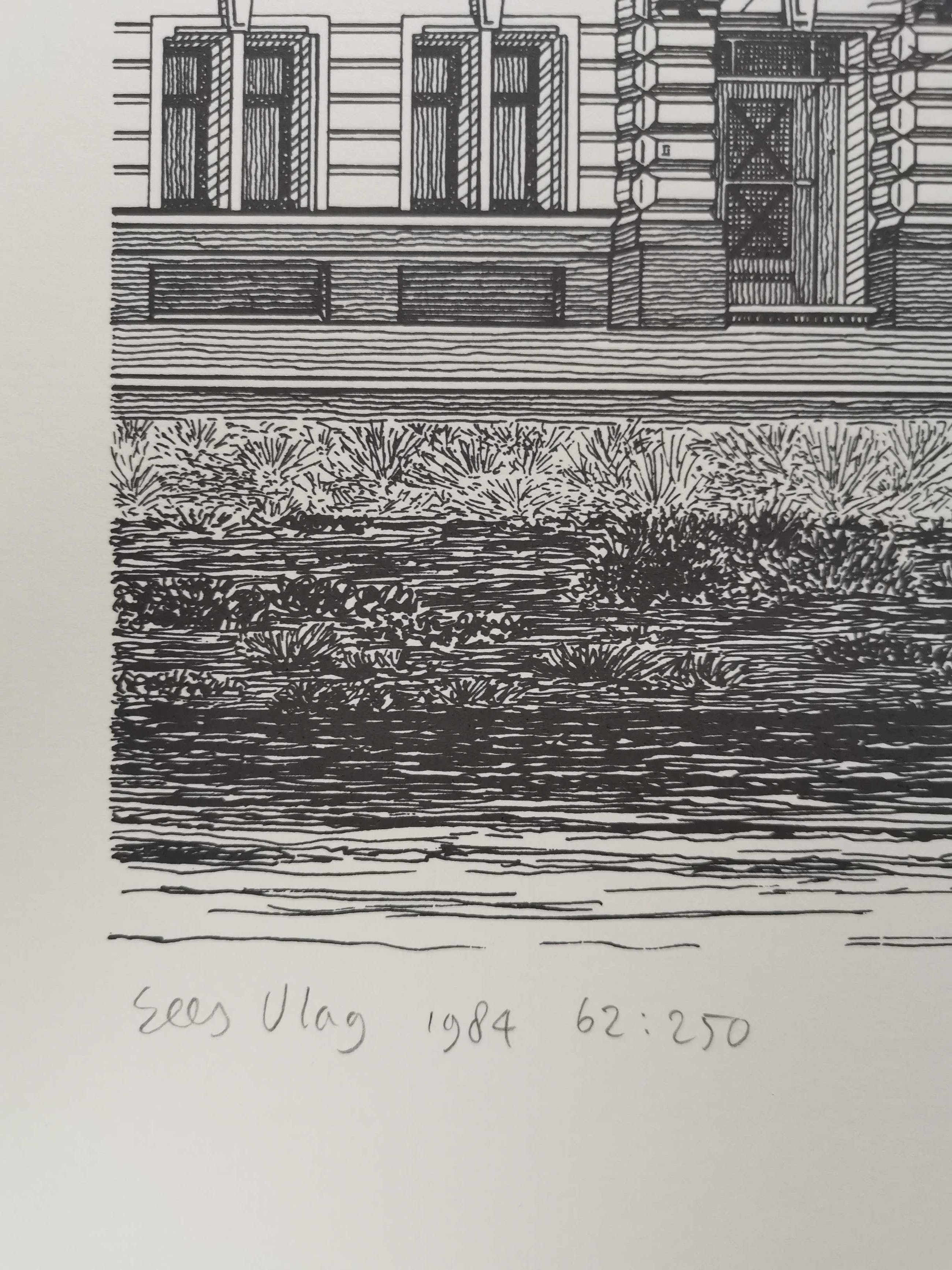 Zeefdruk in zwart/wit door Sees Vlag. Voorstelling van de Koninginnegracht 58 Den Haag. bladmaat 50x65 Linksonder gesigneerd, gedateerd en genummerd in potlood: 'Sees Vlag 1984 62/:250'