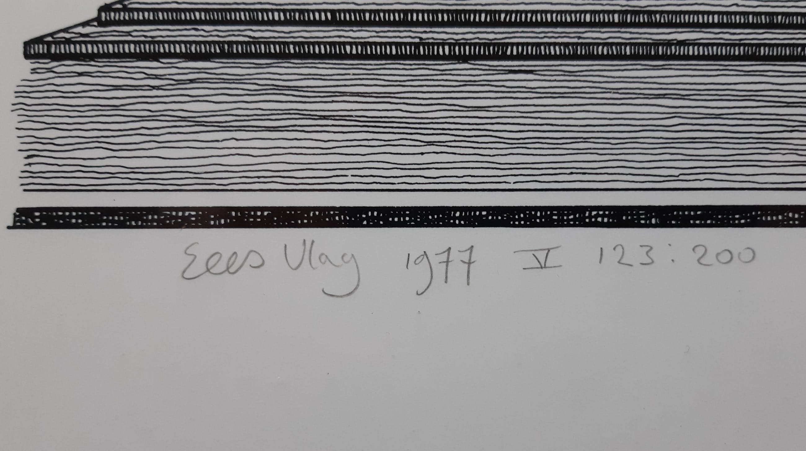 Fraaie zeefdruk van Sees Vlag. Het werk is linksonder gesigneerd, gedateerd V 1977 en genummerd 123 : 200. Ingelijst in een witte lijst. Zeefdruk en lijst in uitstekende staat. Het werk kan zonder kosten worden opgehaald in Breda of op kosten van de koper aangetekend worden verzonden, waarbij het risico van glasbreuk, ondanks zorgvuldige verpakking, bij de koper berust.
