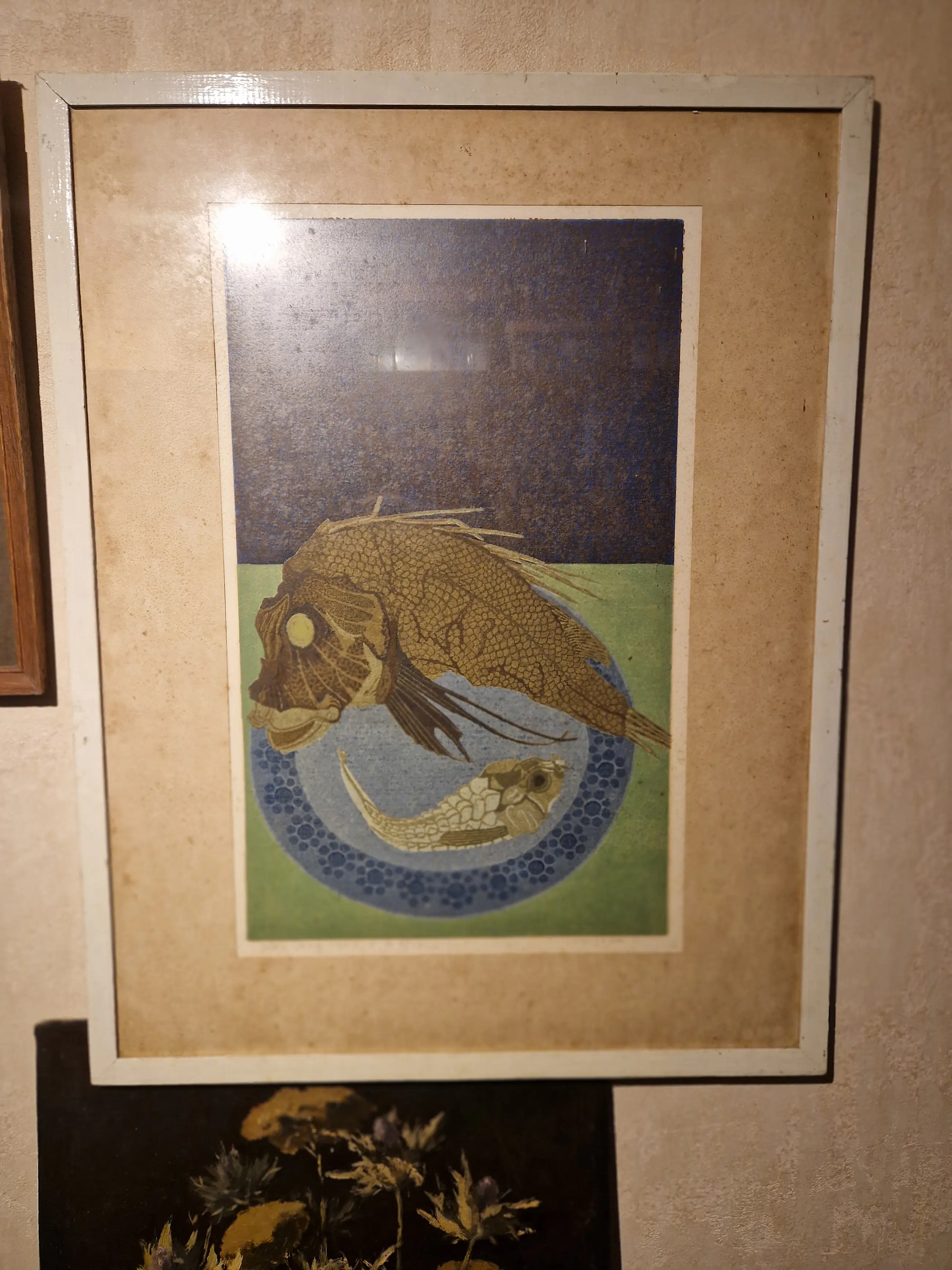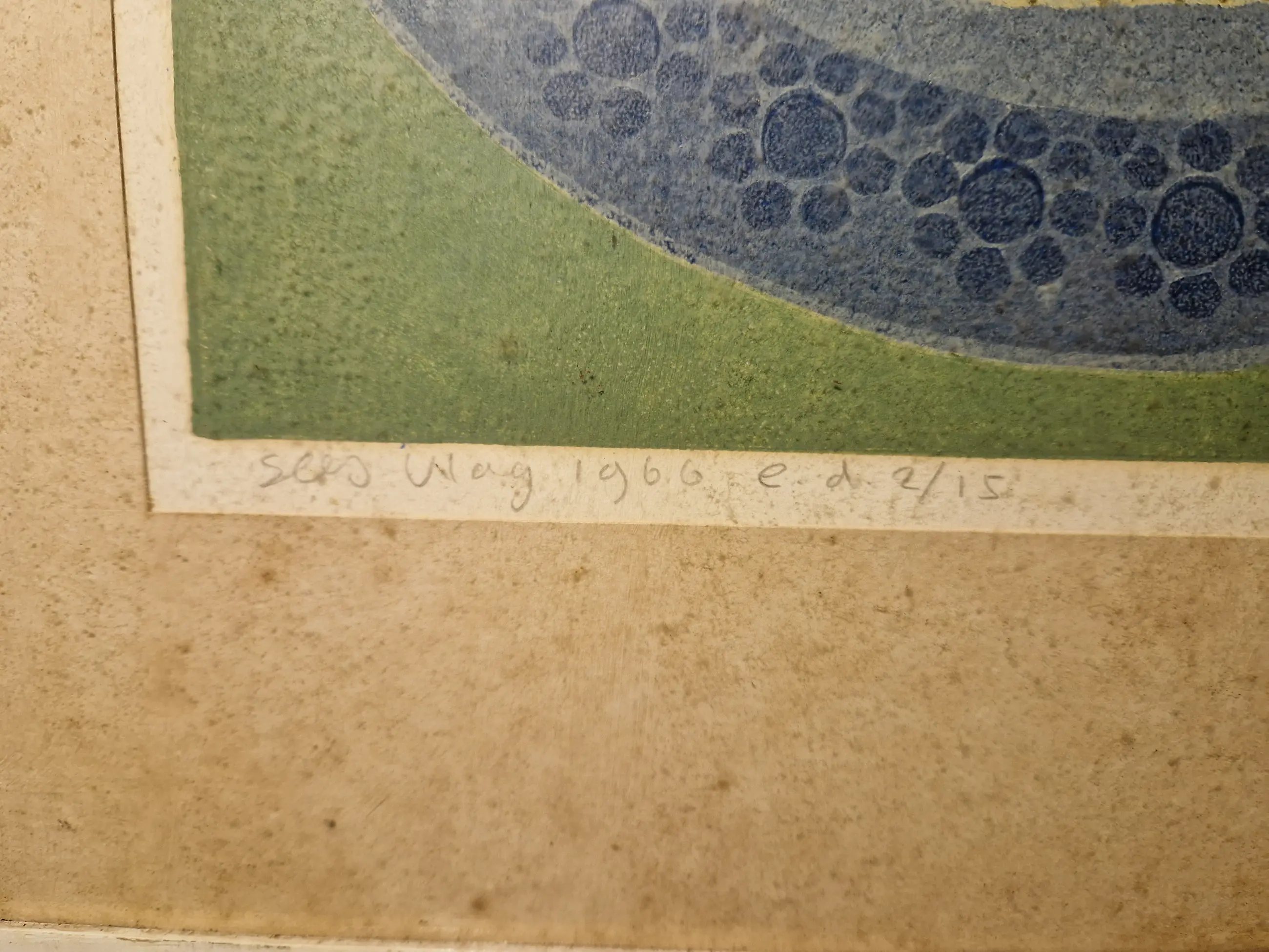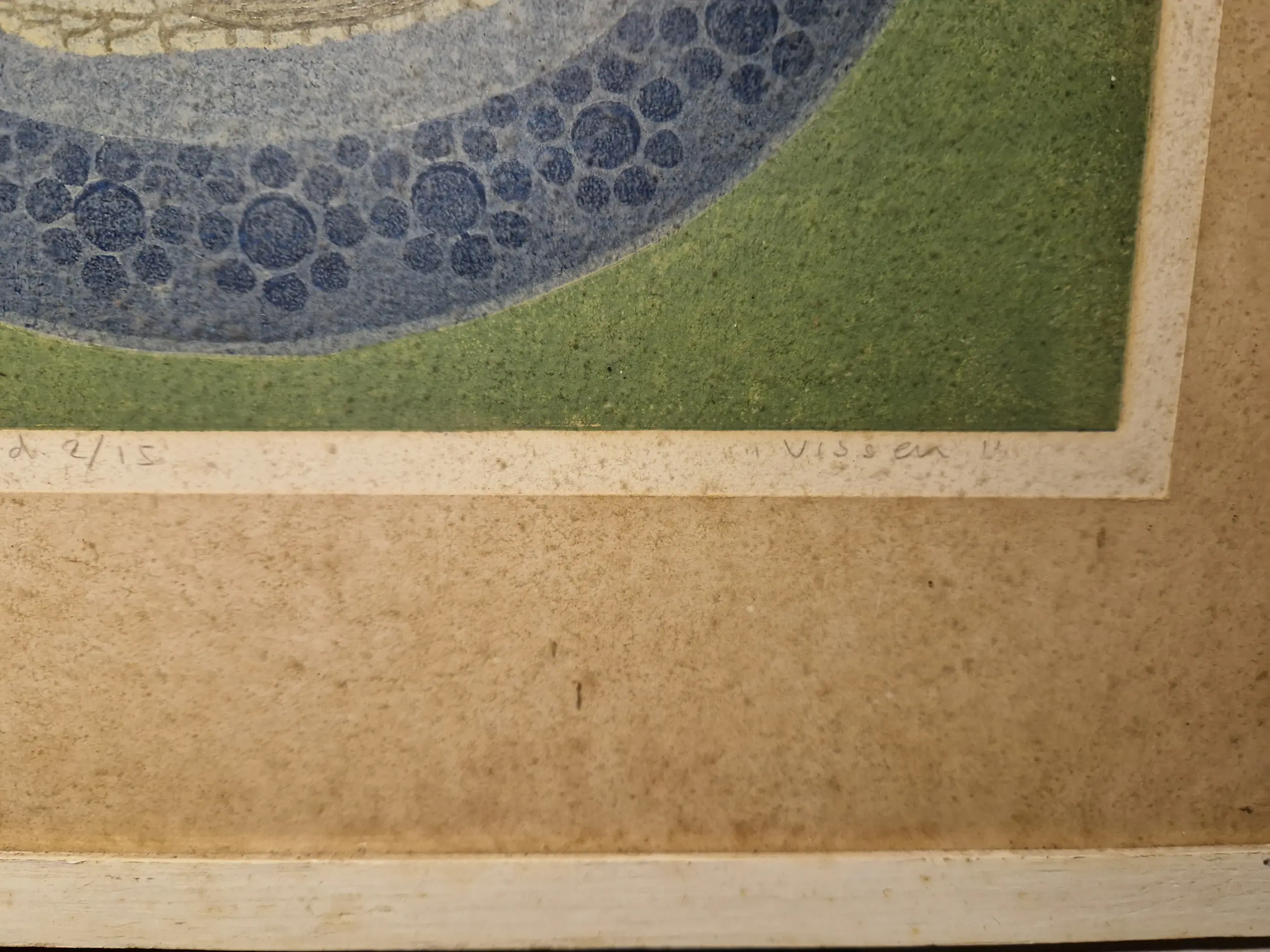 Zeefdruk is in goede staat. Passe partout is vlekkerig. Unieke vondst