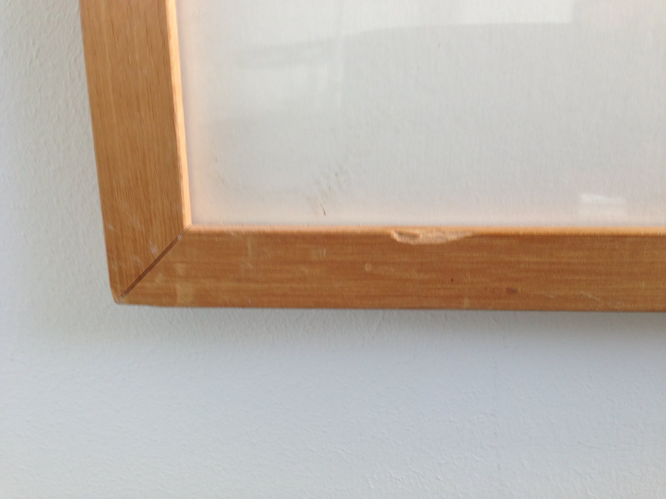 Ingelijst in lijst van blank hout/glas. Het hout van de lijst heeft een klein butsje, zie foto.