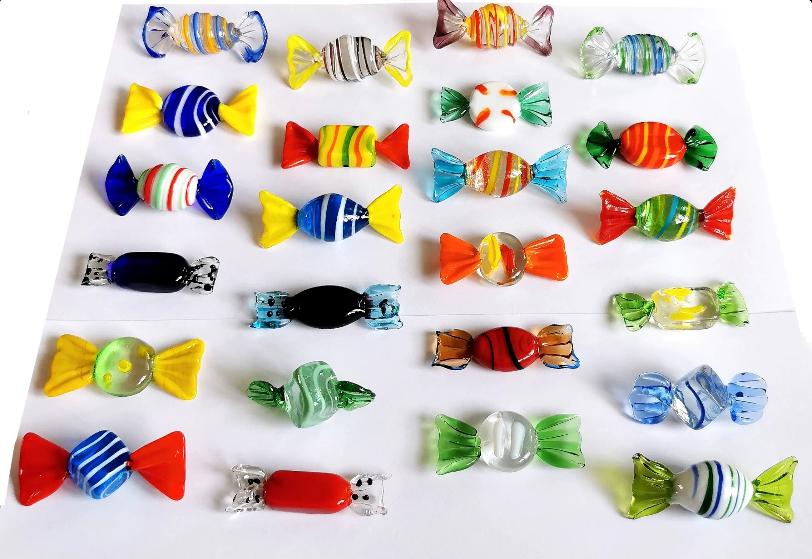 Prachtige verzameling van 24 oude - met de hand geblazen - Murano Glass snoepjes uit Venetië. Elk snoepje is uniek en handgemaakt volgens de oude Muranese technieken. De glazen snoepjes verkeren in goede staat. Het gemiddelde formaat is 5,5 x 2,5 cm. Het item wordt zorgvuldig verpakt en verzonden.