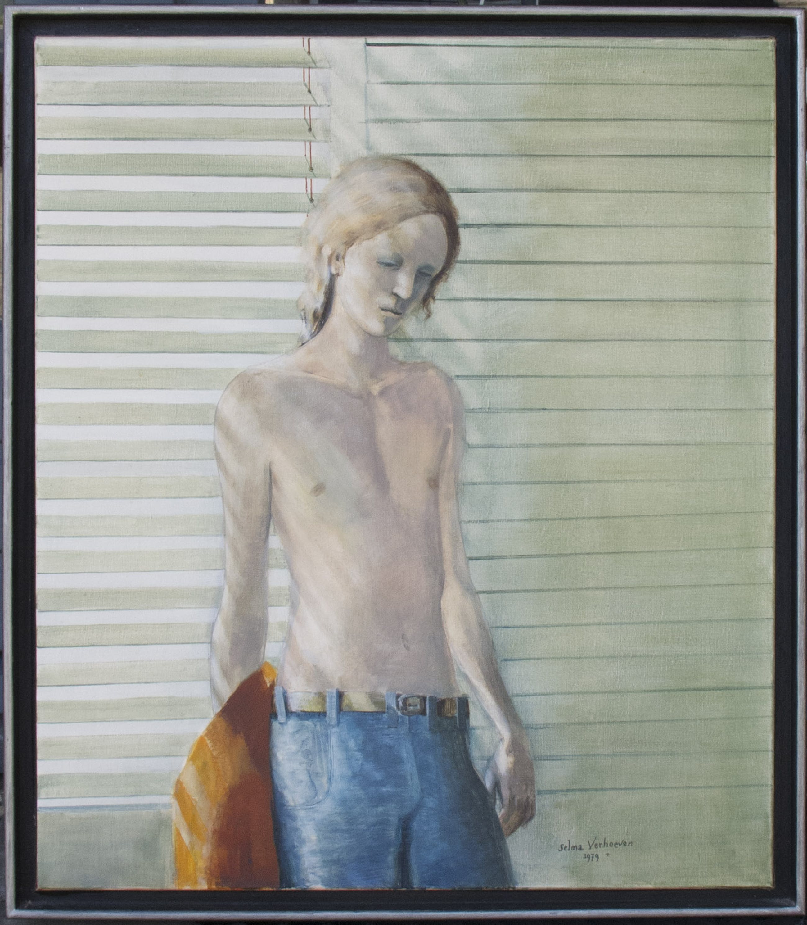 Verstild portret van een jongen, staande voor een zonwering, geschilderd door Selma Verhoeven-Magré (1945). Olieverf op doek, gesigneerd en gedateerd (1979) rechtsonder. In houten baklijst, zwart met zilverachtig front. Alles in zeer goede conditie.