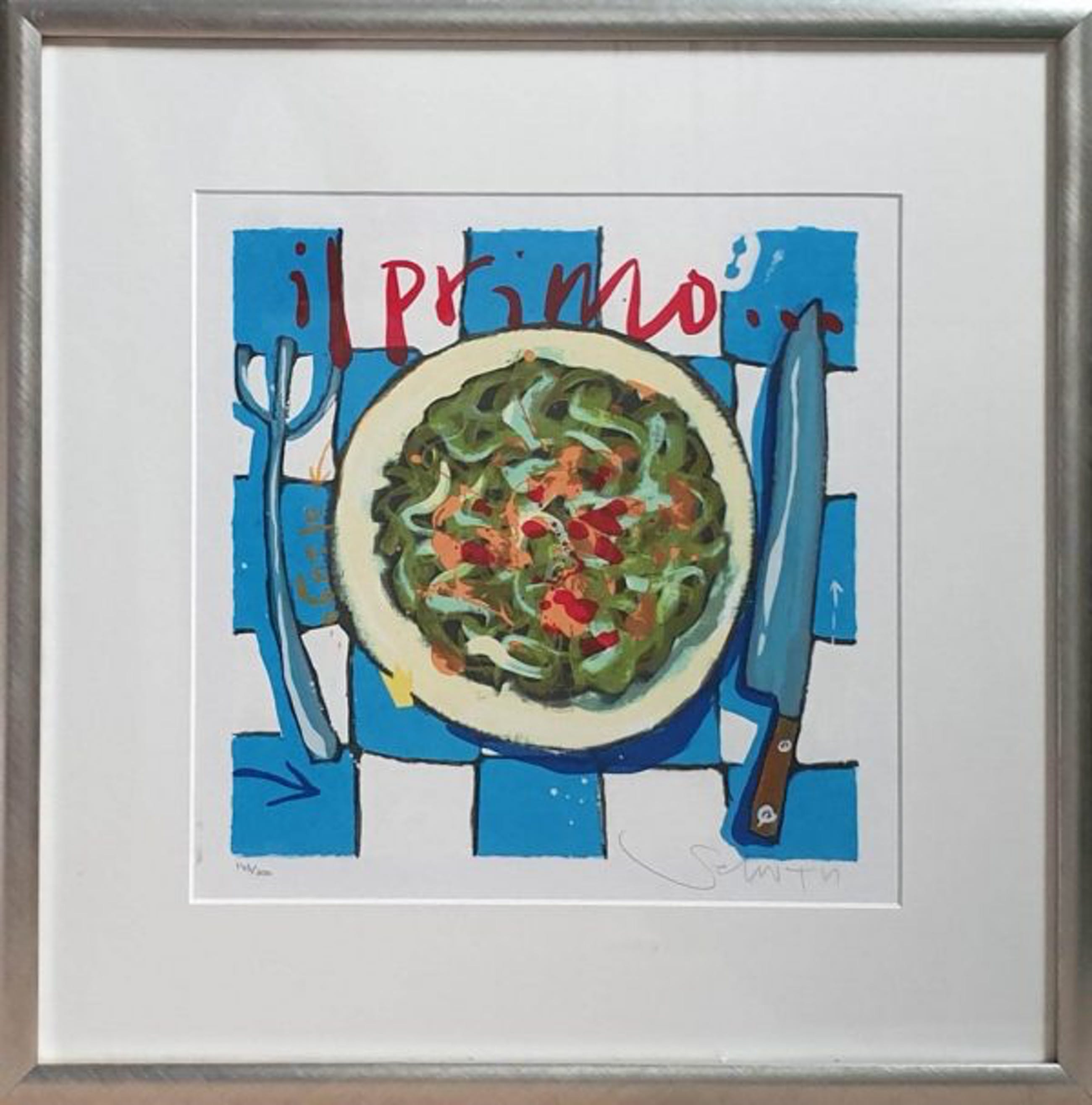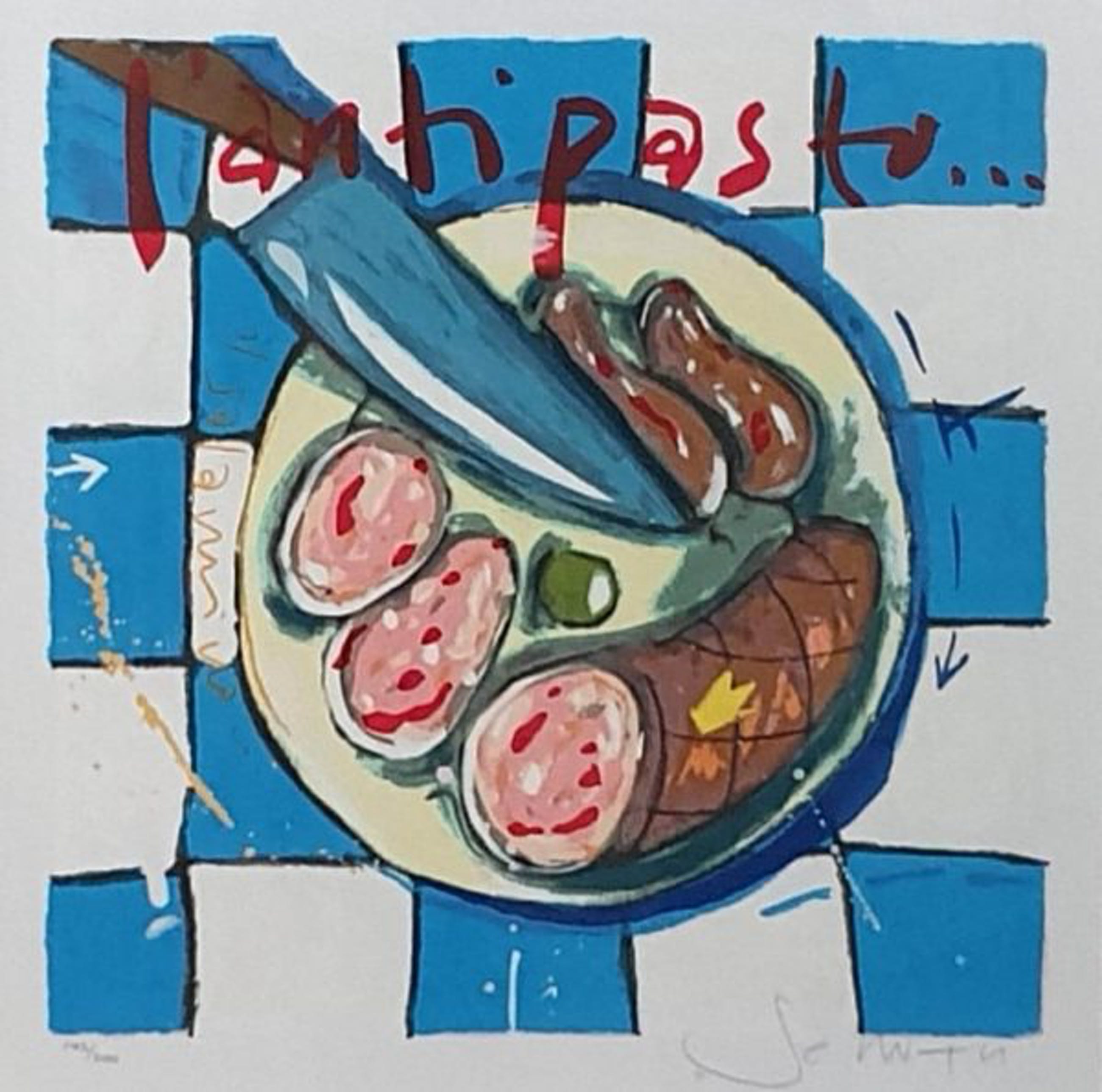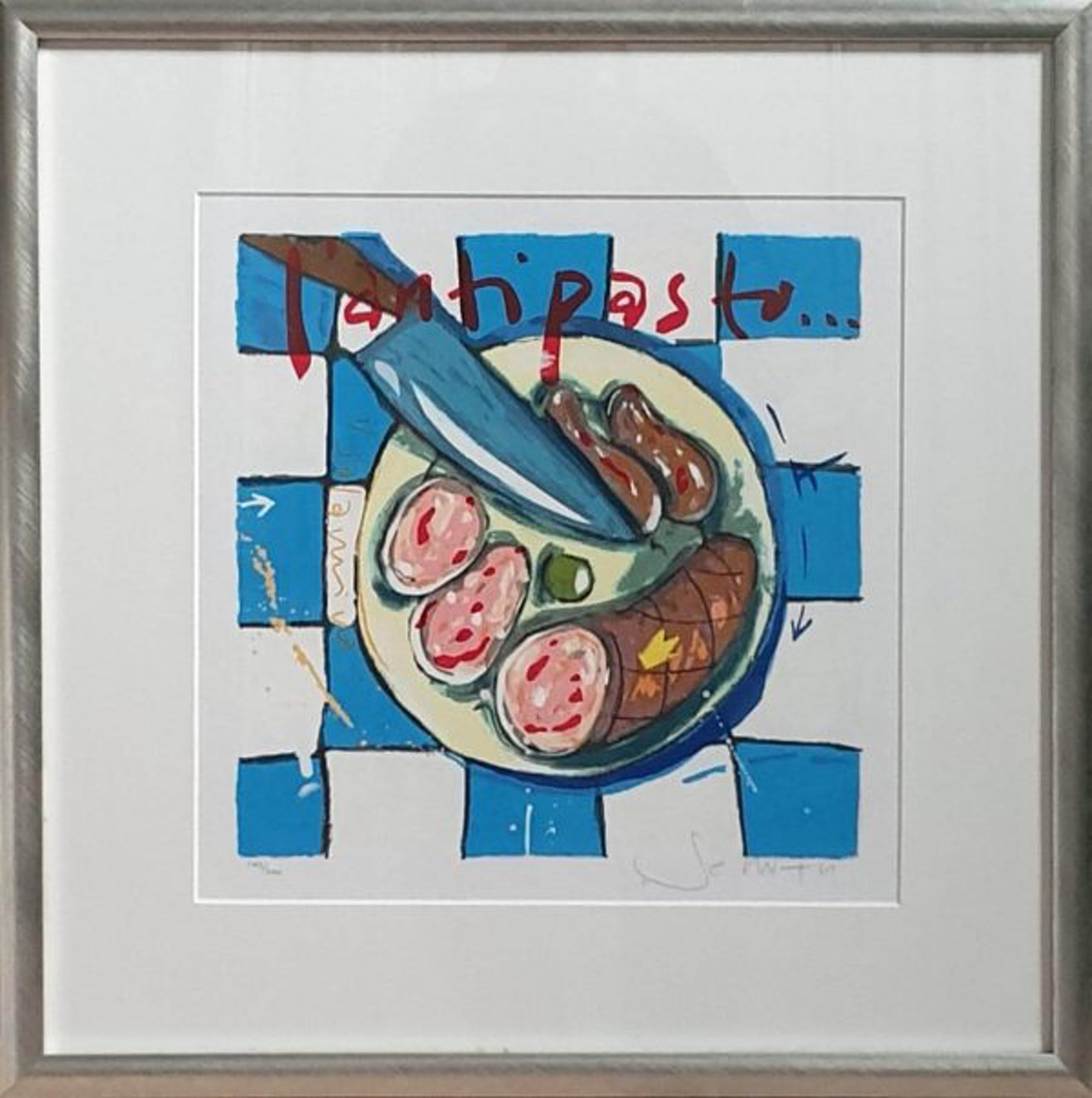 Erg mooie set van 4 bij elkaar horende hand gesigneerde zeefdrukken, voorstellende de gangen van een Italiaanse maaltijd. Allen hebben nummer 143/200.